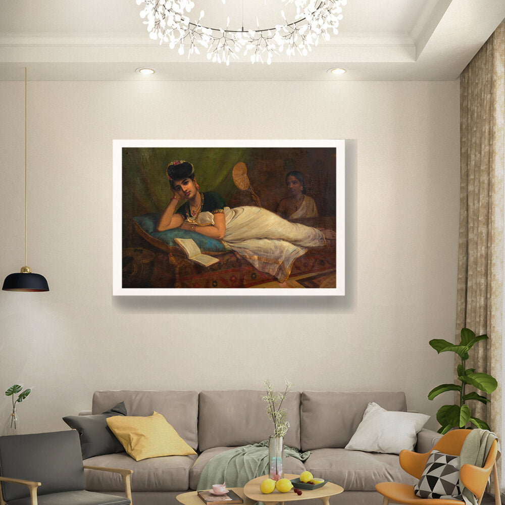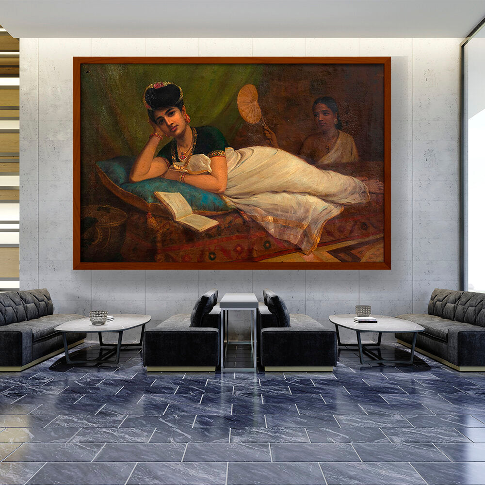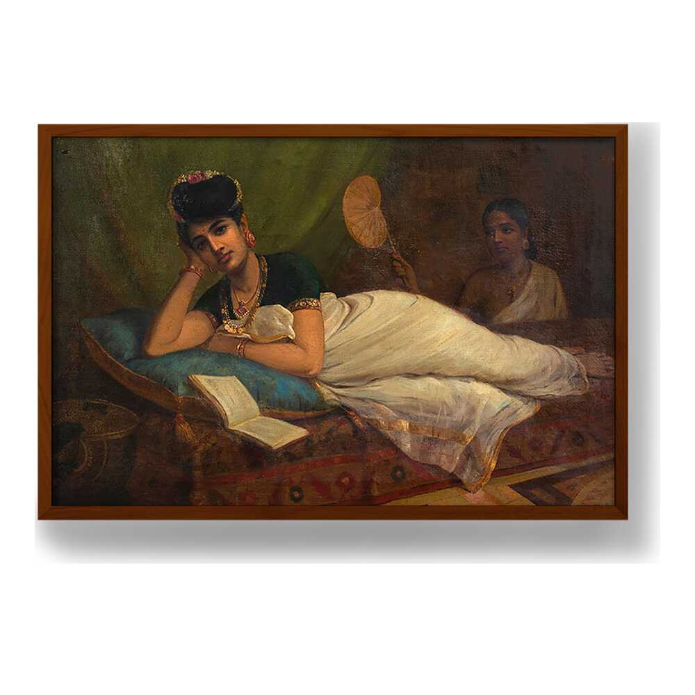 The painting features a recumbent Nair woman, with a book open in front of her while attended by a maid. Varma draw this painting inspired from Edward Manet's 1863 painting Olympia.
