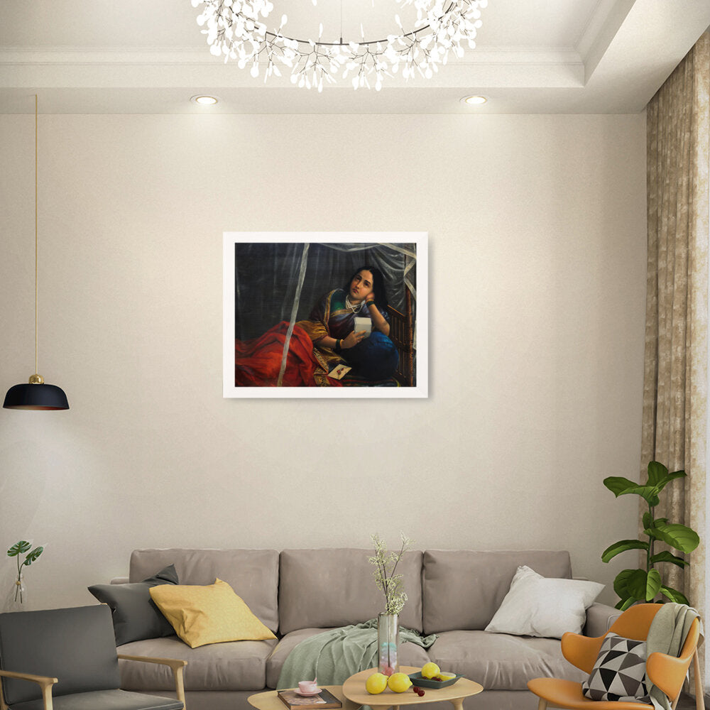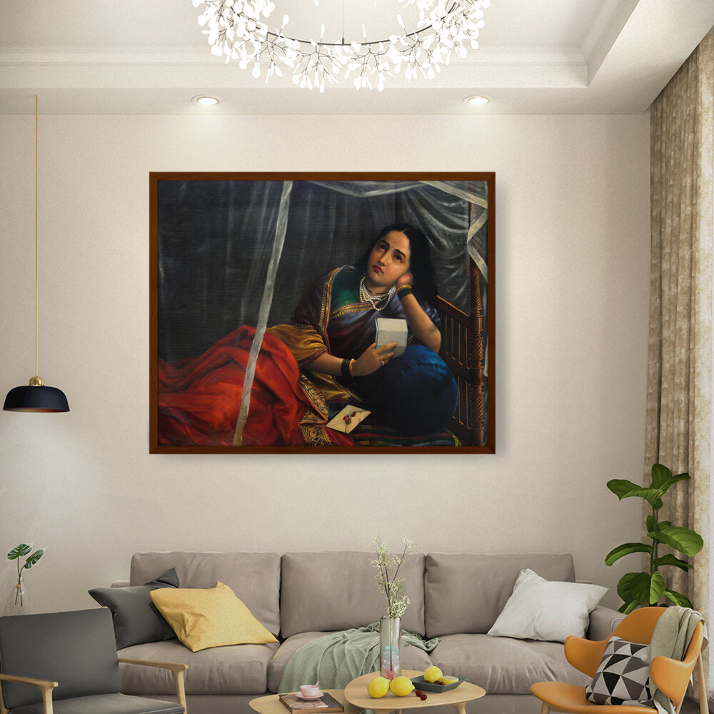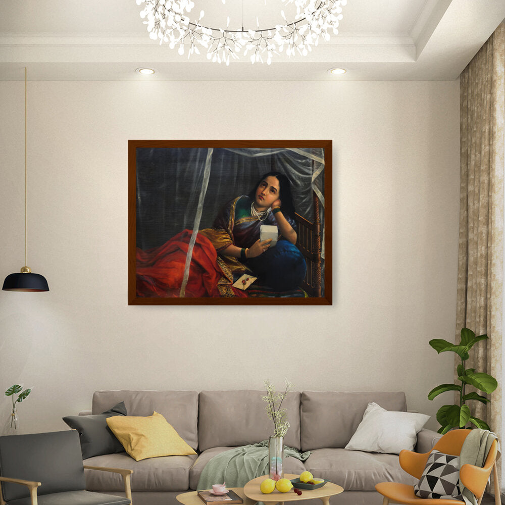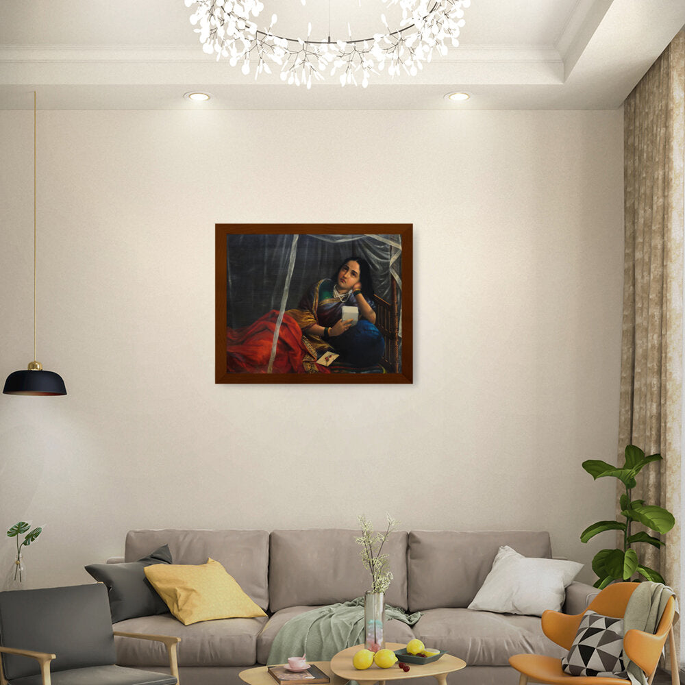The painting shows a woman with a look of sadness, disappointment, or worry, holding a letter or noteƒ??likely the source of the unfortunate news.