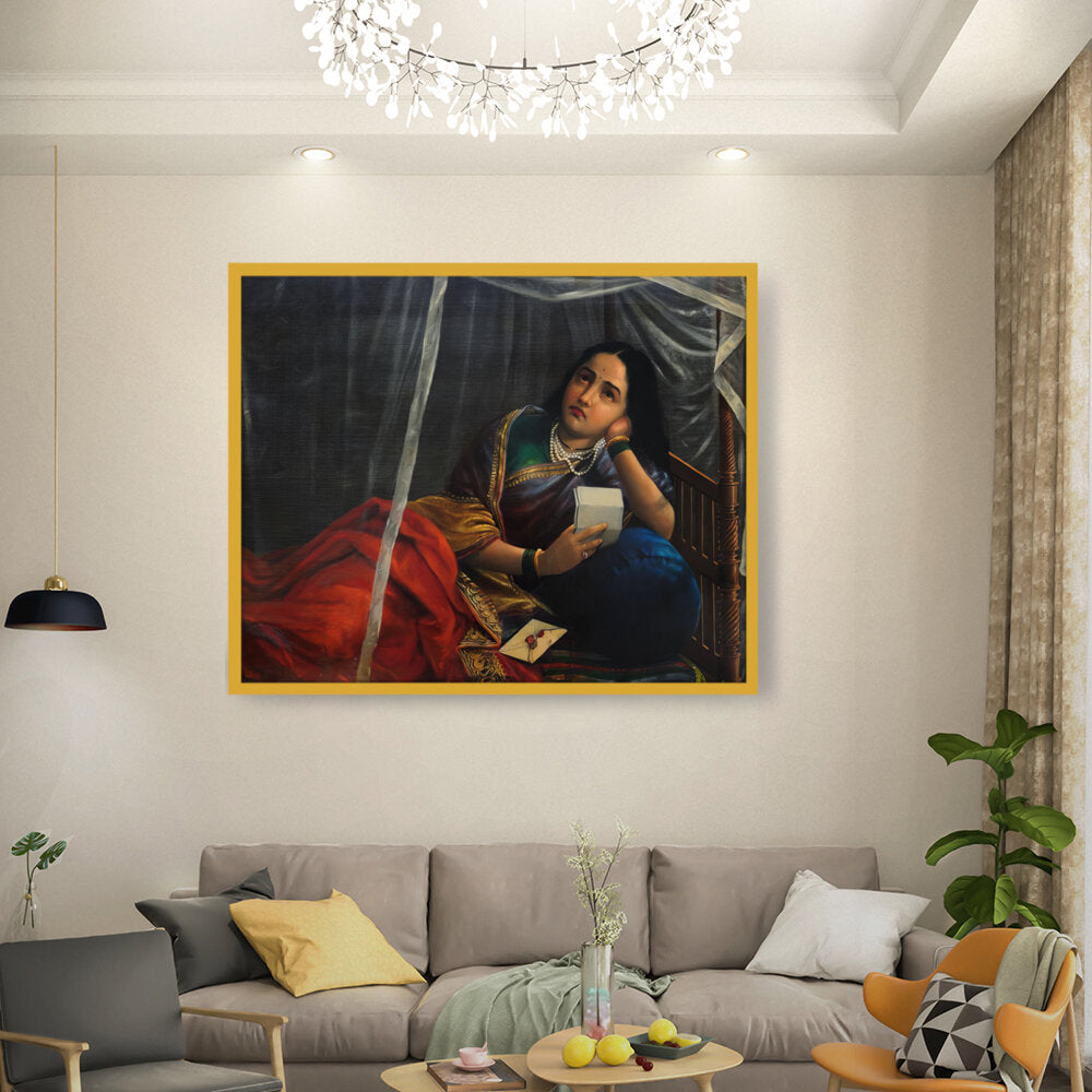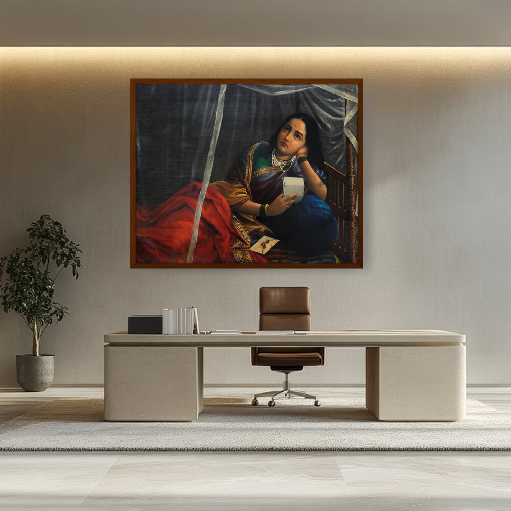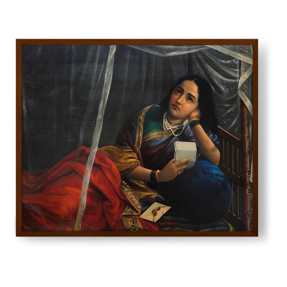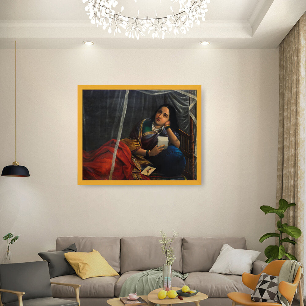 The painting shows a woman with a look of sadness, disappointment, or worry, holding a letter or noteƒ??likely the source of the unfortunate news.