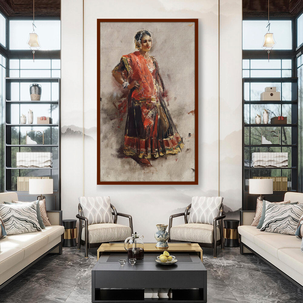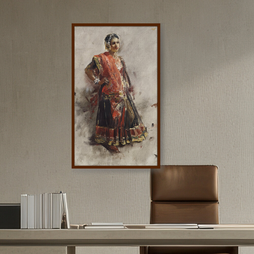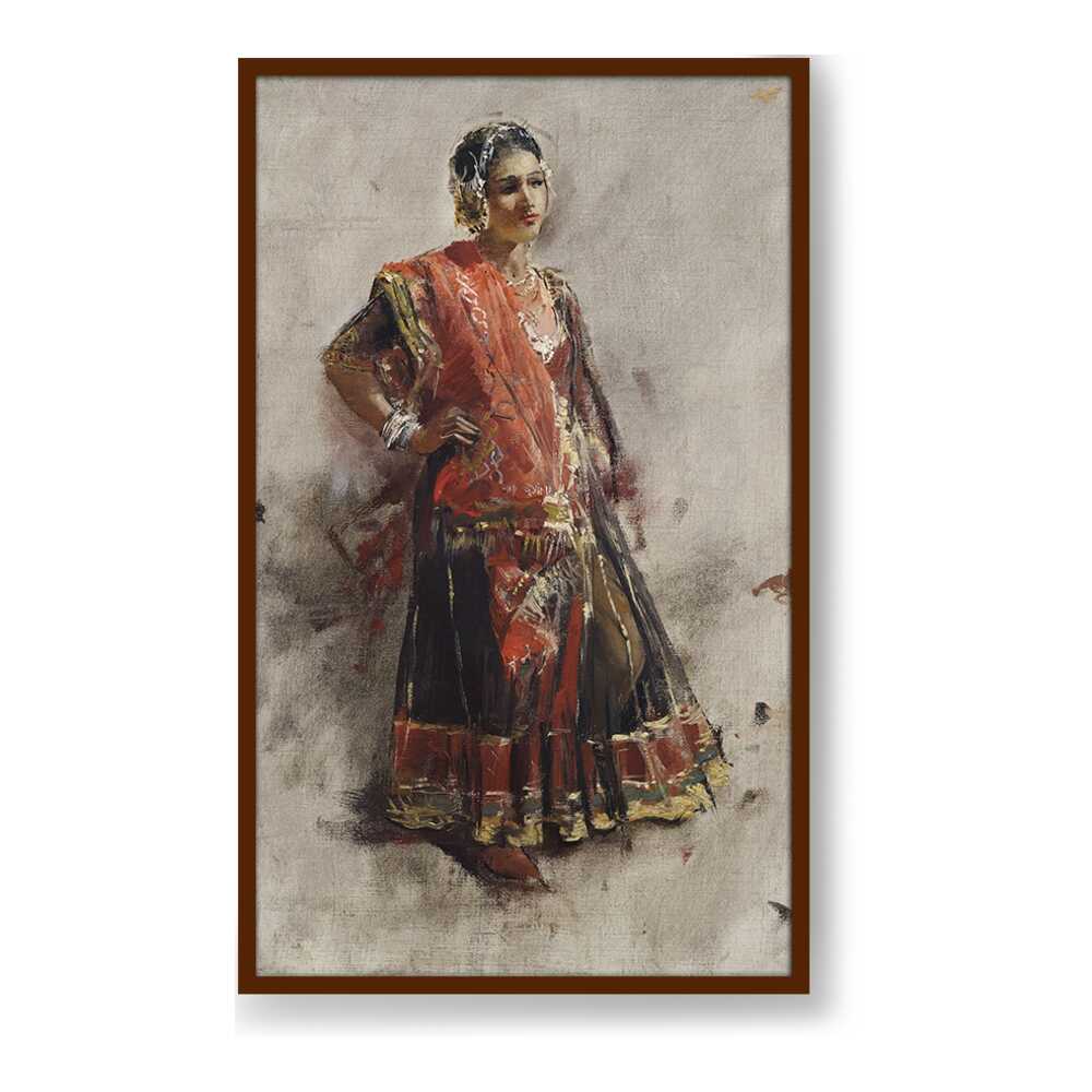 "Indian Dancing Girl" showcases an Indian woman performing a traditional dance. The painting reflects the grace and elegance of Indian classical dance, focusing on the dancer's posture, attire, and expressions.