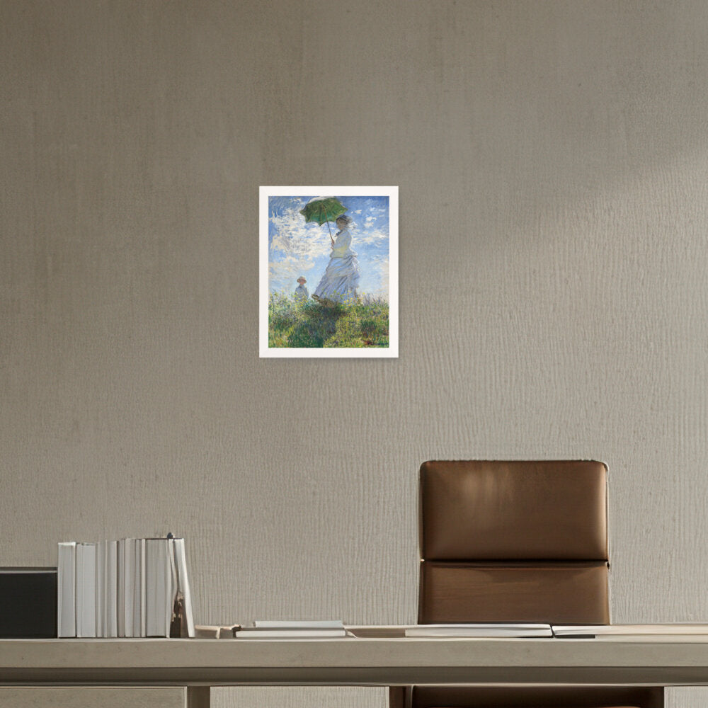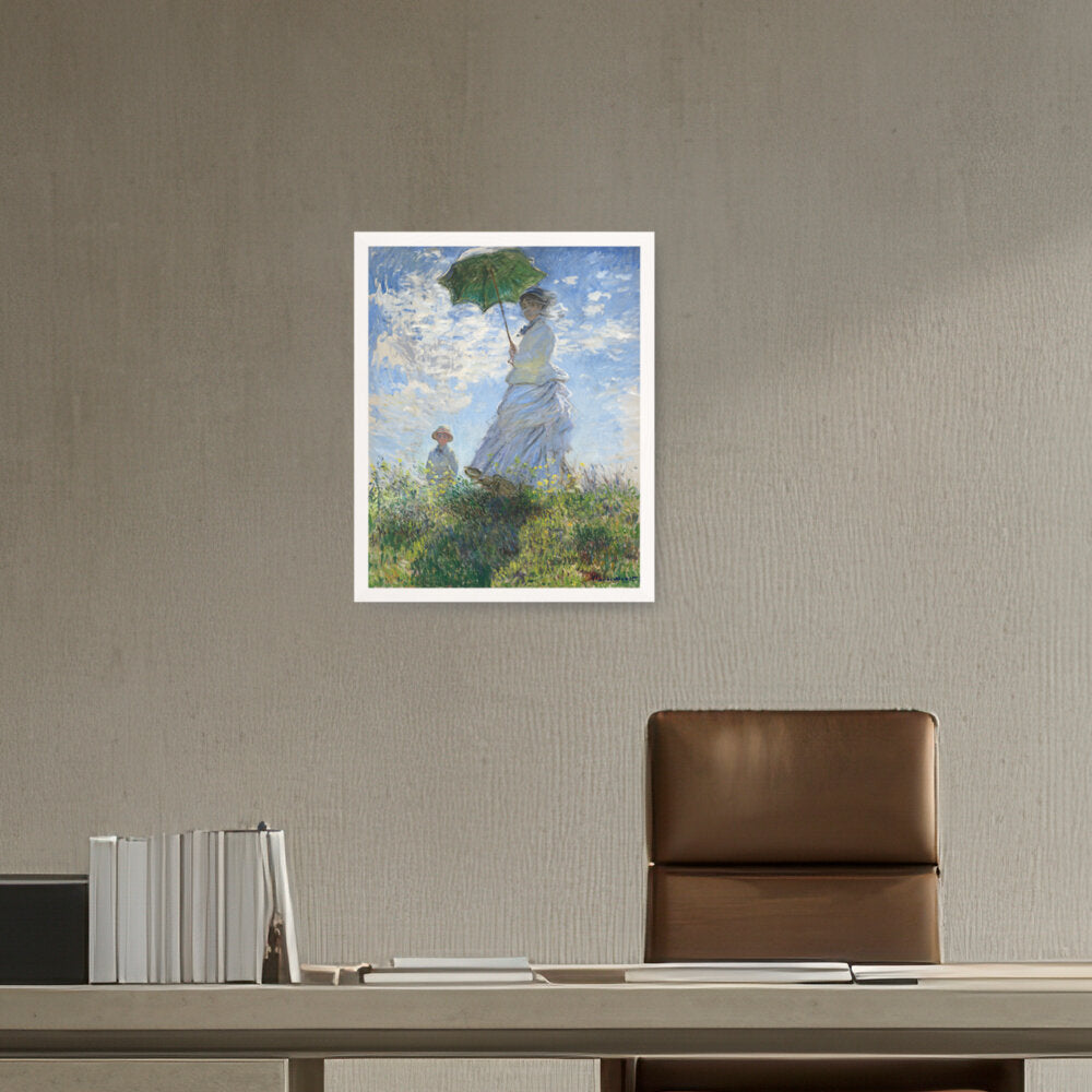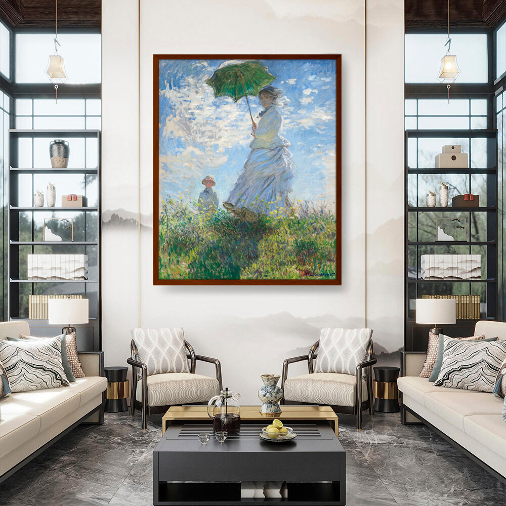 The artwork features Monetƒ??s wife, Camille, and their son, Jean, on a windy summer day. Camille is depicted holding a parasol, which adds a dynamic quality to the composition.