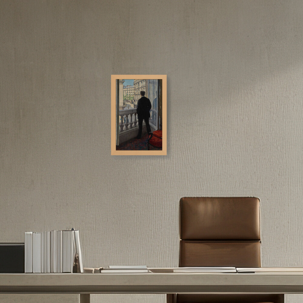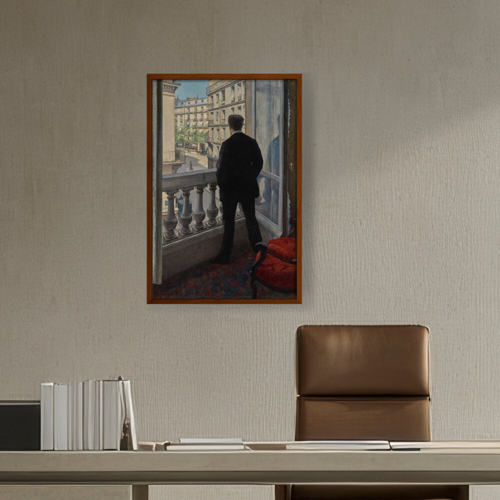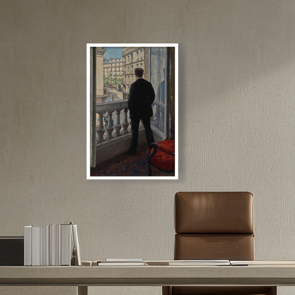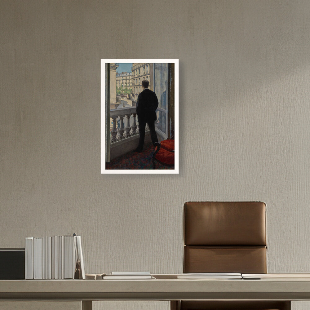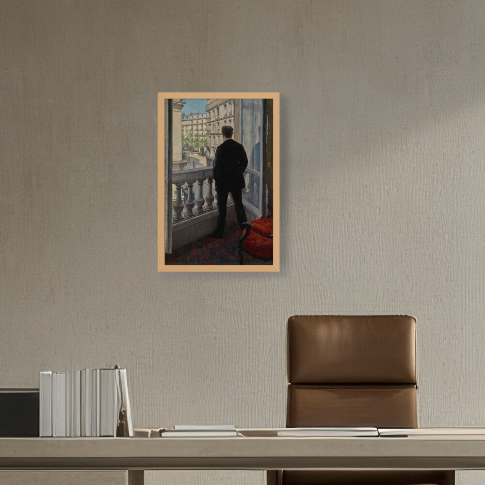 The painting features a young man standing by a window, gazing out into the distance. The positioning...