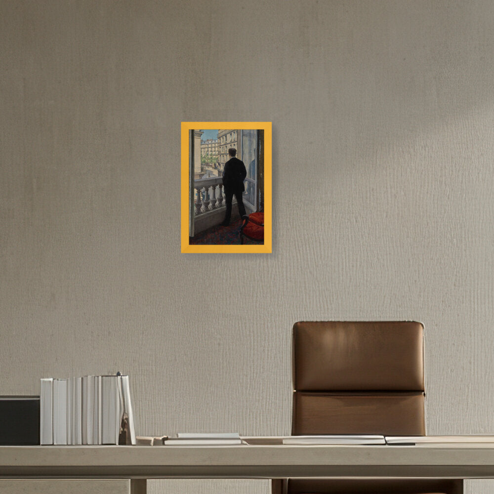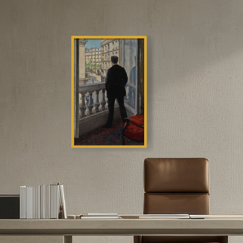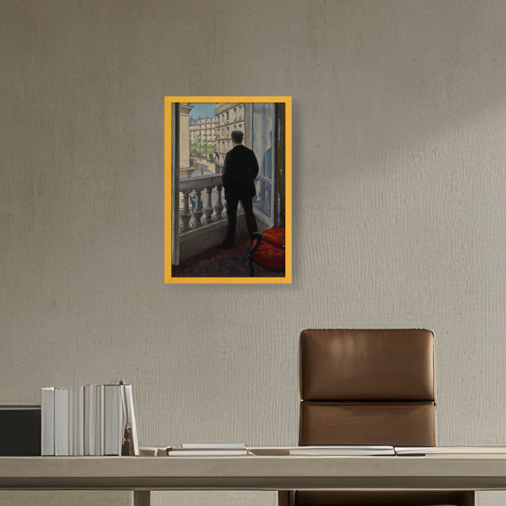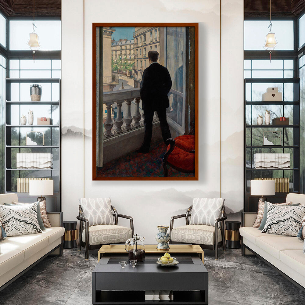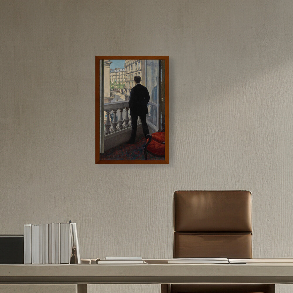 The painting features a young man standing by a window, gazing out into the distance. The positioning creates a sense of contemplation, inviting viewers to wonder what he is observing or thinking.