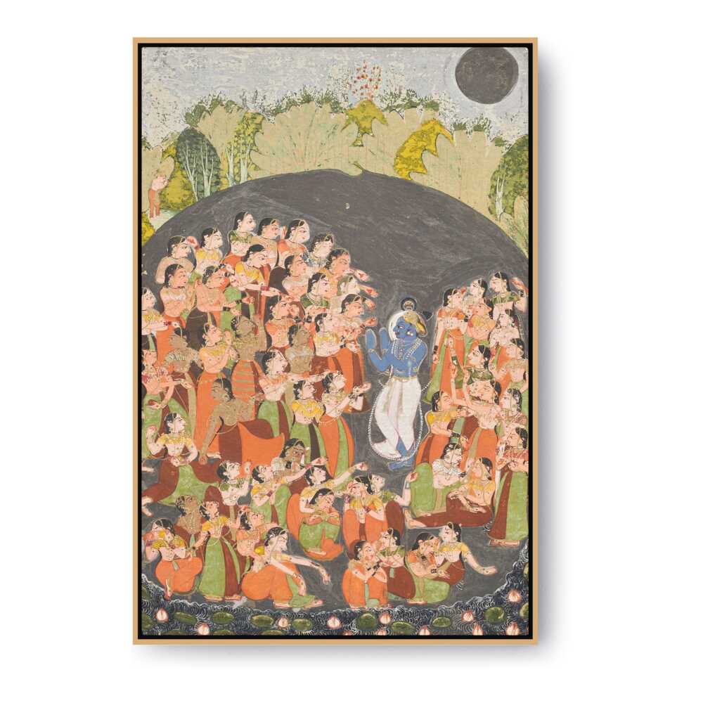 In this artwork, you would typically see Krishna at the center, surrounded by the Gopis, who are often depicted in colorful attire, expressing their adoration and joy. The setting is usually lively, filled with natural beauty‰ÛÓflowers, trees, and sometimes a flowing river‰ÛÓenhancing the festive atmosphere.
