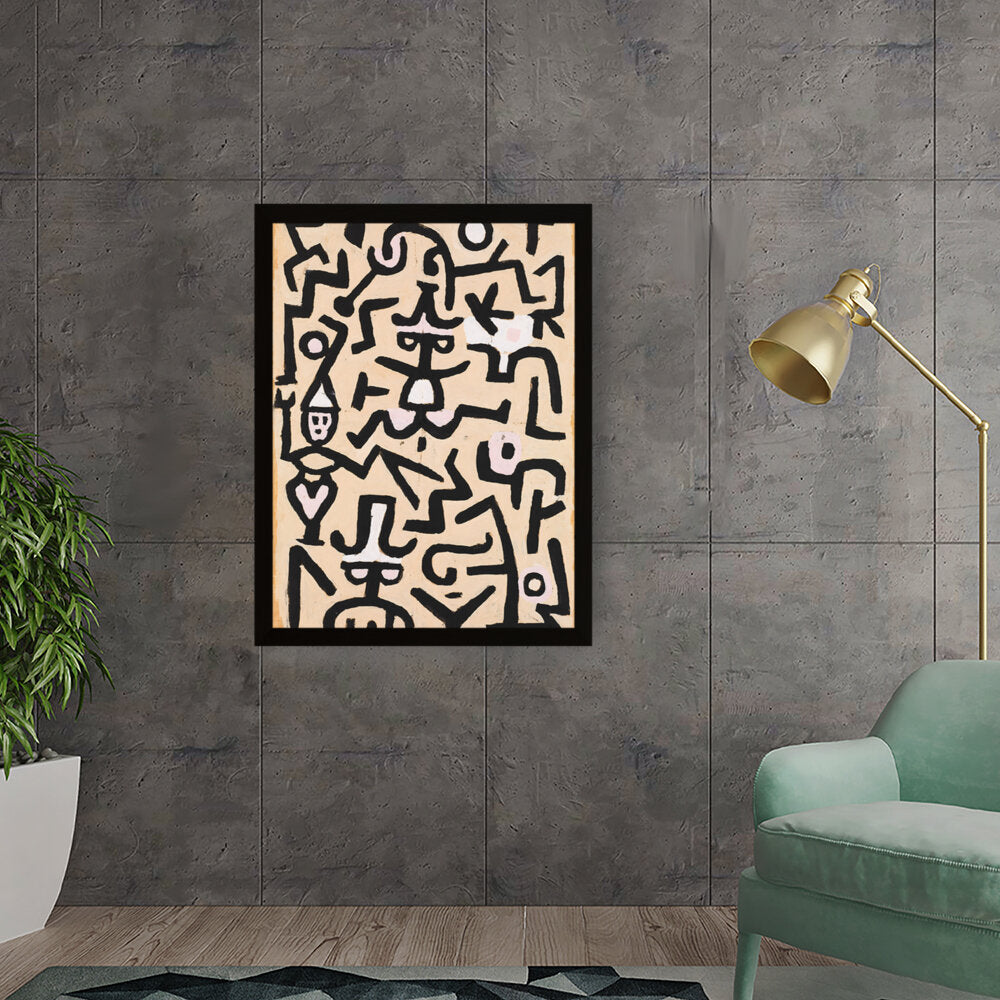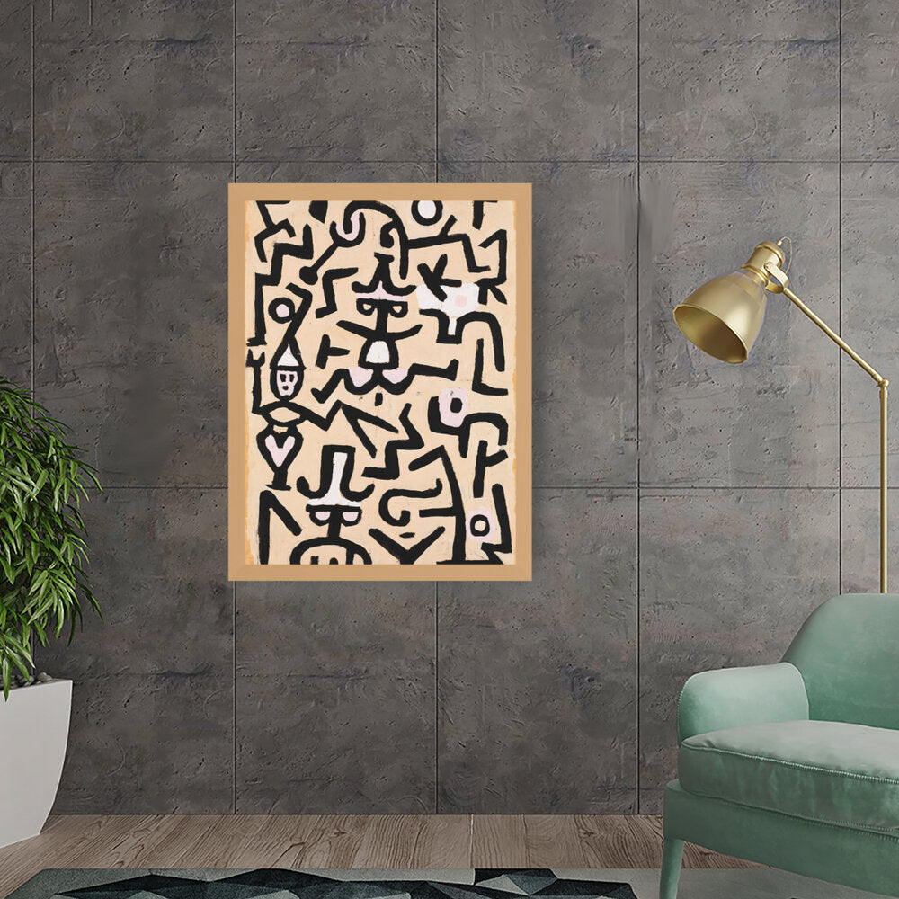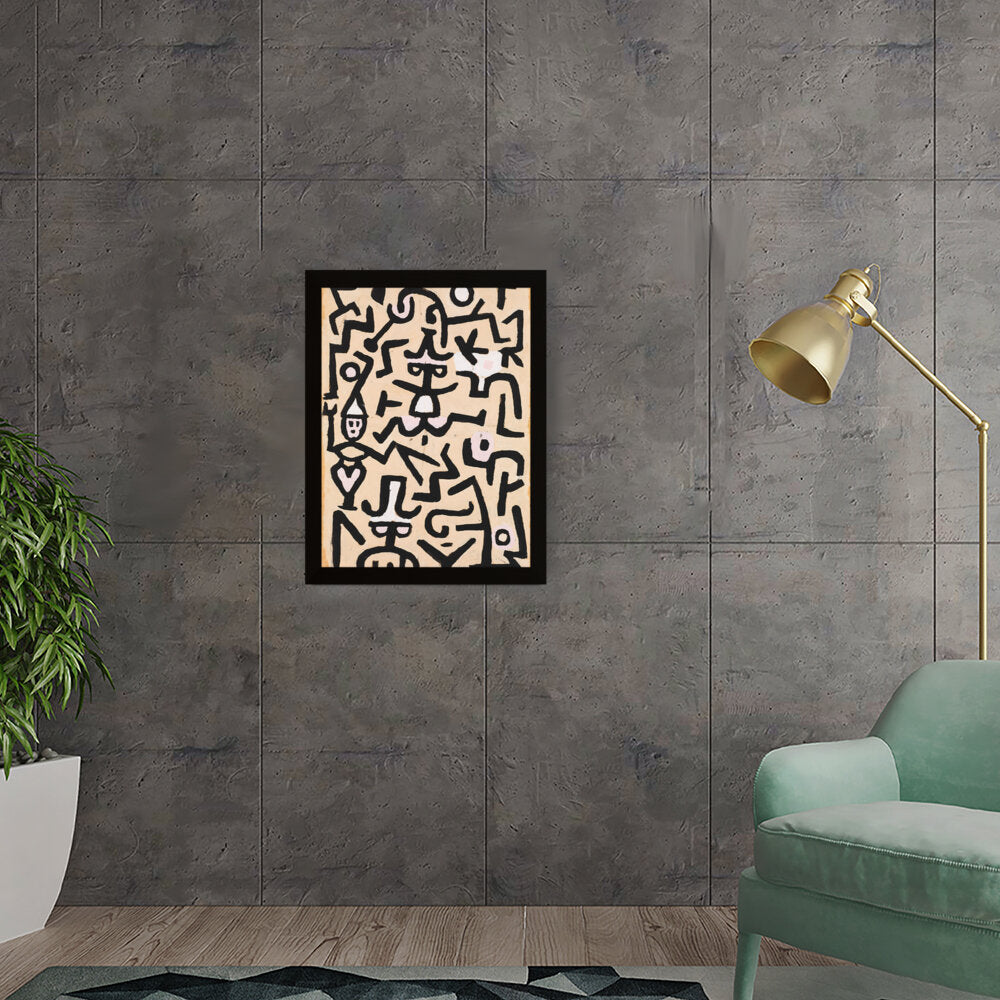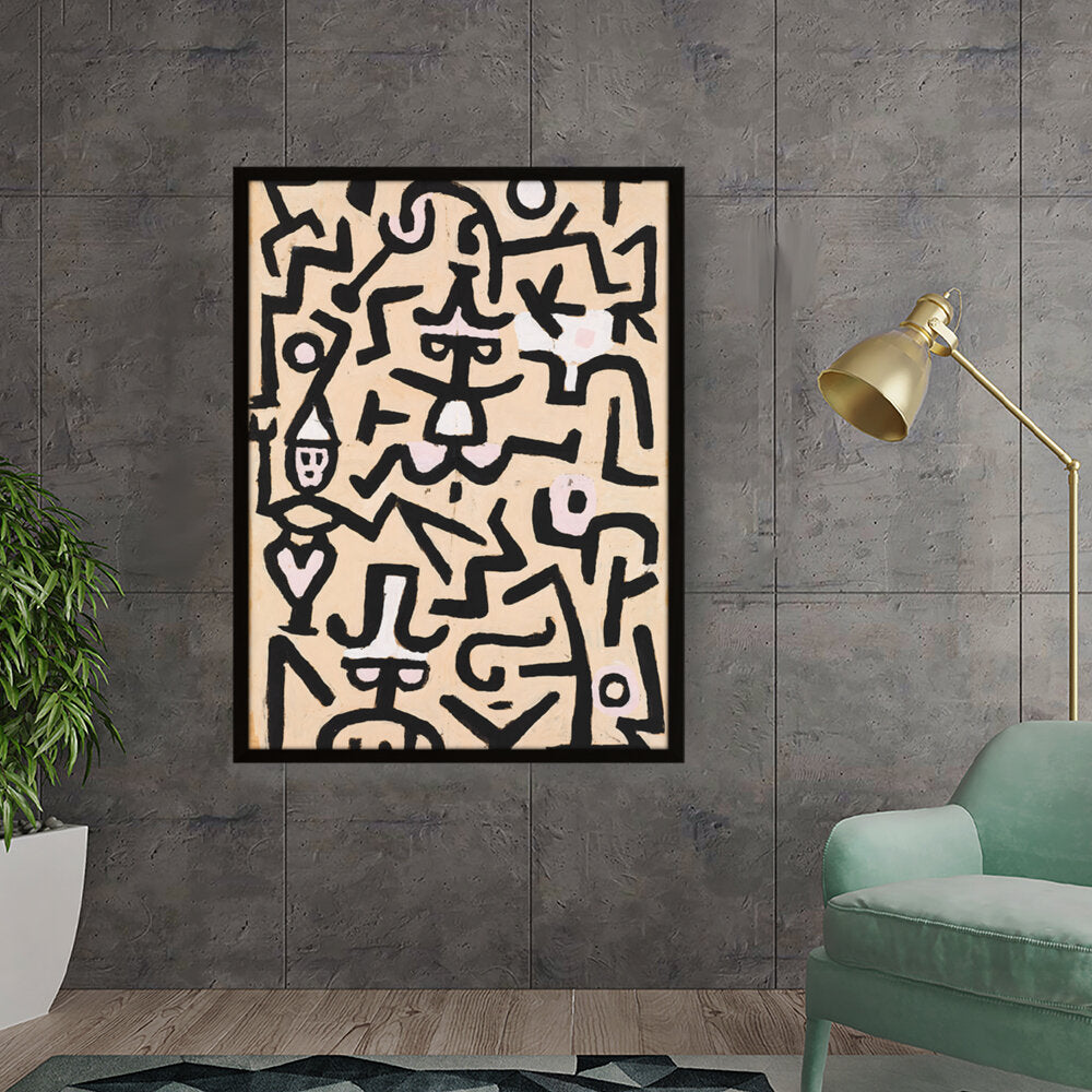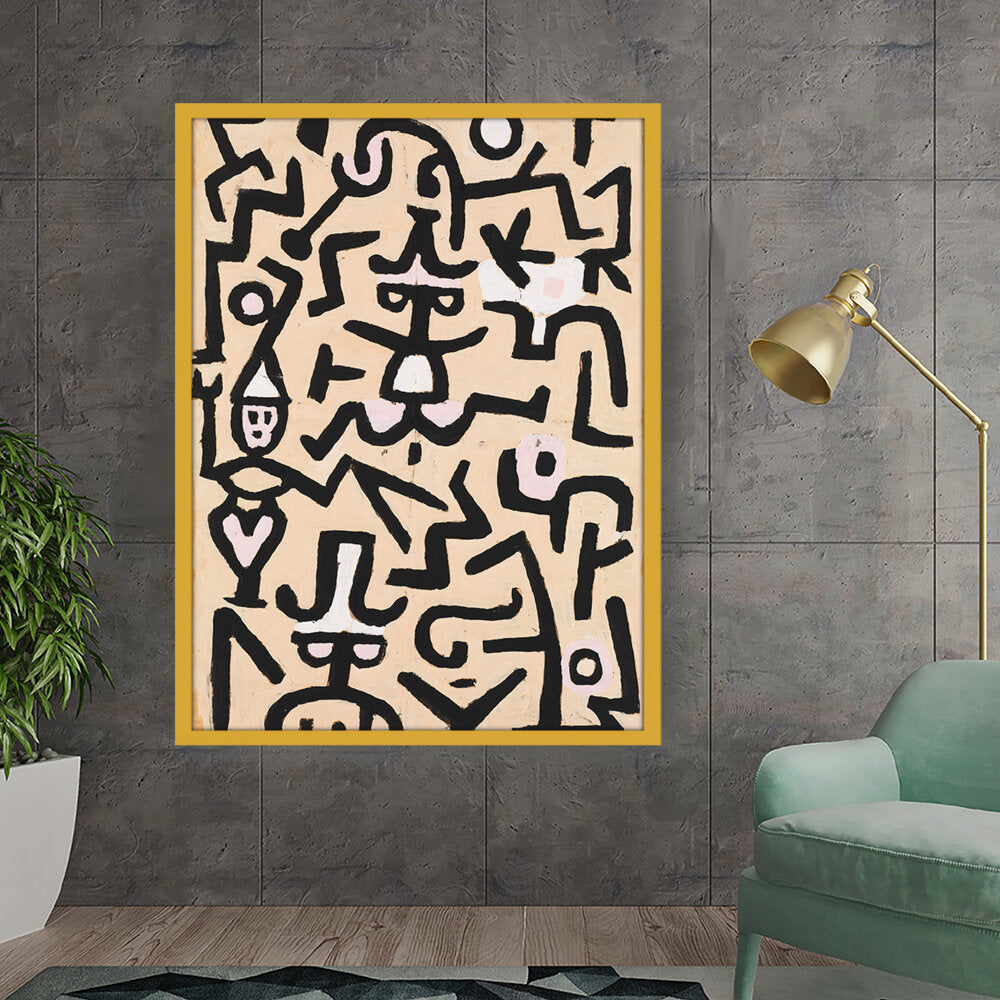 This vibrant abstract painting features a dynamic interplay of shapes and colors. The bold black lines against a warm background evoke a sense of movement and energy, making it a striking addition to any contemporary space.