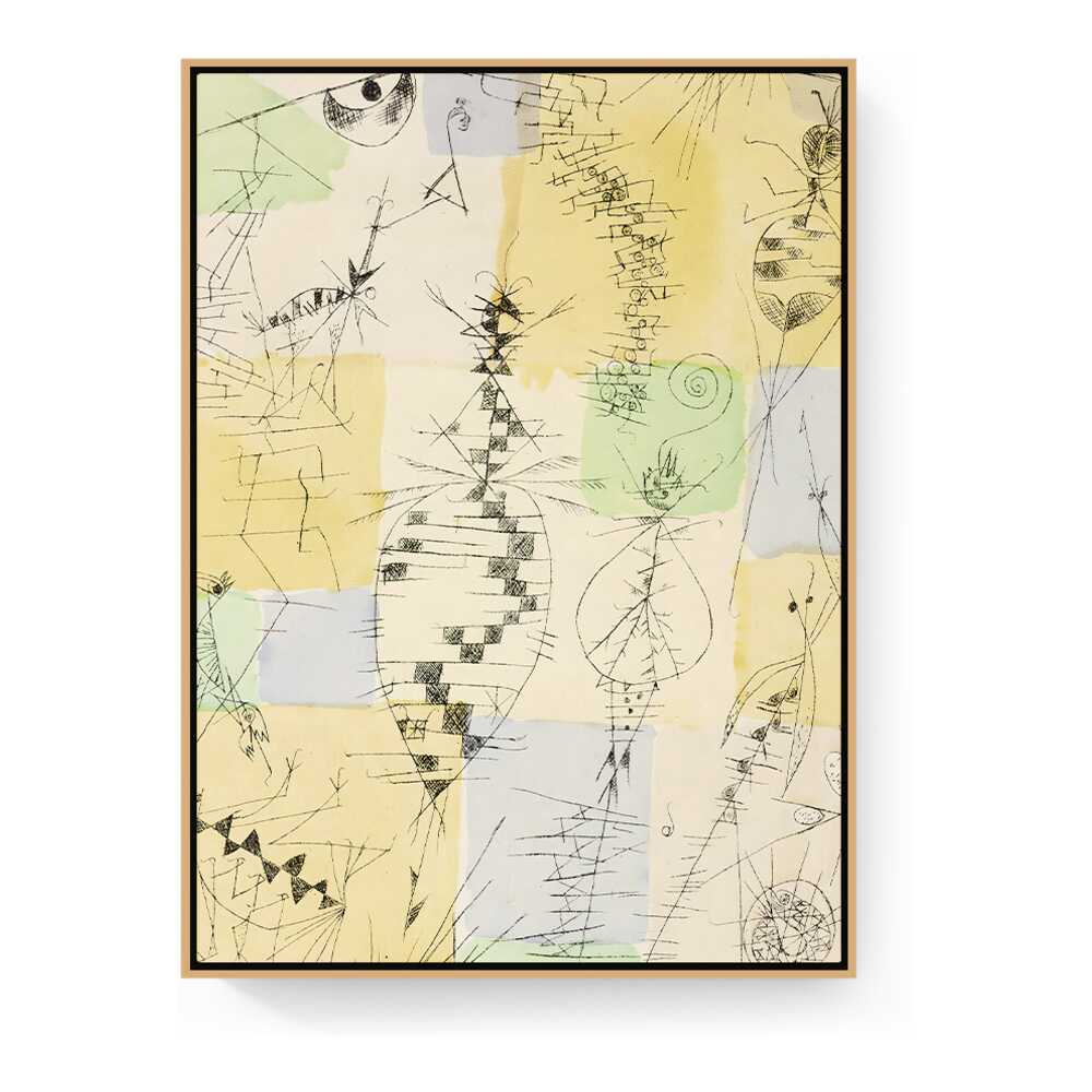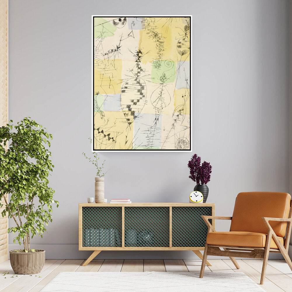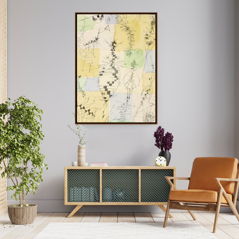 This artwork vividly combines abstract forms and playful colors, exploring the interplay between organic shapes and structured lines. It invites viewers to interpret nature's essence through a modern artistic lens, perfect for a creative space.