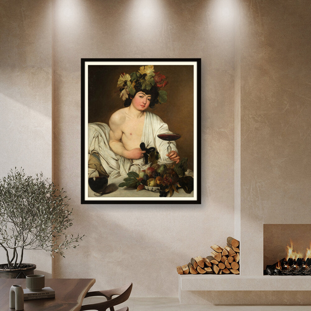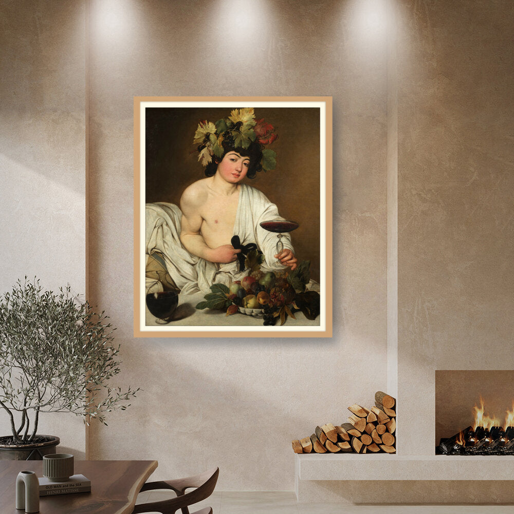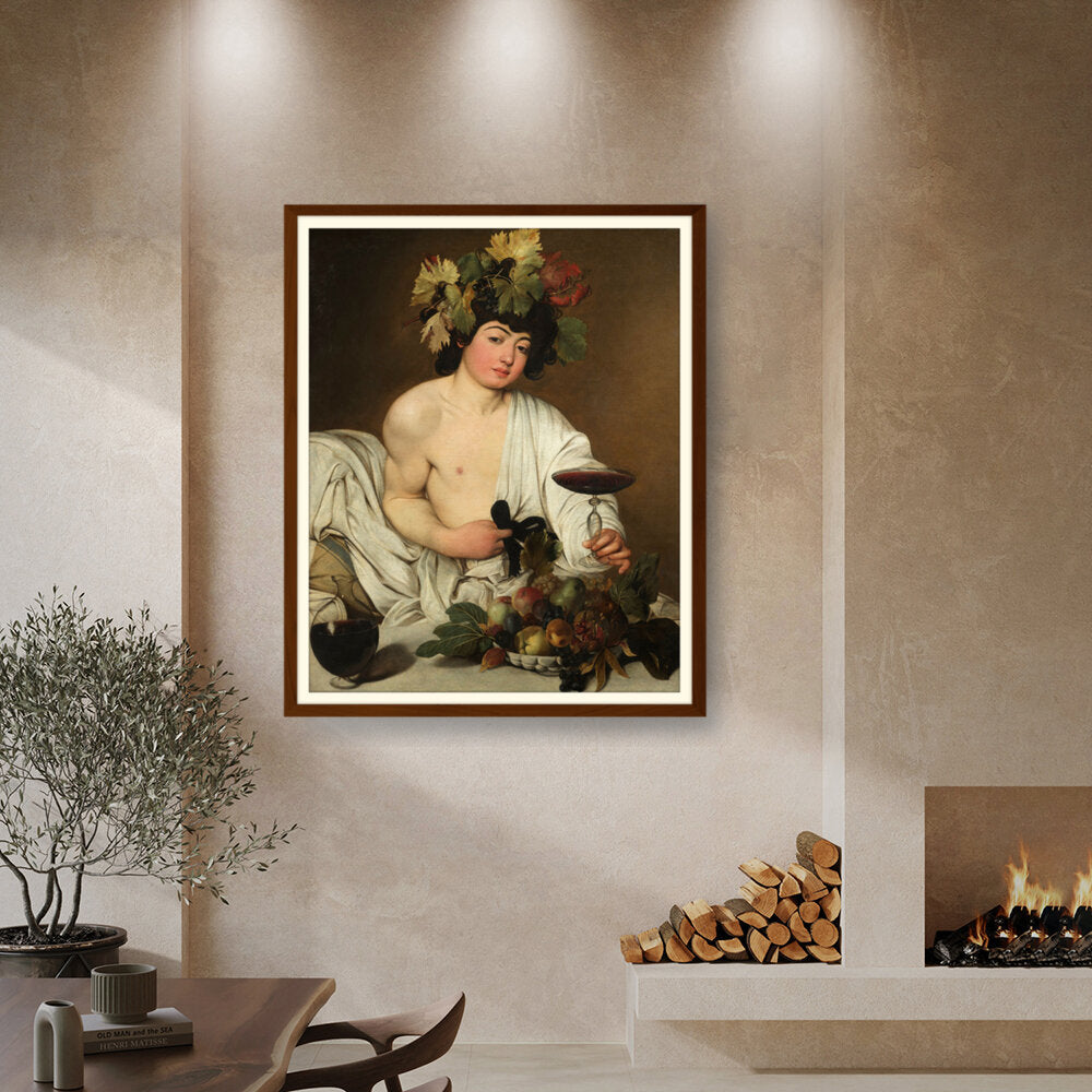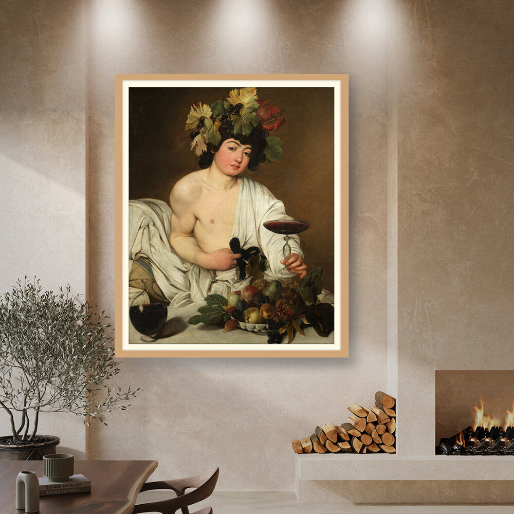 This classic painting of Bacchus captures the essence of indulgence and celebration through its rich colors and detailed textures. The depiction of fruits and wine highlights the theme of abundance and festivity, making it a vibrant addition to any social space.