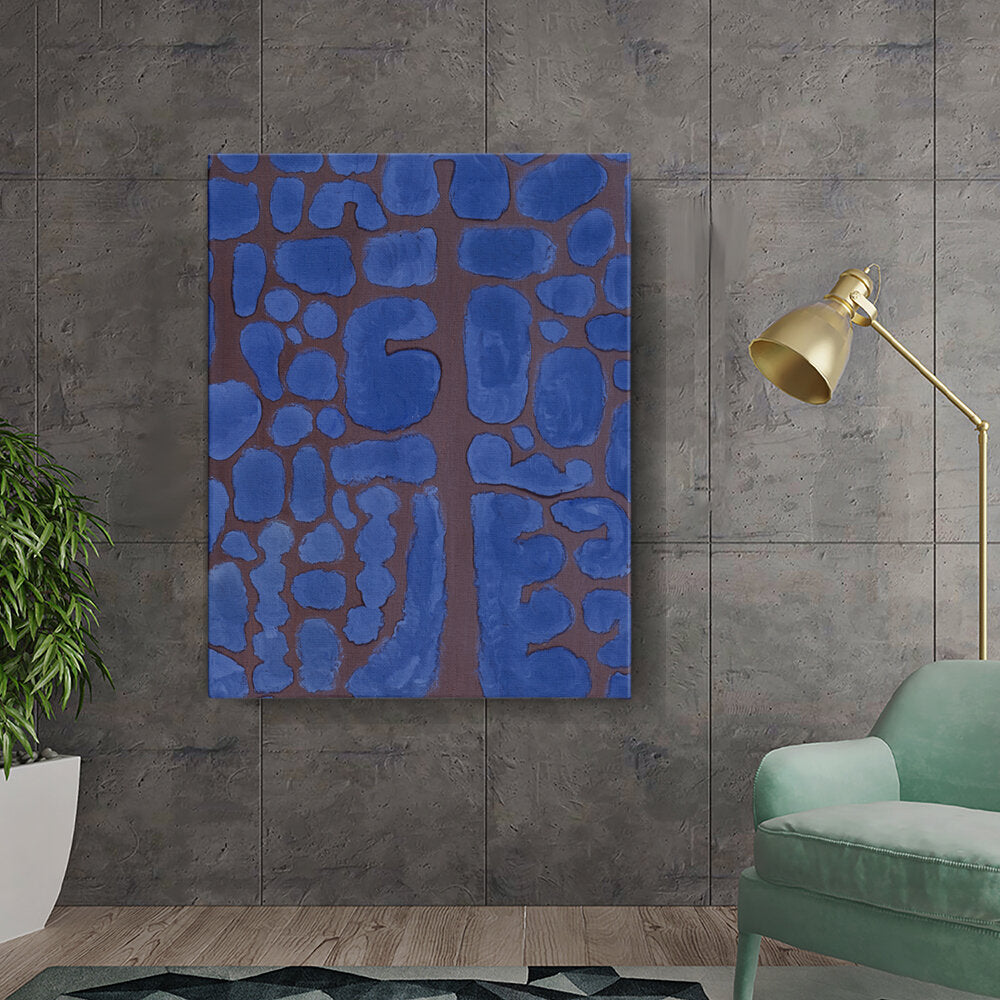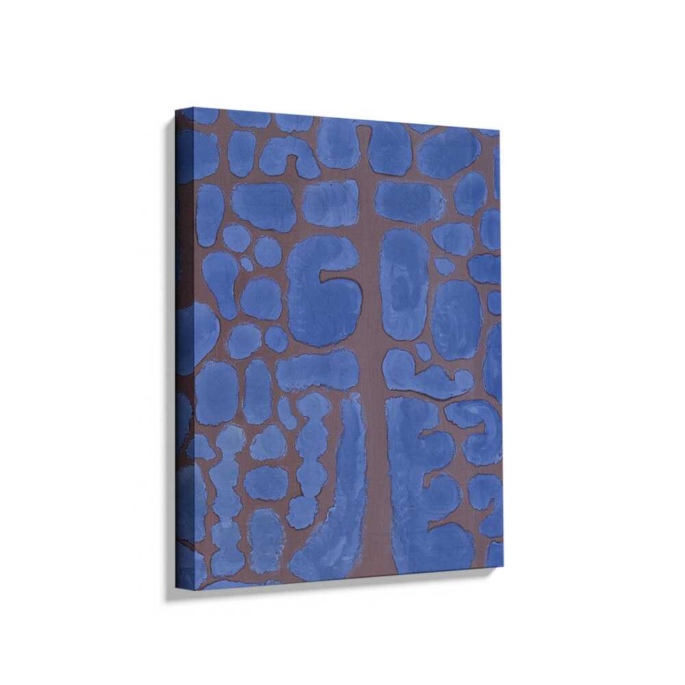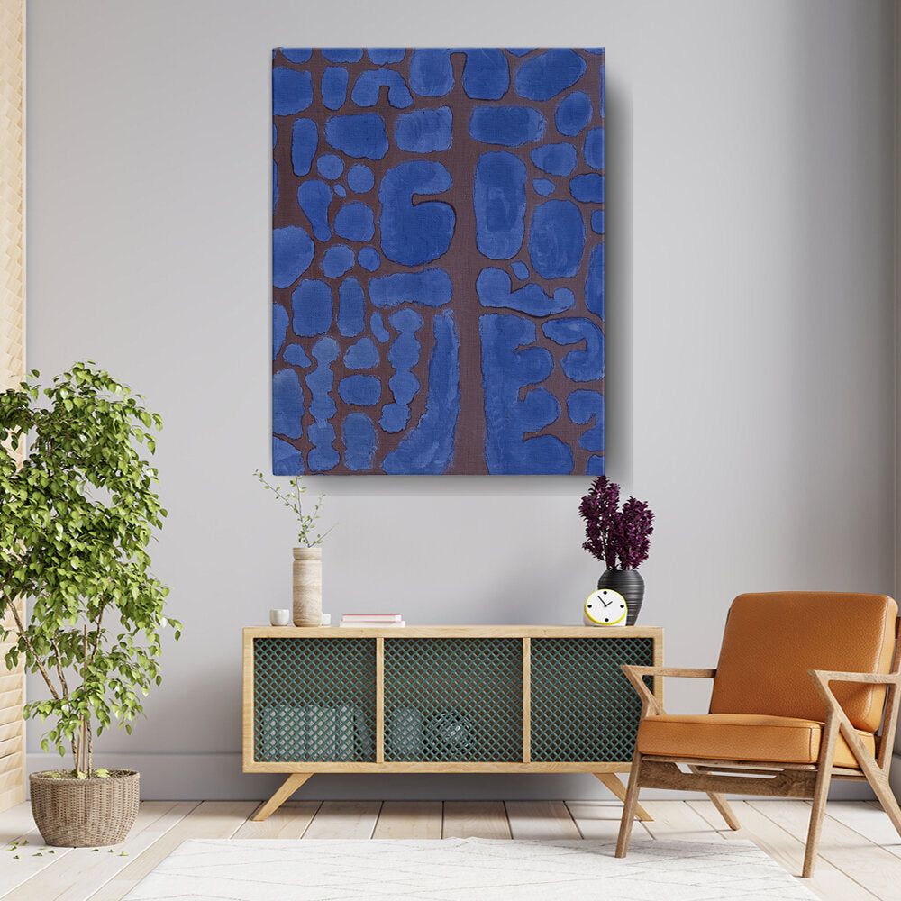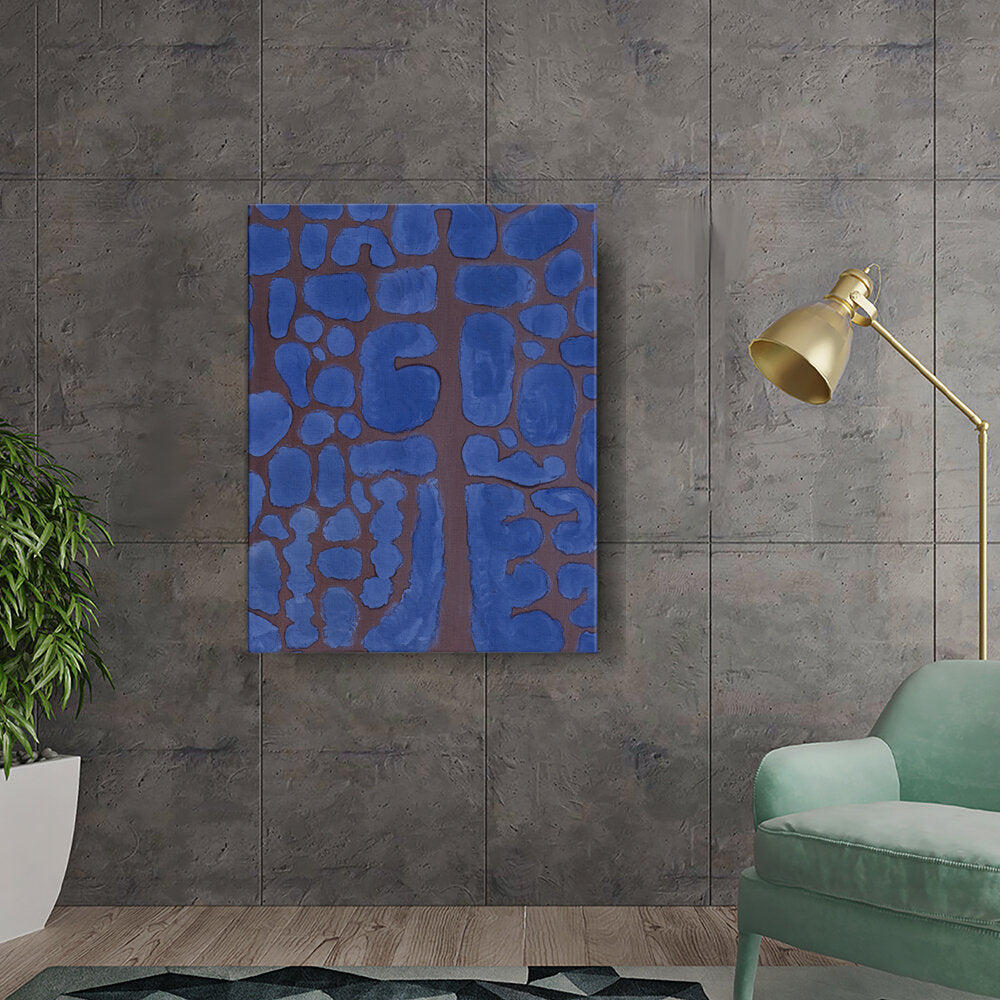 This artwork features a series of soft, irregular blue shapes set against a warm brown background. The interplay of colors creates a dynamic yet calming visual experience, ideal for contemporary spaces. Perfect for adding a modern touch to any living area.