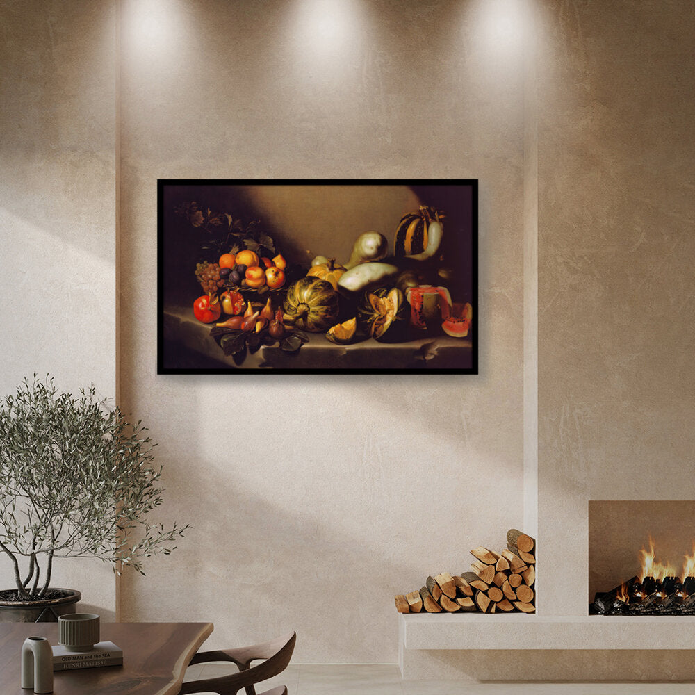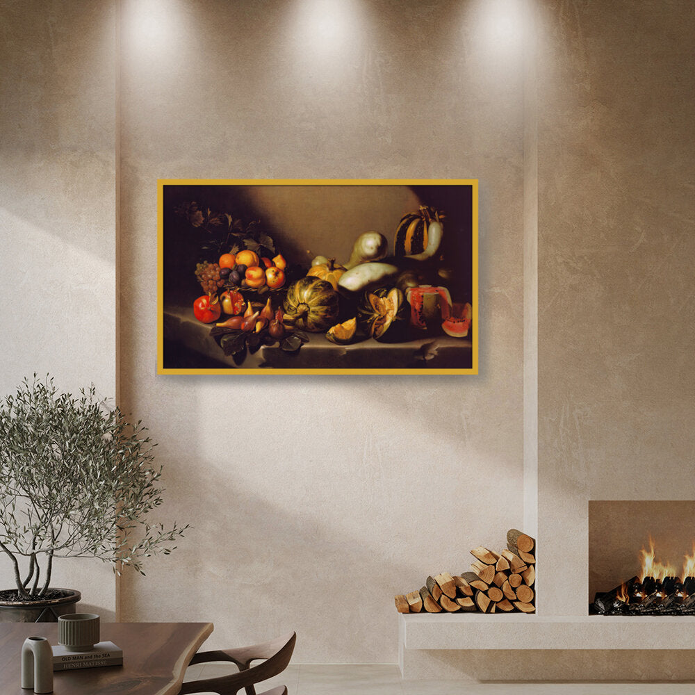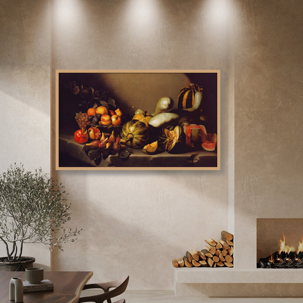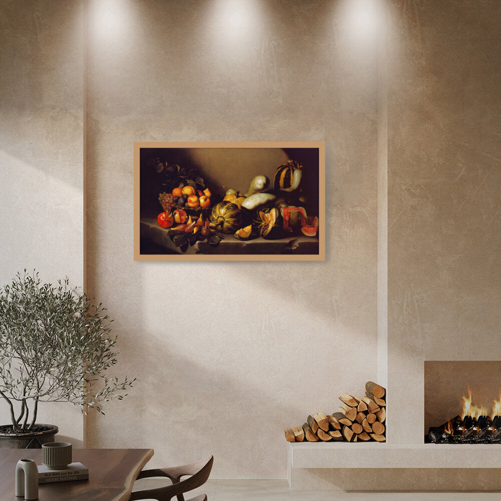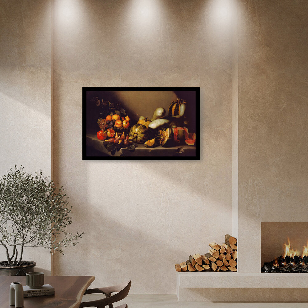 This exquisite still life captures the beauty of nature's bounty through a detailed arrangement of various fruits and vegetables. The vibrant colors and intricate textures invite viewers to appreciate the richness of the harvest. Ideal for enhancing any dining space with a touch of elegance.