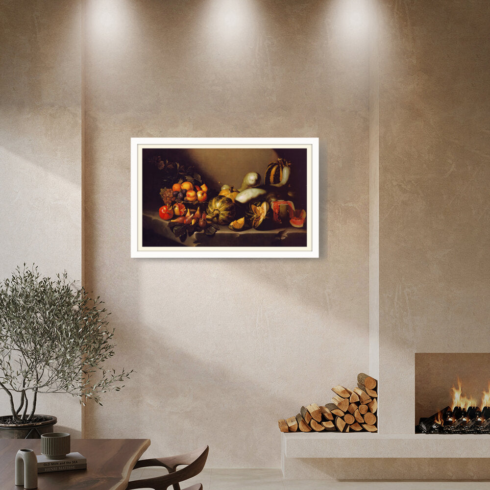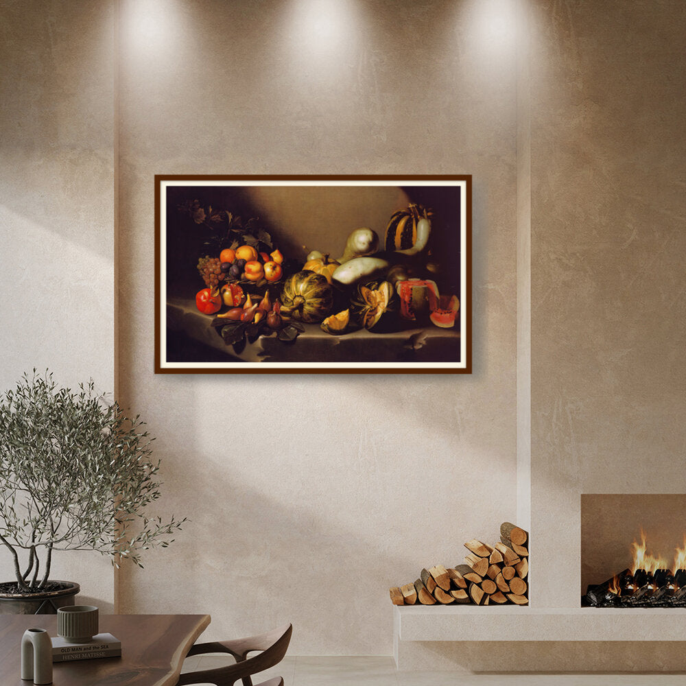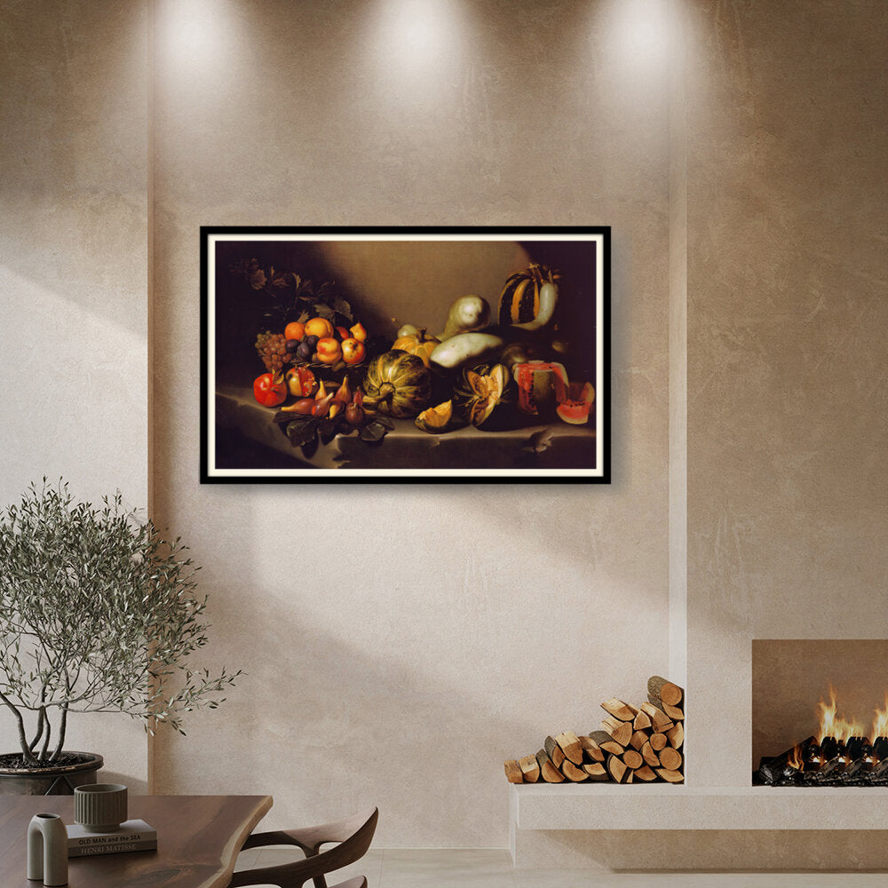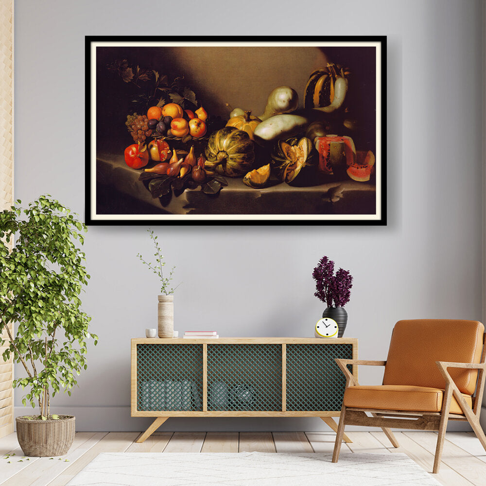 This exquisite still life captures the beauty of nature's bounty through a detailed arrangement of various fruits and vegetables. The vibrant colors and intricate textures invite viewers to appreciate the richness of the harvest. Ideal for enhancing any dining space with a touch of elegance.