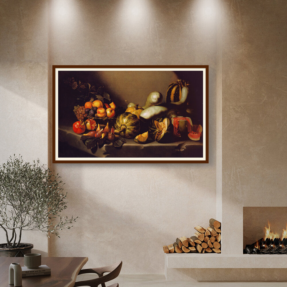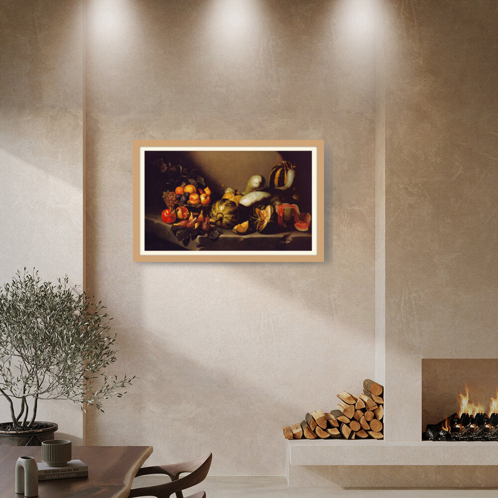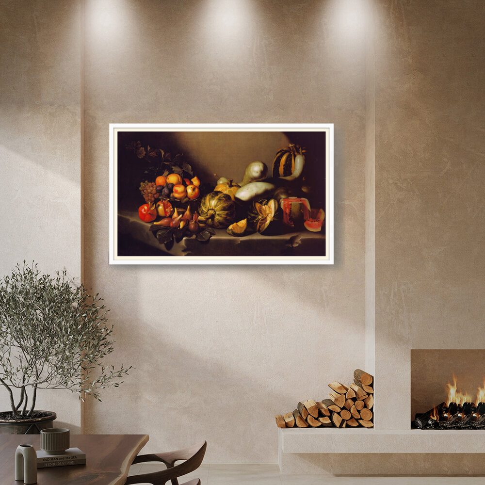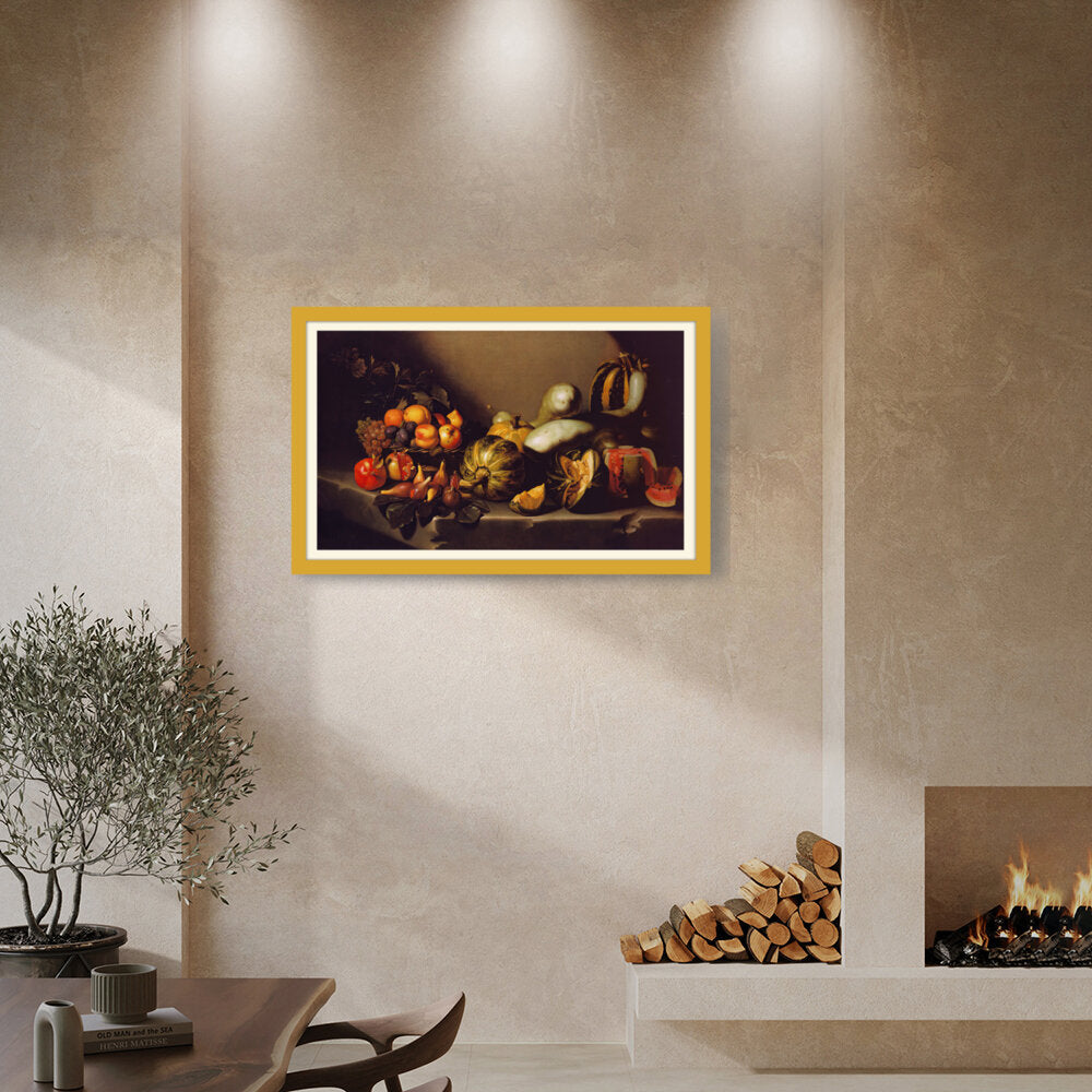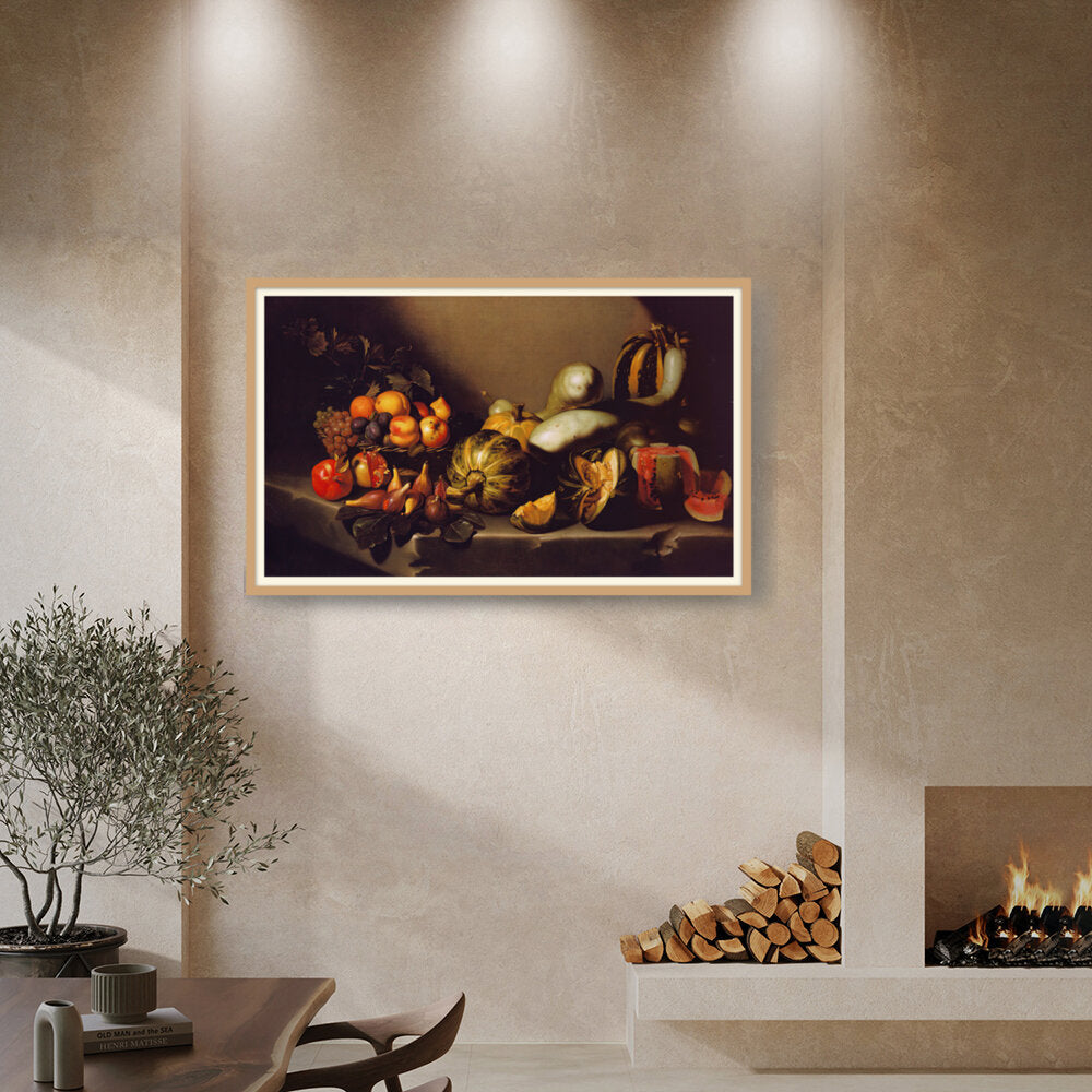 This exquisite still life captures the beauty of nature's bounty through a detailed arrangement of various fruits and vegetables. The vibrant colors and intricate textures invite viewers to appreciate the richness of the harvest. Ideal for enhancing any dining space with a touch of elegance.