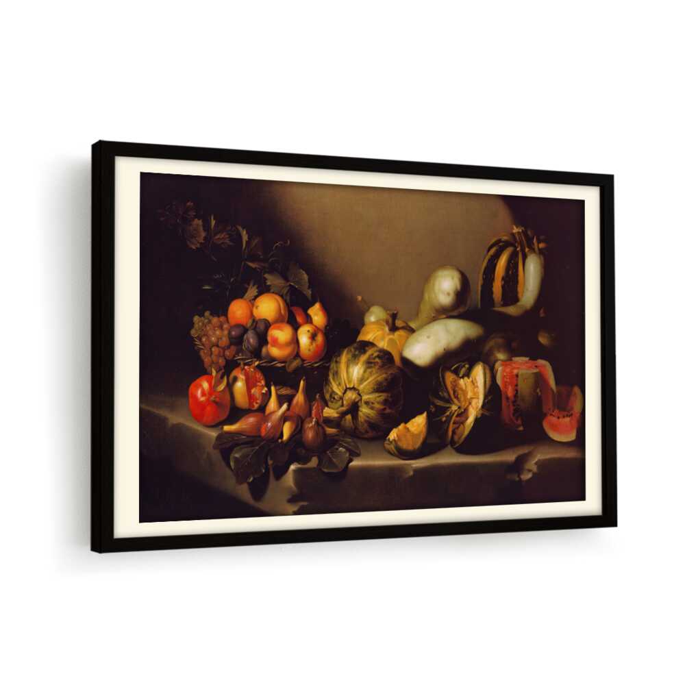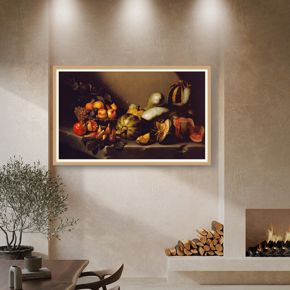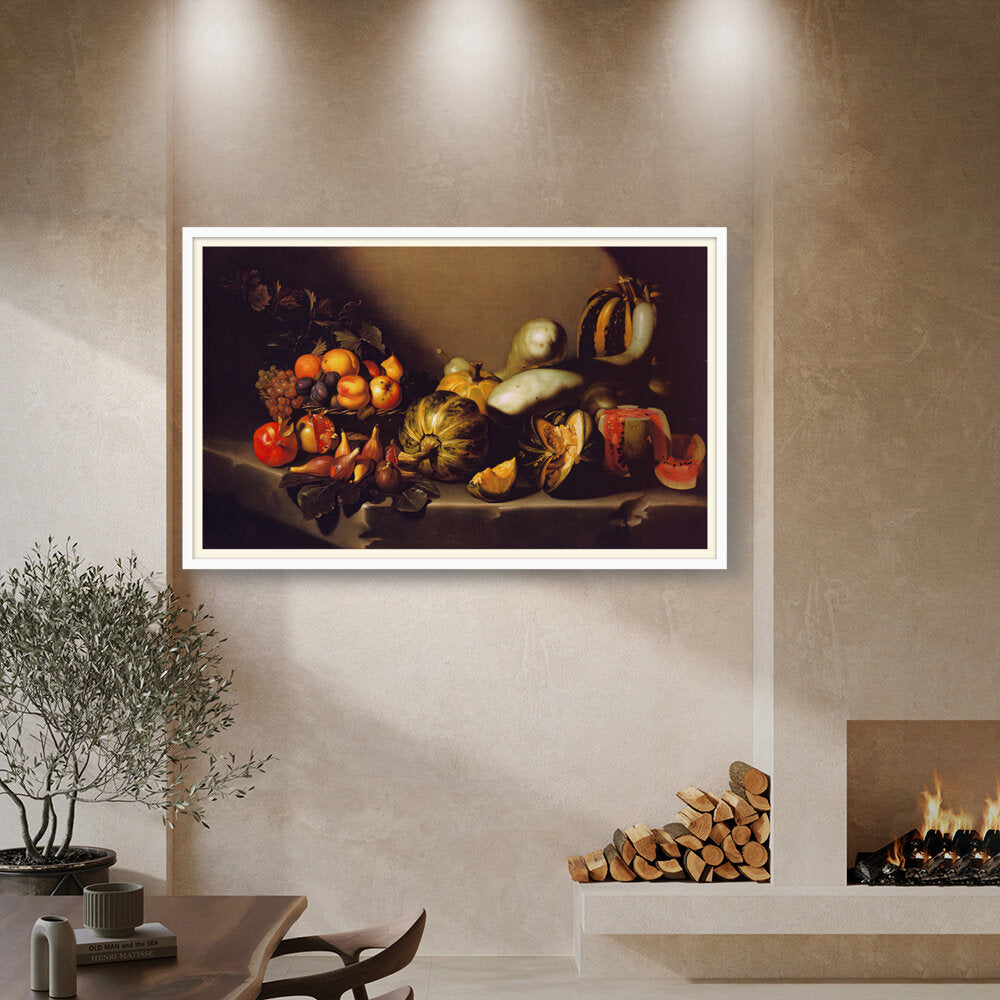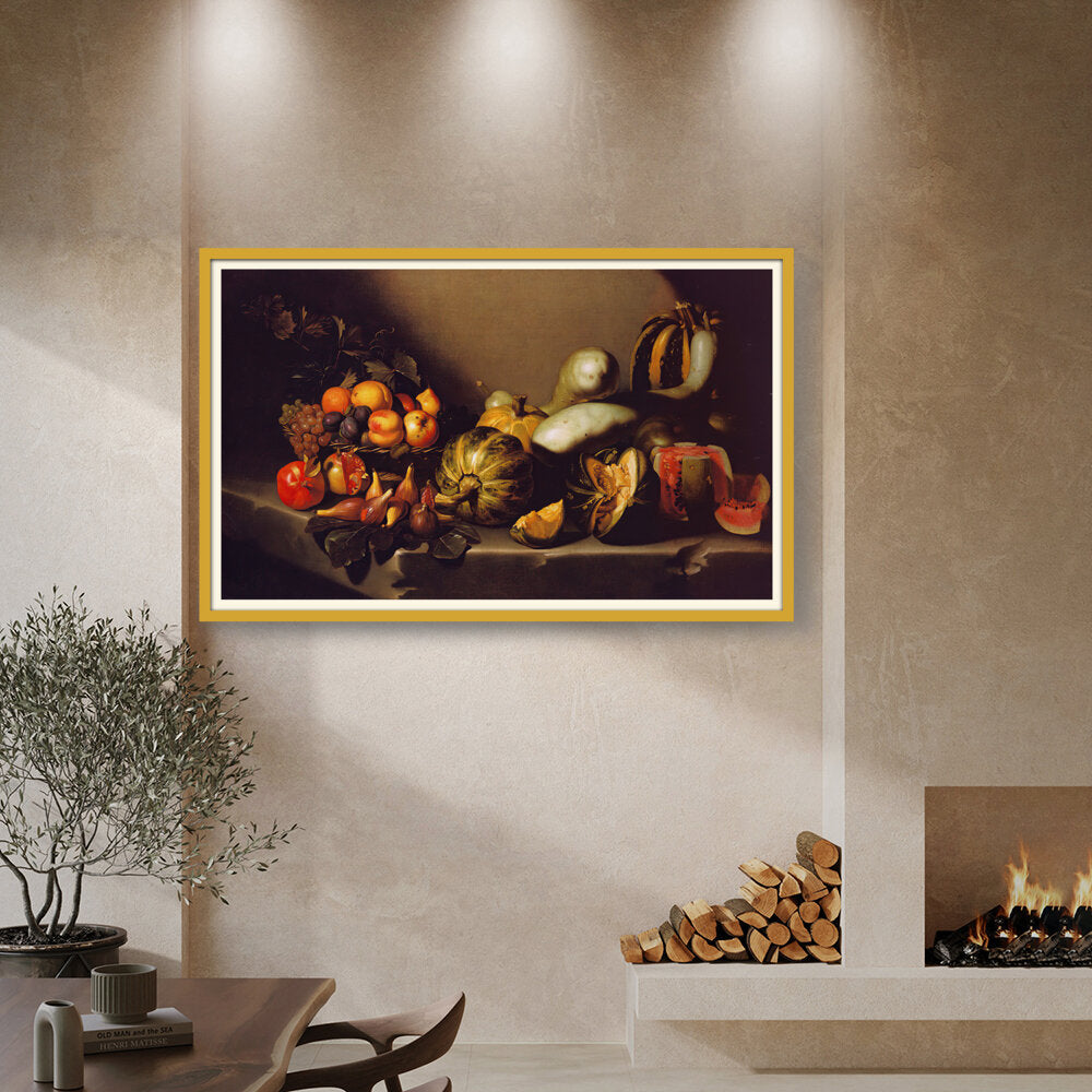 This exquisite still life captures the beauty of nature's bounty through a detailed arrangement of various fruits and vegetables. The vibrant colors and intricate textures invite viewers to appreciate the richness of the harvest. Ideal for enhancing any dining space with a touch of elegance.