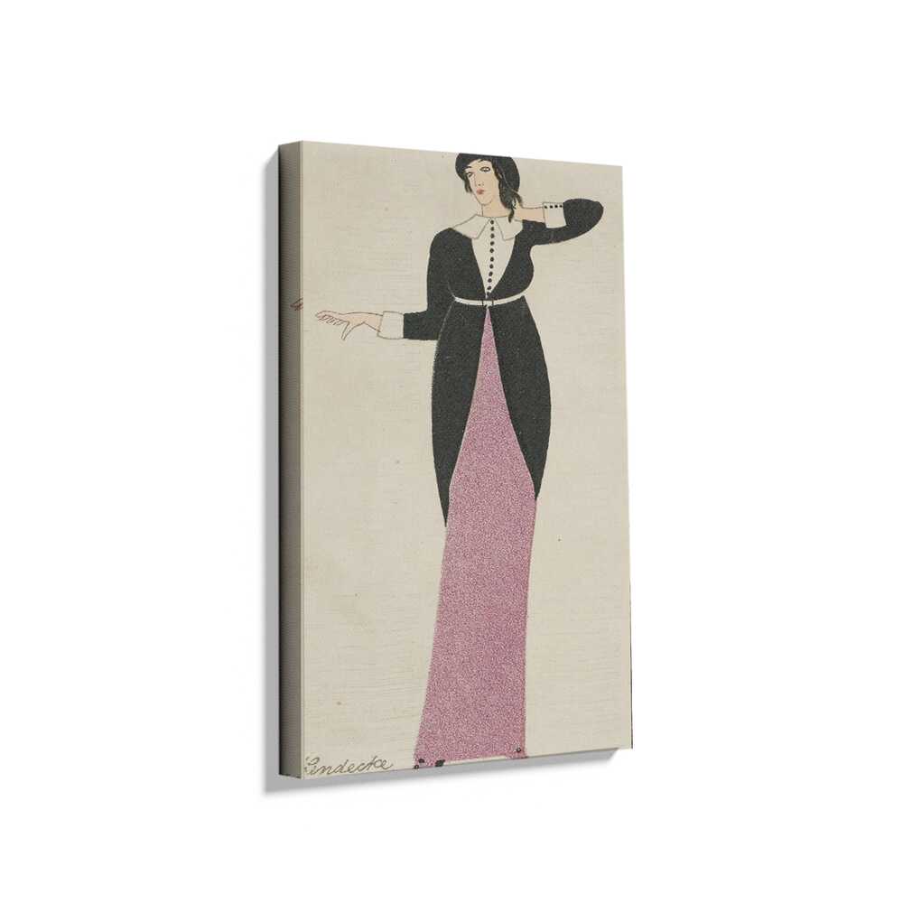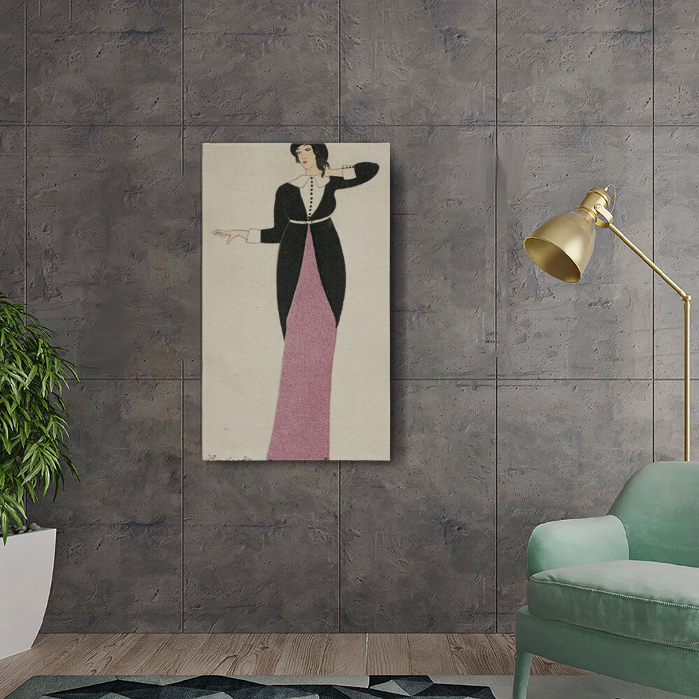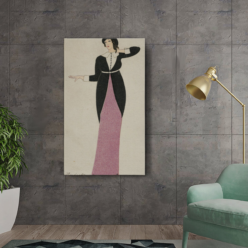 This illustration features a stylish woman adorned in an elegant black and pink outfit, capturing the essence of vintage fashion. The simplified lines and colors add to its charm, allowing it to fit effortlessly into a range of interior decors.
