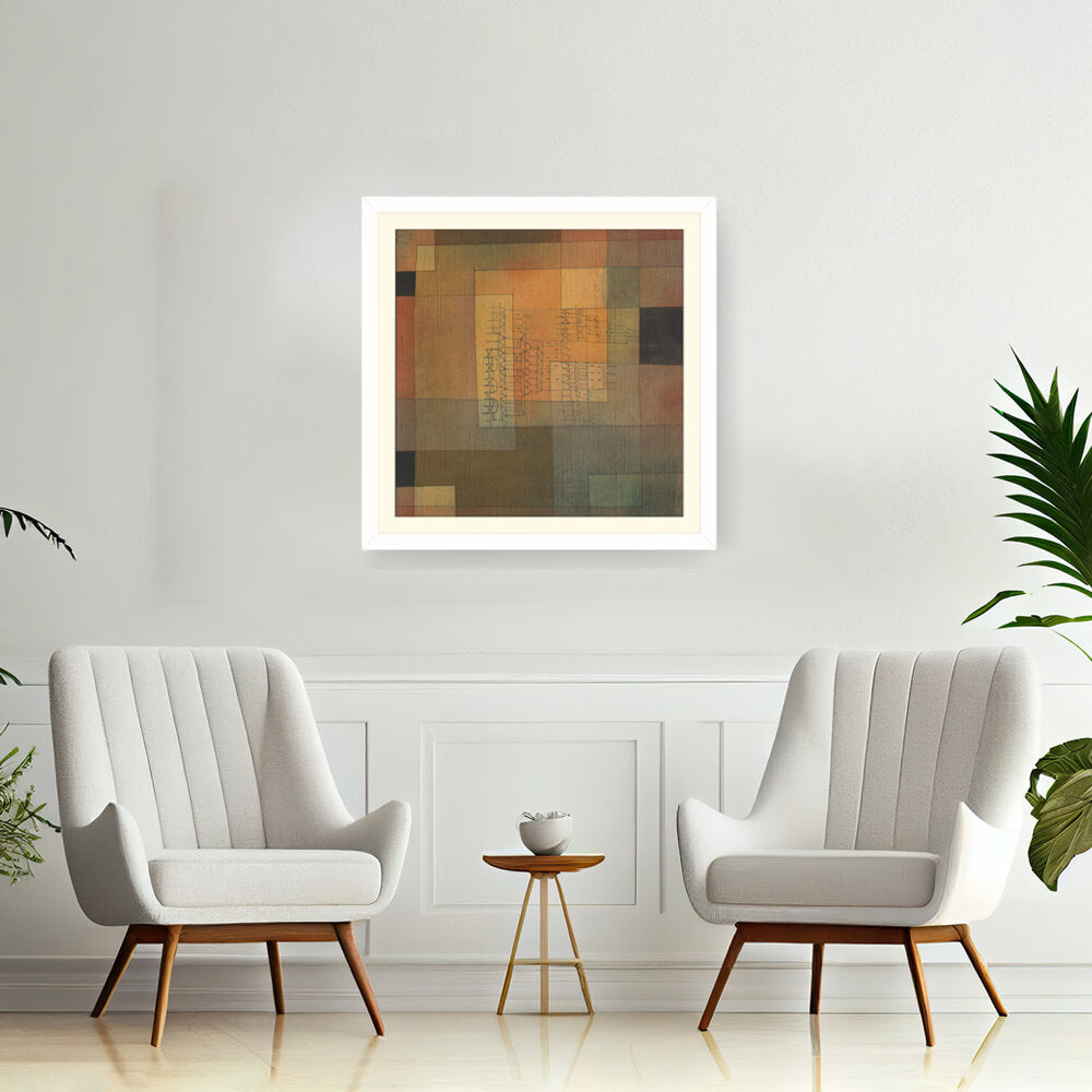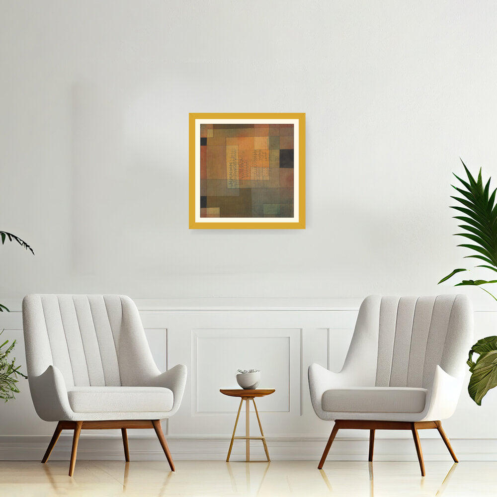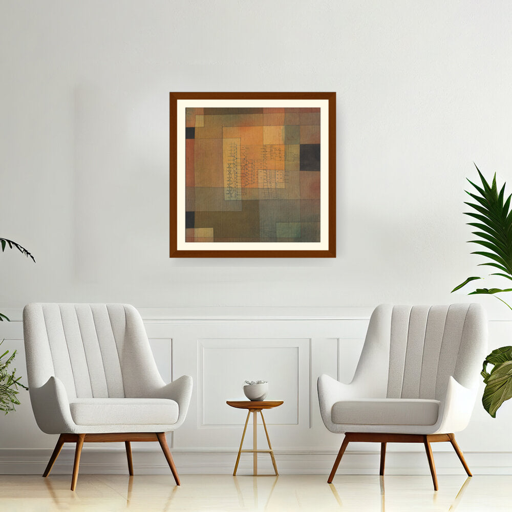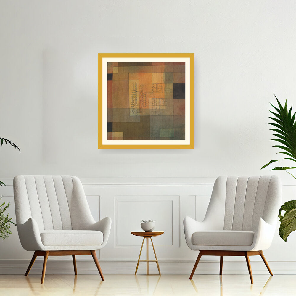 This artwork features a geometric cityscape rendered in warm hues, creating an abstract interpretation of urban landscapes. The interplay of colors and forms invites viewers to explore the complexity of modern life.