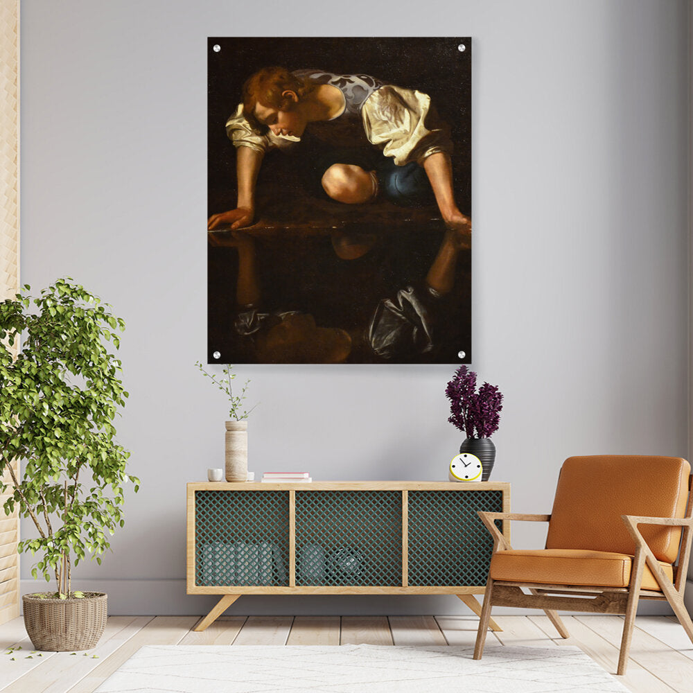 This captivating painting of Narcissus reflects deep themes of vanity and self-obsession, portrayed through the dramatic use of light and shadow. The detailed depiction invites viewers to explore the fine line between beauty and vanity in a mesmerizing visual narrative.