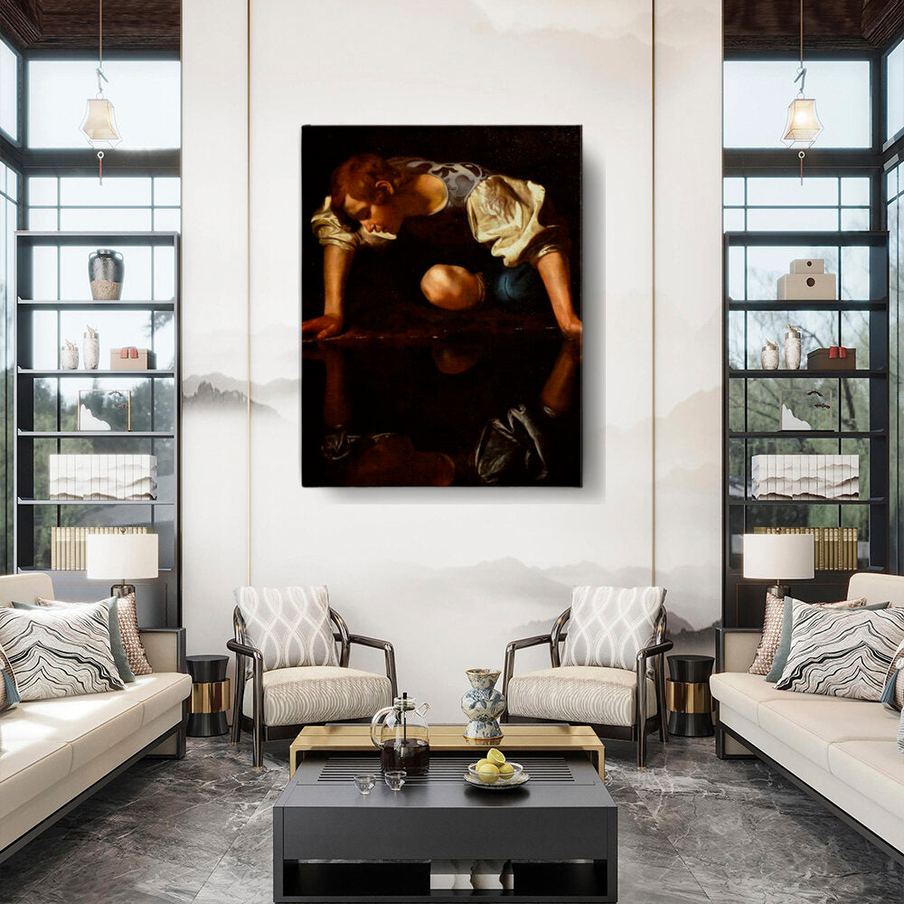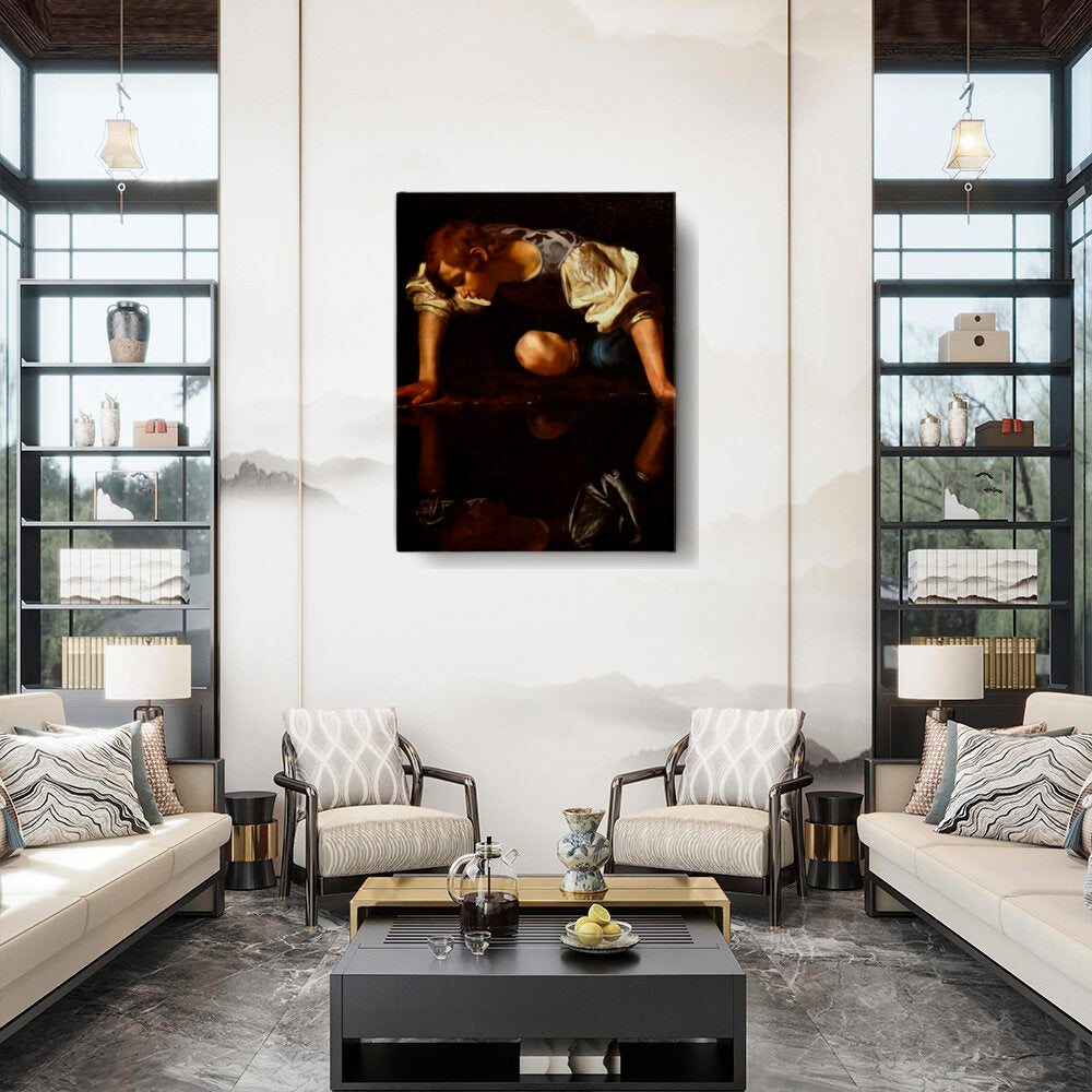 This captivating painting of Narcissus reflects deep themes of vanity and self-obsession, portrayed through the dramatic use of light and shadow. The detailed depiction invites viewers to explore the fine line between beauty and vanity in a mesmerizing visual narrative.