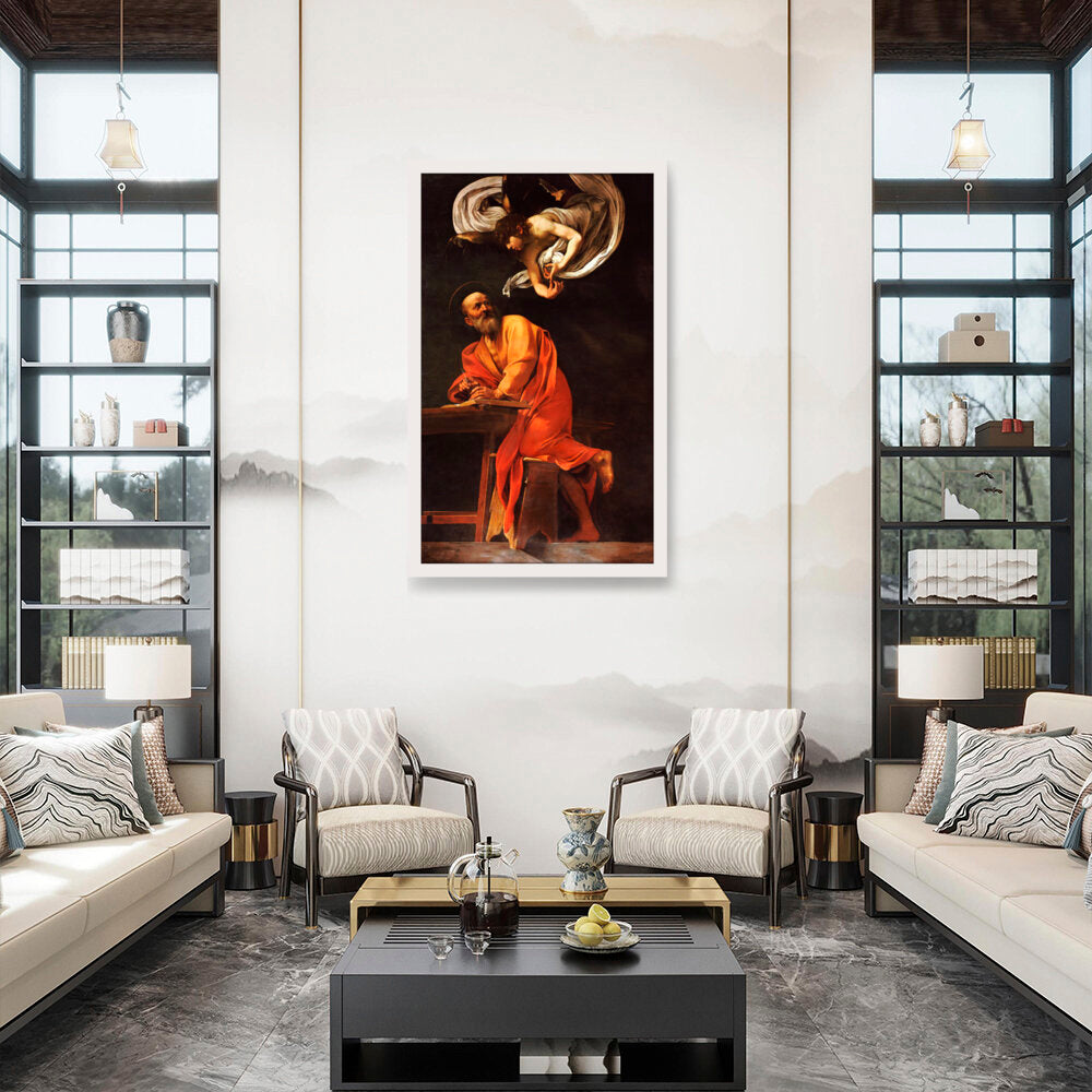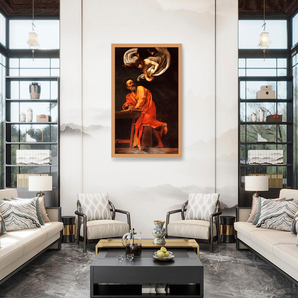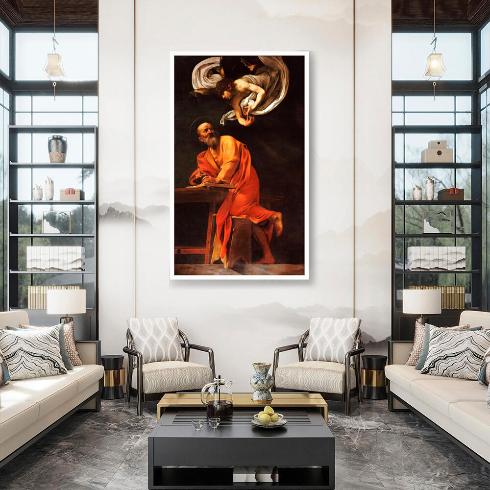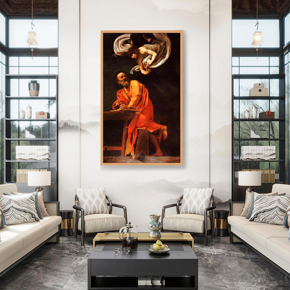 This classic oil painting depicts Saint Matthew receiving divine inspiration from an angel. The dramatic use of light and shadow highlights the emotional exchange, lending a sense of depth and reverence to the scene. Perfect for enhancing the atmosphere of contemplation in any living space.