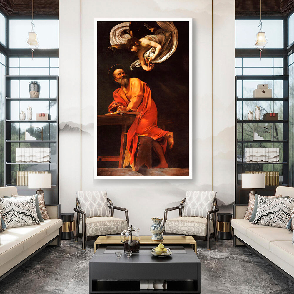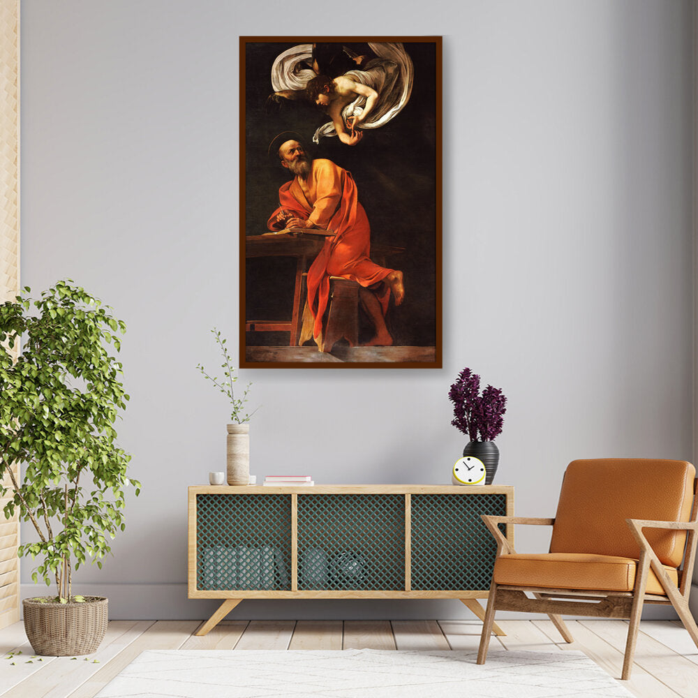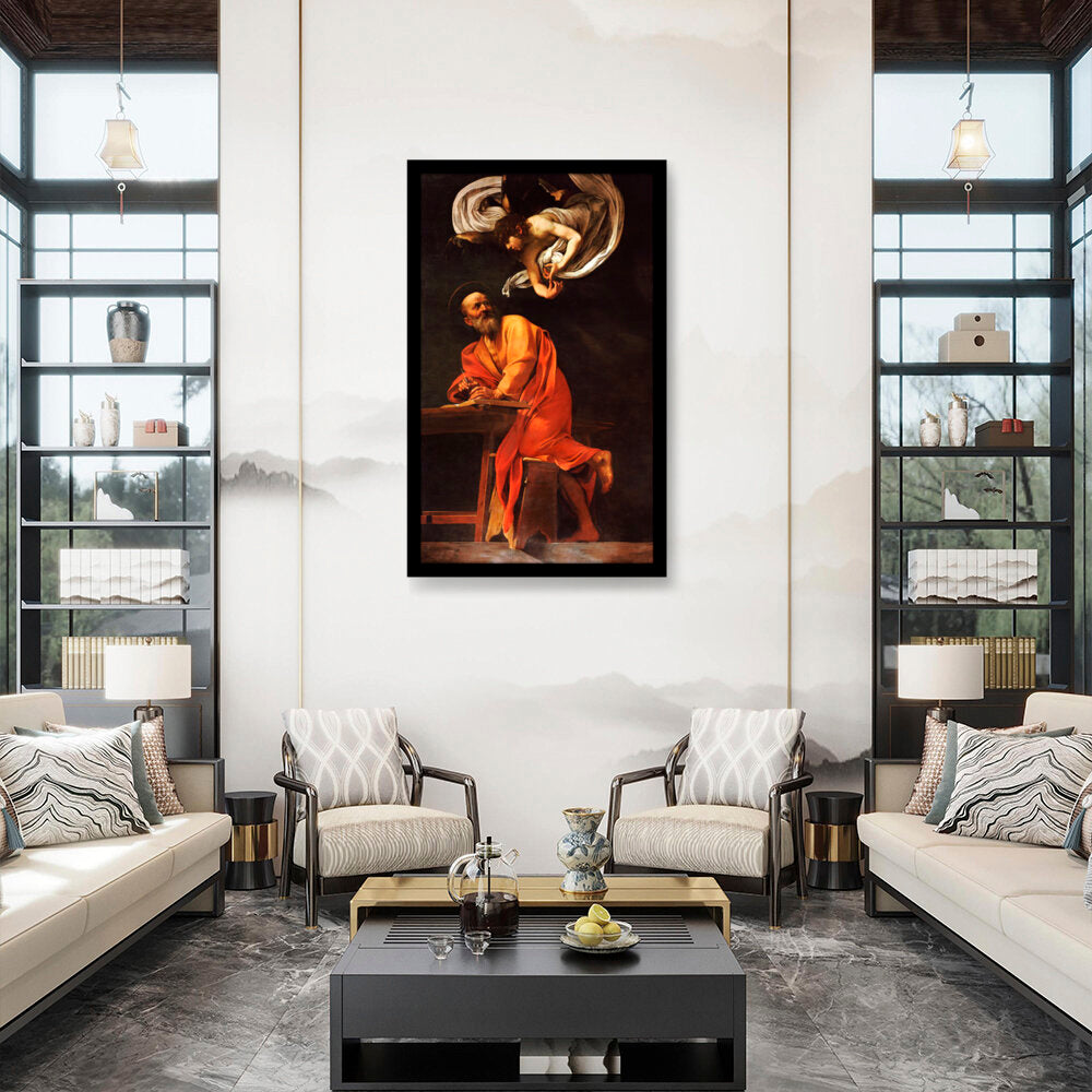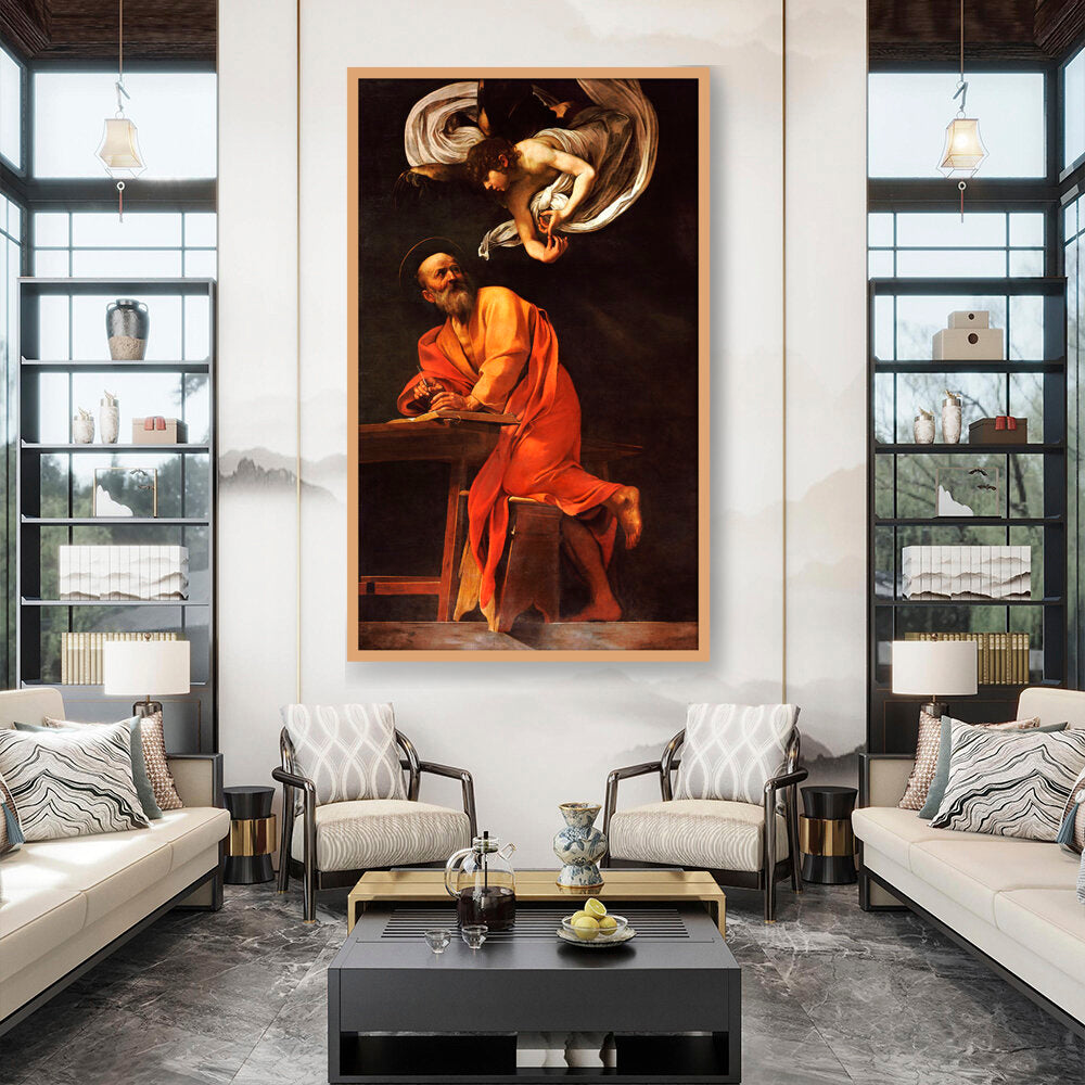 This classic oil painting depicts Saint Matthew receiving divine inspiration from an angel. The dramatic use of light and shadow highlights the emotional exchange, lending a sense of depth and reverence to the scene. Perfect for enhancing the atmosphere of contemplation in any living space.