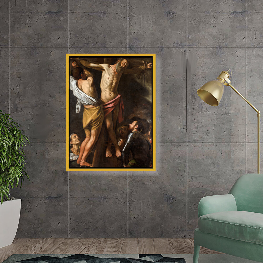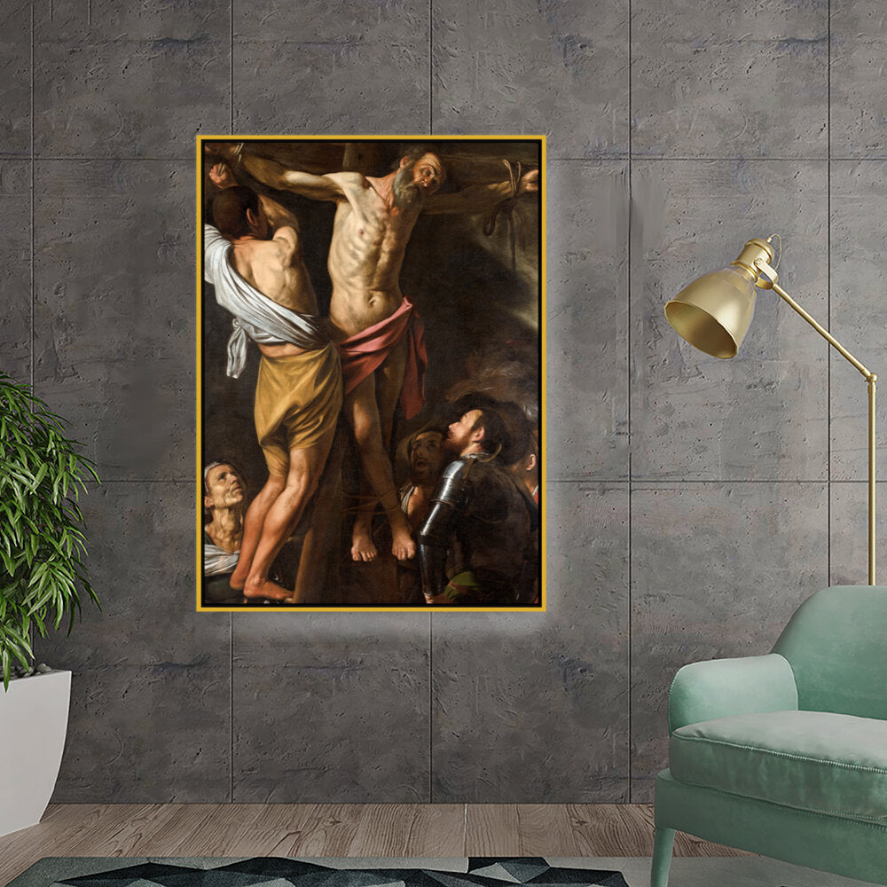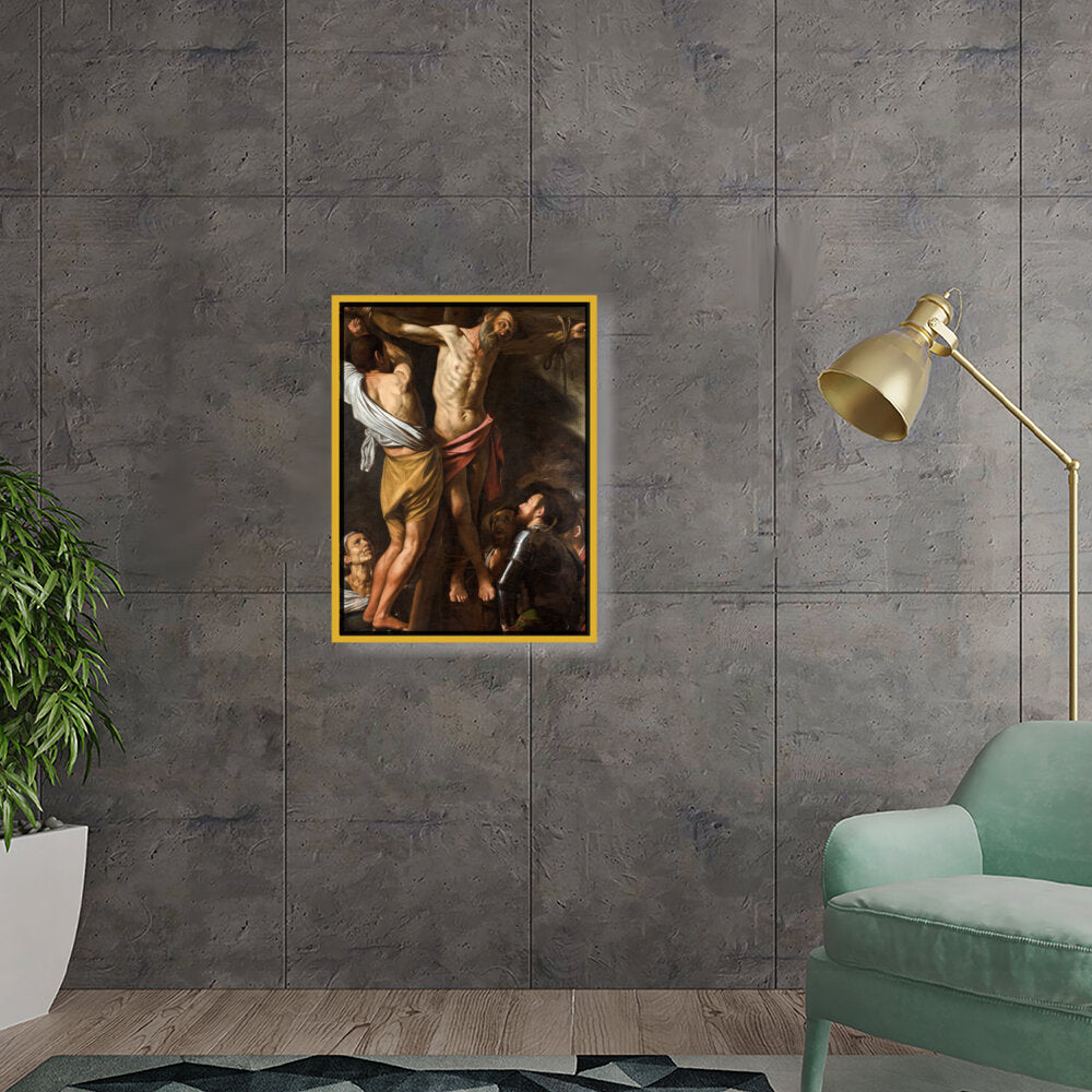 This powerful artwork depicts the crucifixion scene, capturing raw emotion and dramatic lighting. It presents the somber atmosphere surrounding one of history's most profound events. The intricate details and realism evoke a strong connection to the viewer.