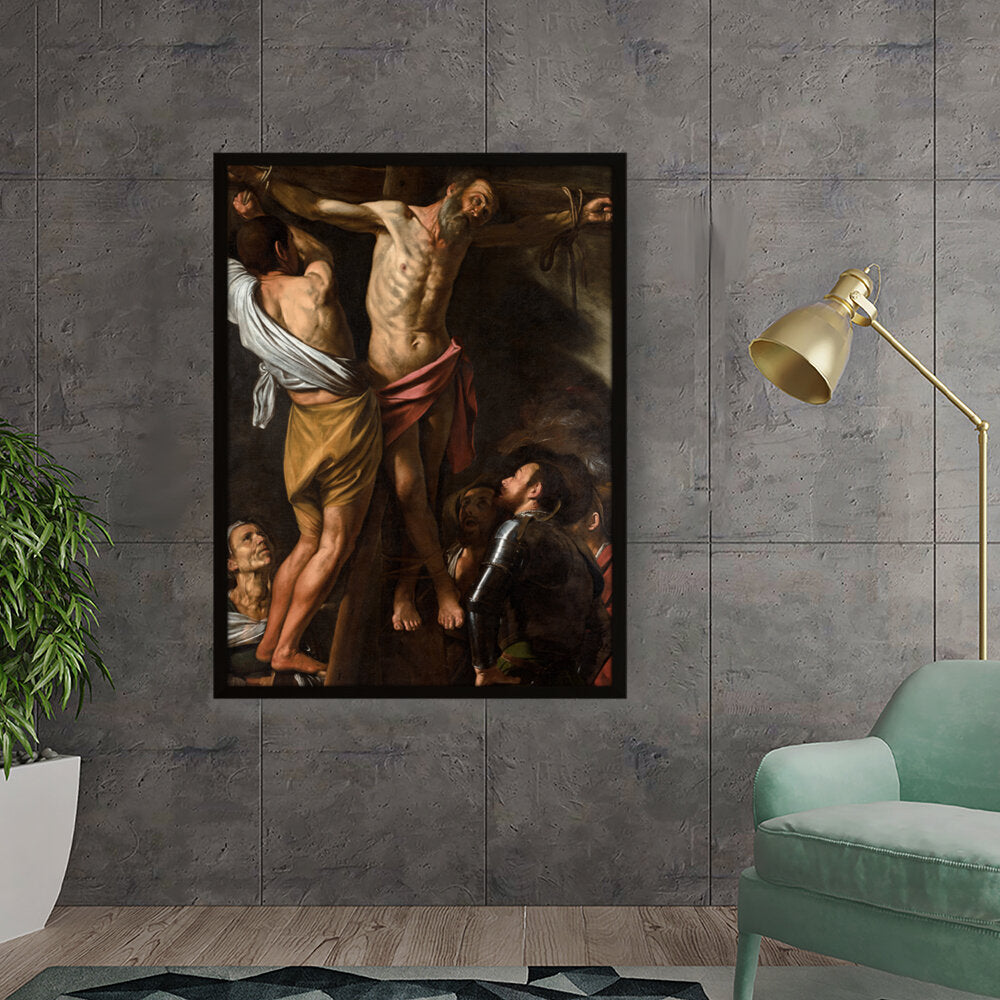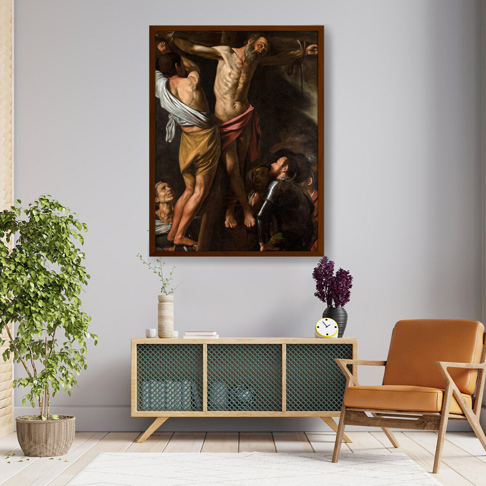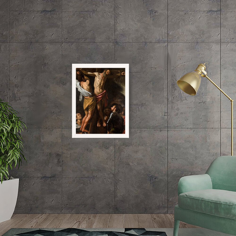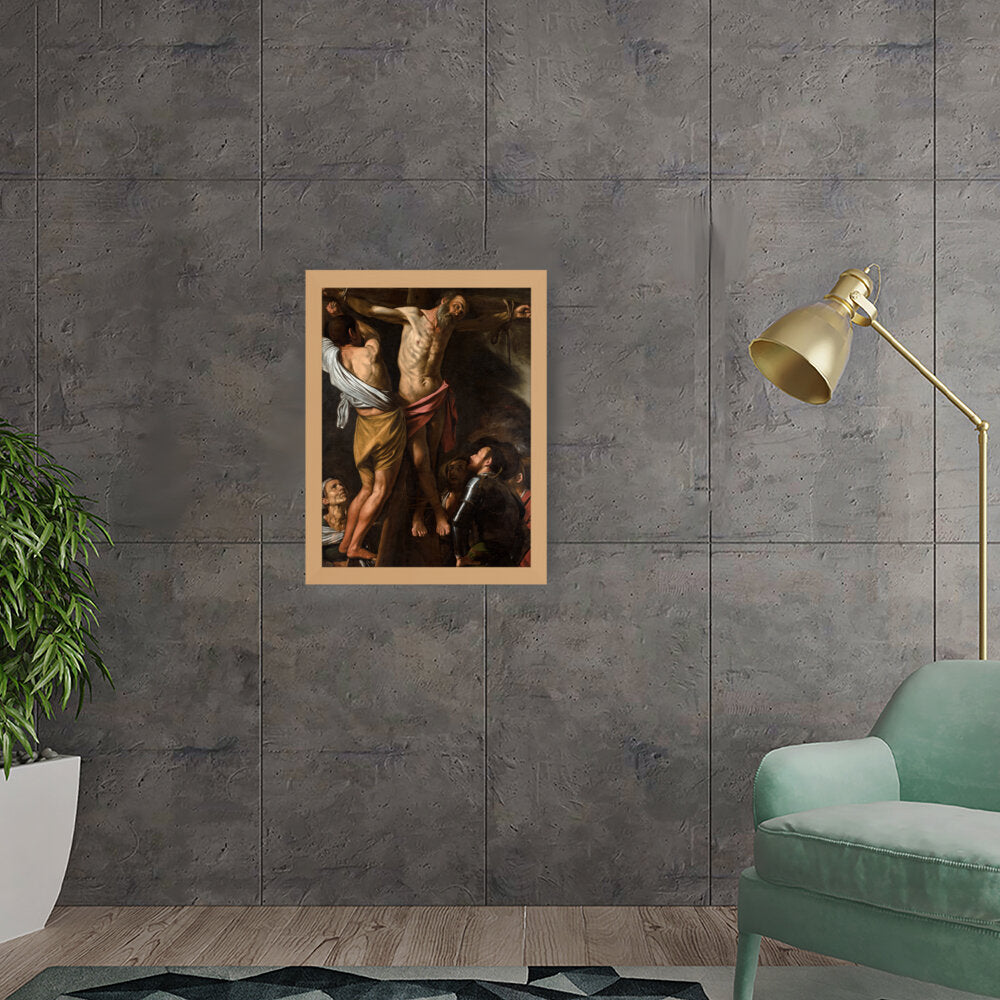 This powerful artwork depicts the crucifixion scene, capturing raw emotion and dramatic lighting. It presents the somber atmosphere surrounding one of history's most profound events. The intricate details and realism evoke a strong connection to the viewer.