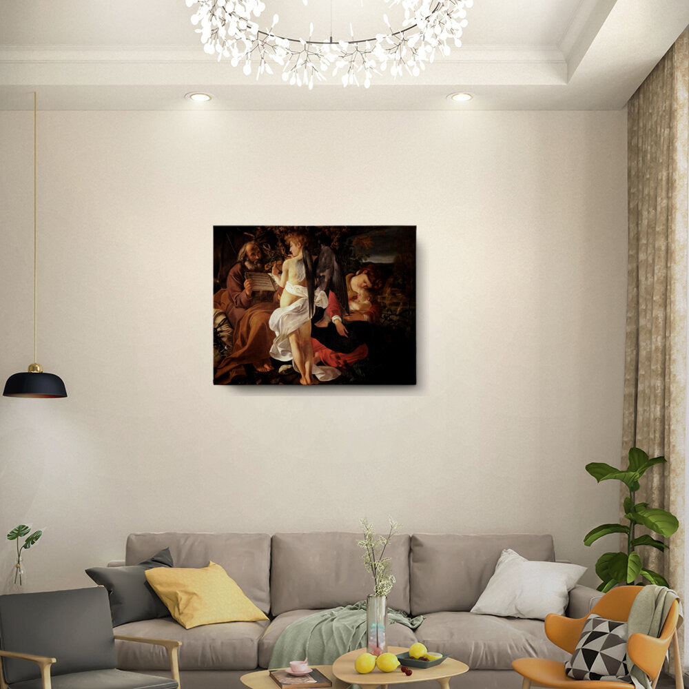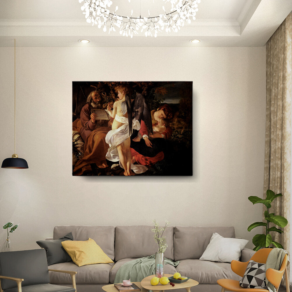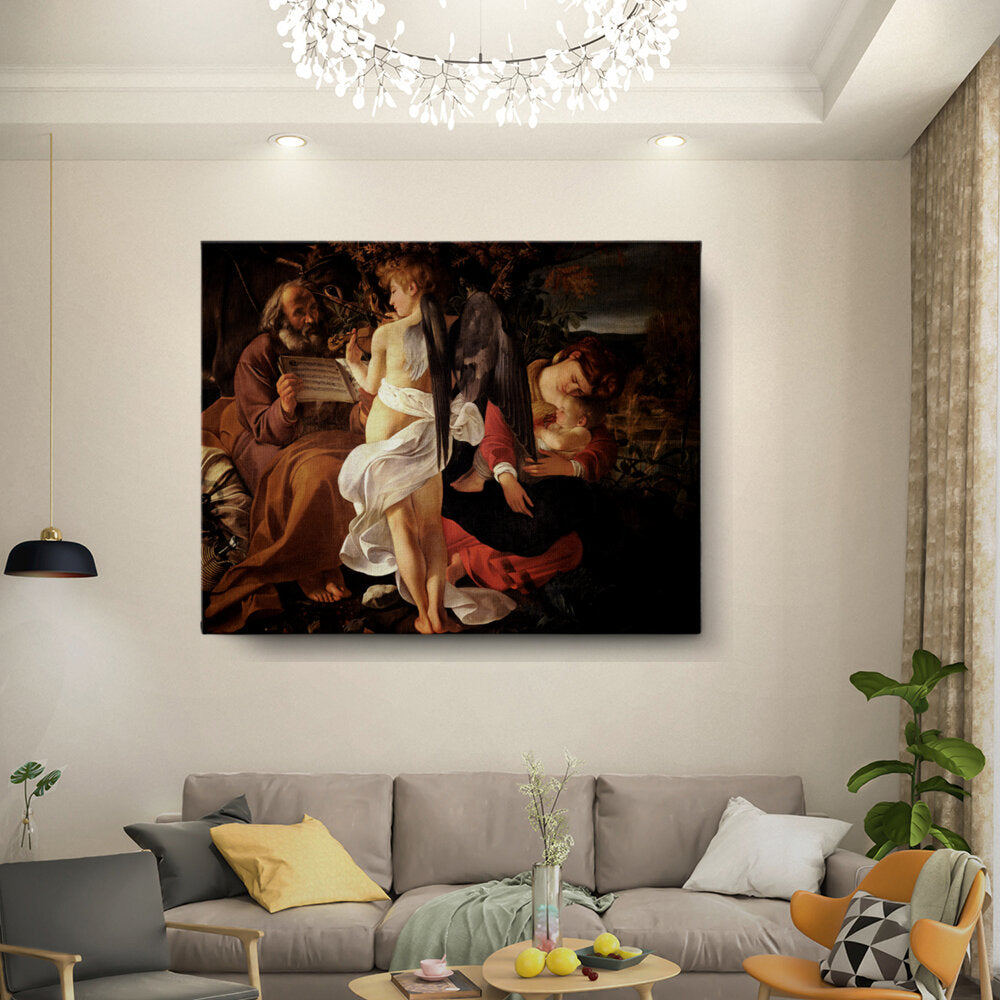 This exquisite oil painting depicts the Holy Family with the Infant Saint John the Baptist, showcasing intricate details and a deep emotional resonance. The use of light and shadow, combined with the rich color palette, creates a serene and intimate atmosphere, perfect for any classical art enthusiast.