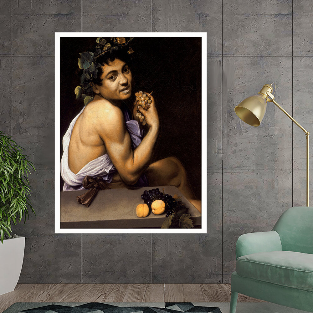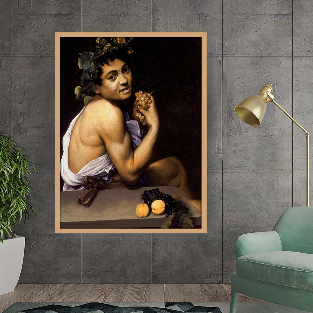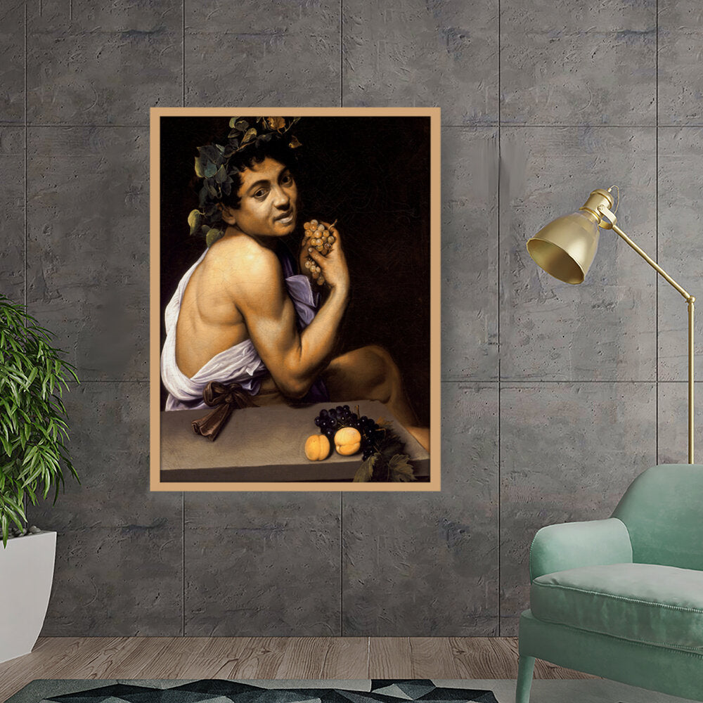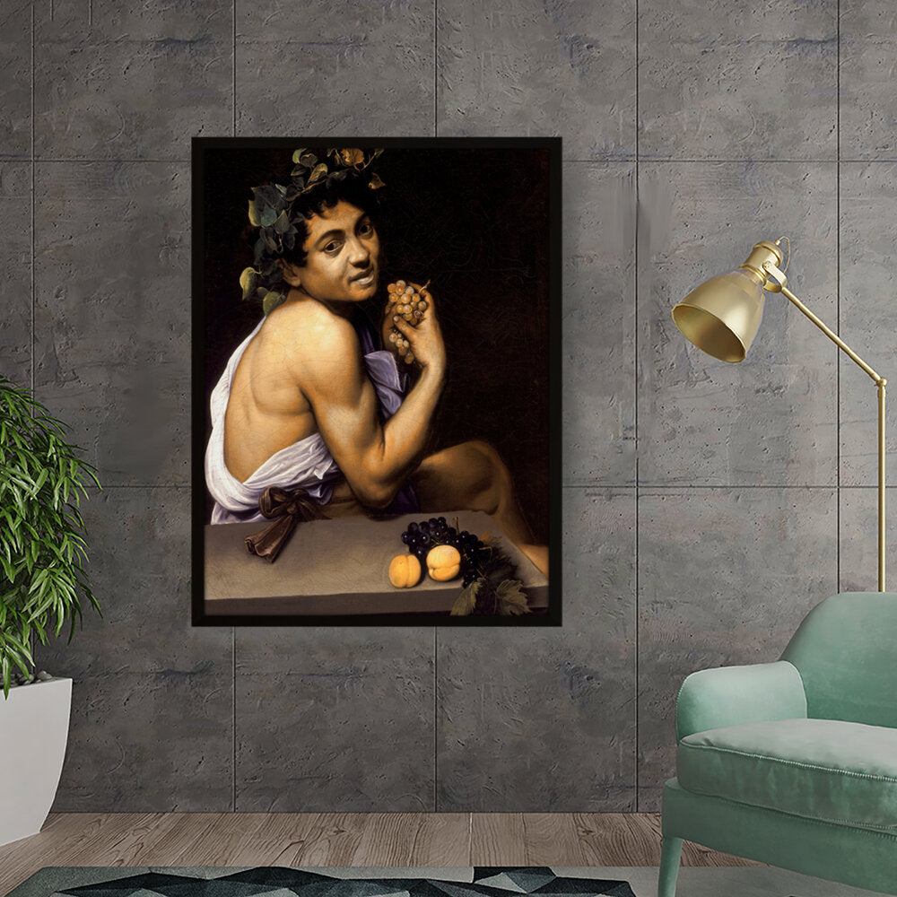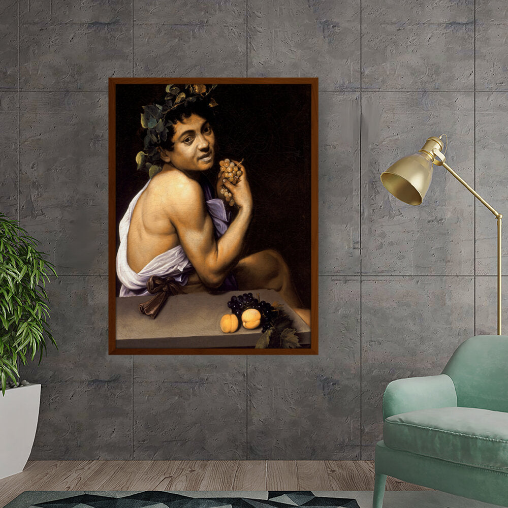 This captivating painting features a youthful Bacchus, the Roman god of wine, portrayed with rich detail and vibrant colors. With a backdrop of deep shadows, the subject holds a cluster of grapes, symbolizing both fertility and revelry. Ideal for adding a sense of classic art to any modern space.