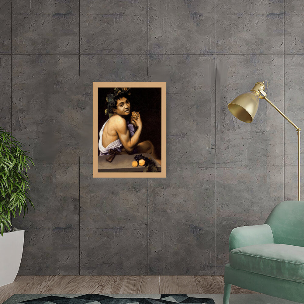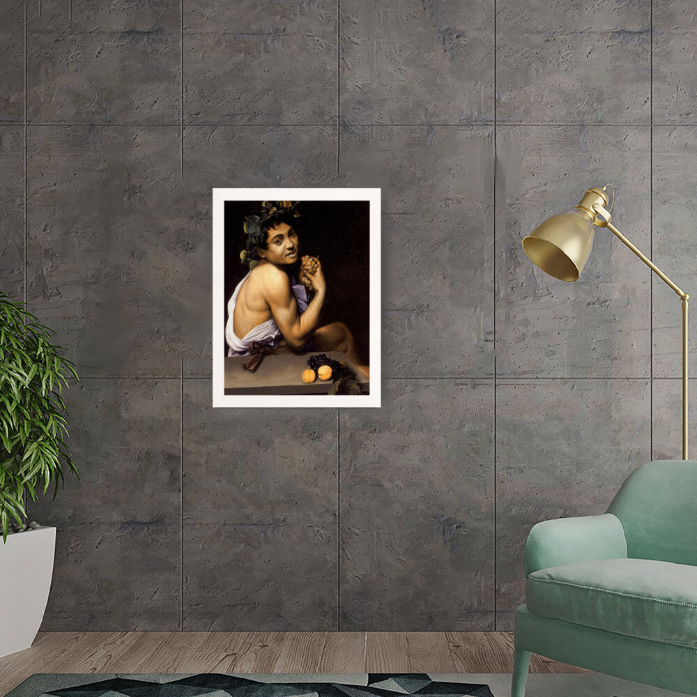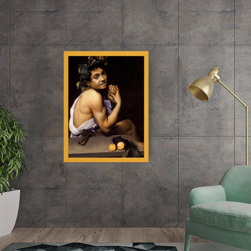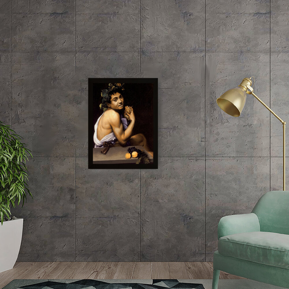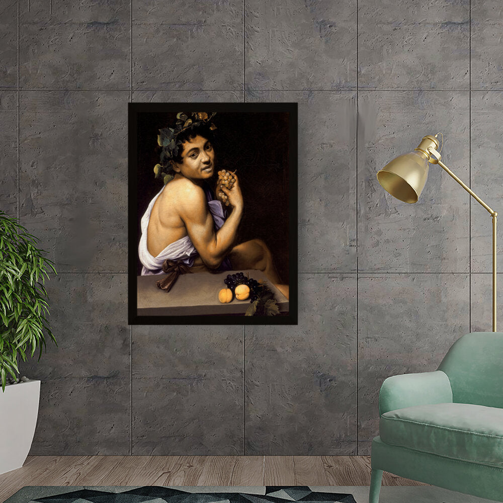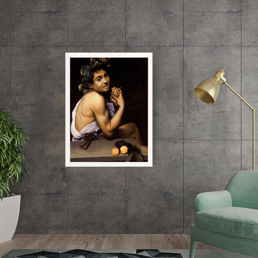 This captivating painting features a youthful Bacchus, the Roman god of wine, portrayed with rich detail and vibrant colors. With a backdrop of deep shadows, the subject holds a cluster of grapes, symbolizing both fertility and revelry. Ideal for adding a sense of classic art to any modern space.