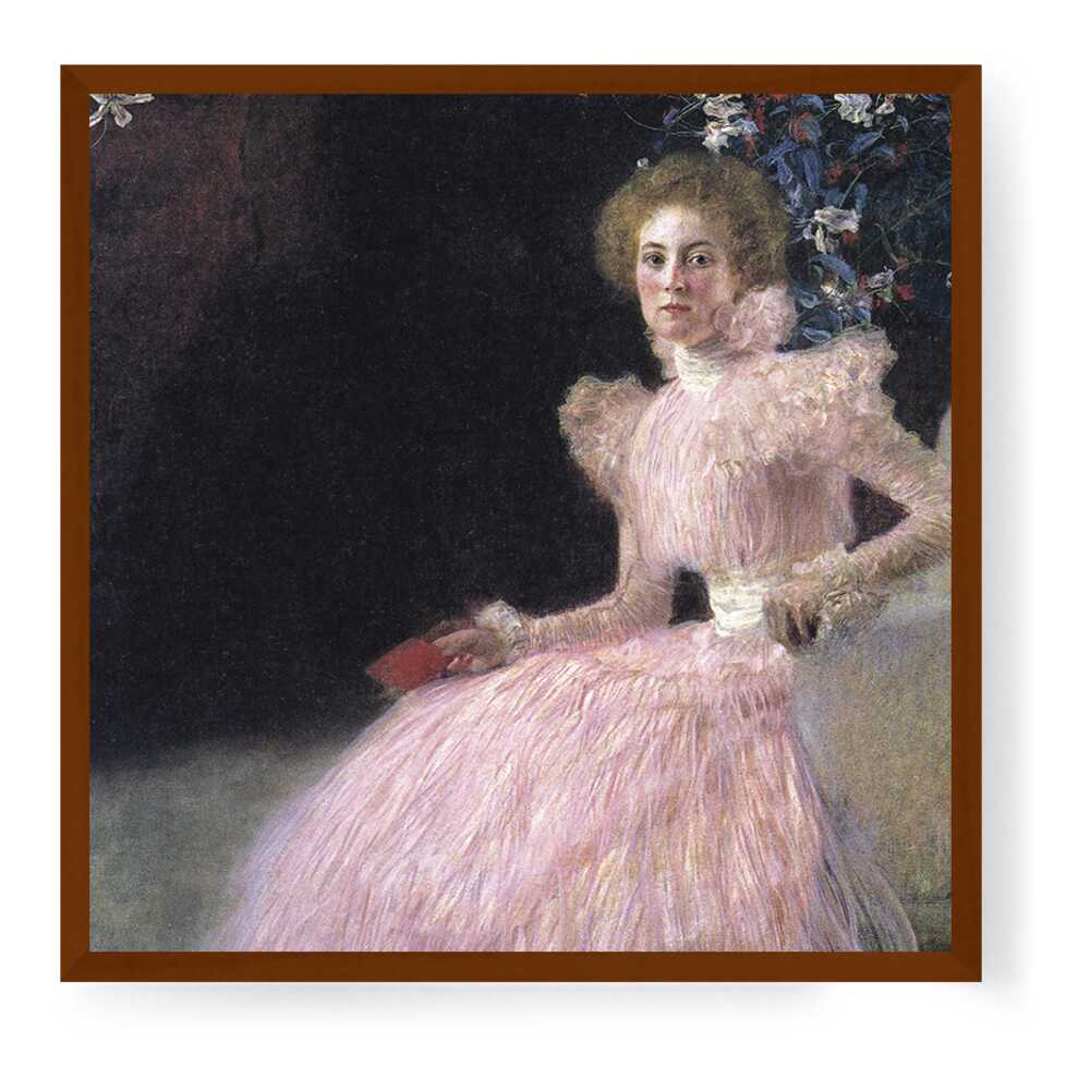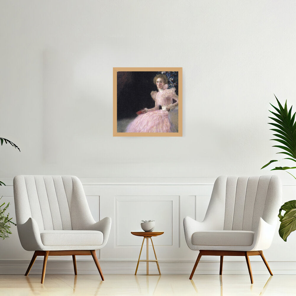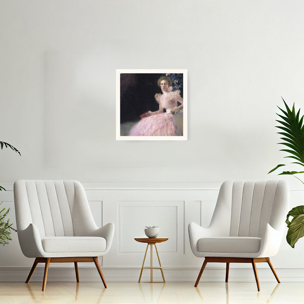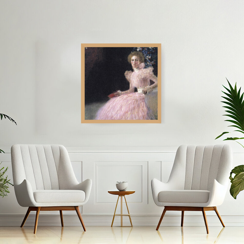 This stunning portrait captures a woman in an elegant pink dress, radiating grace and poise. The soft textures and subtle color palette create a dreamy atmosphere, making it a perfect piece for any refined space.