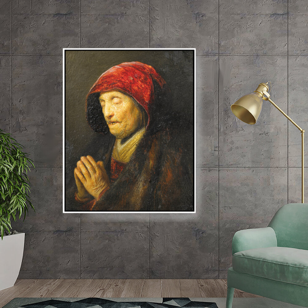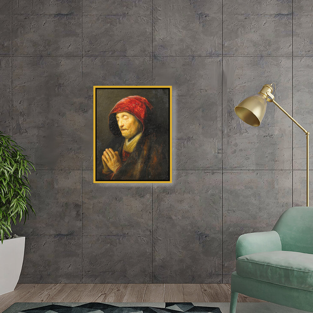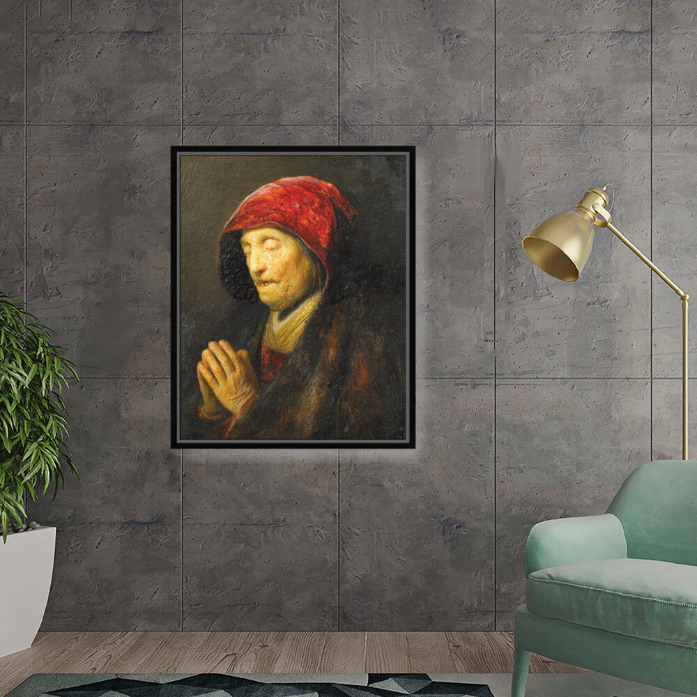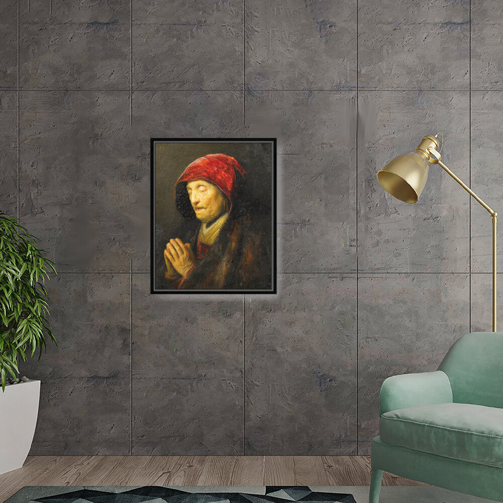 This captivating oil painting features an elderly woman in prayer, draped in rich textures and deep colors. The emotional depth encapsulated in her expression invites viewers to reflect on feelings of devotion and contemplation.