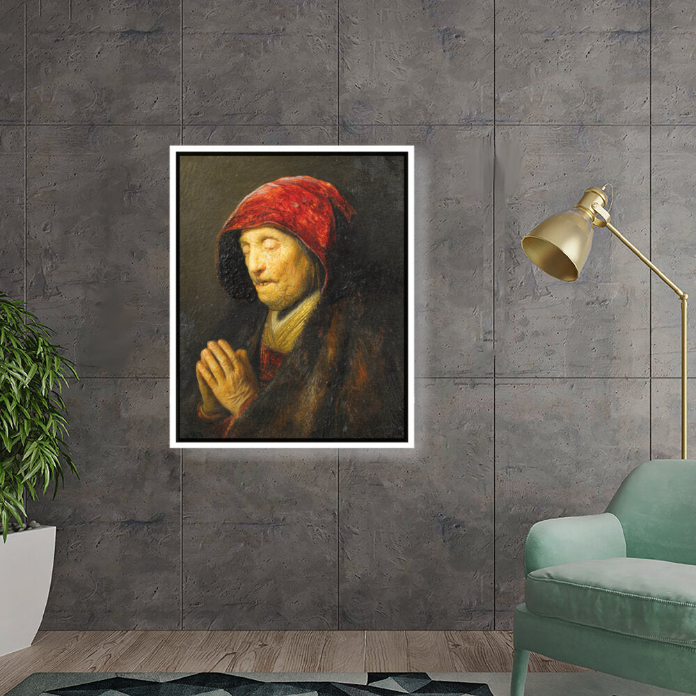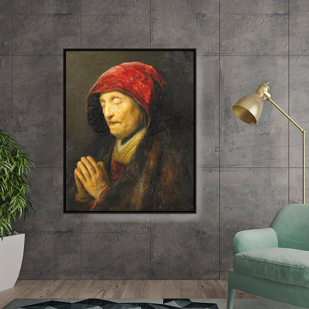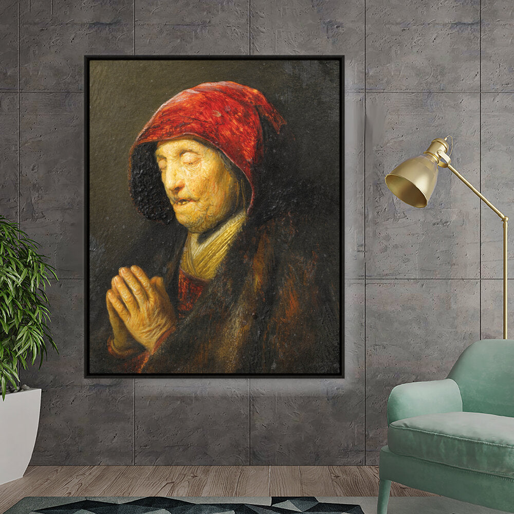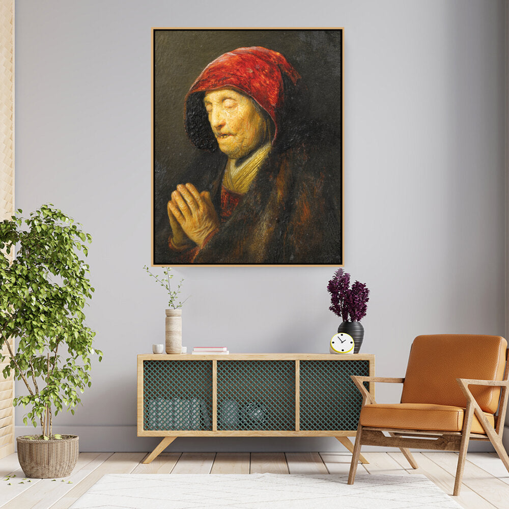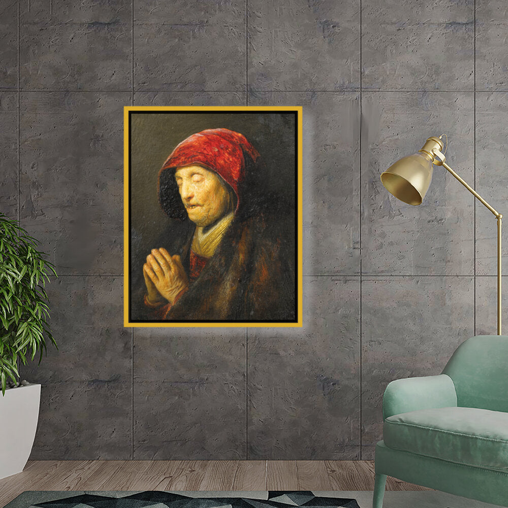 This captivating oil painting features an elderly woman in prayer, draped in rich textures and deep colors. The emotional depth encapsulated in her expression invites viewers to reflect on feelings of devotion and contemplation.