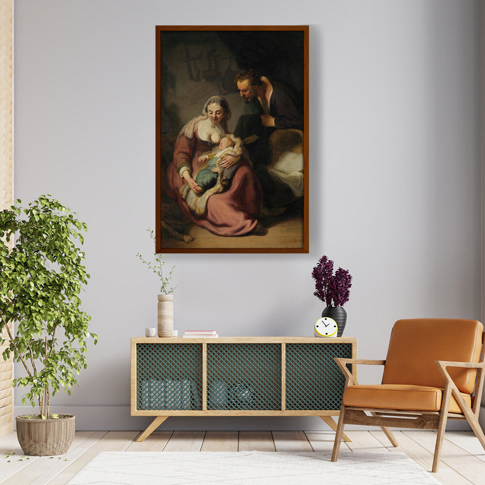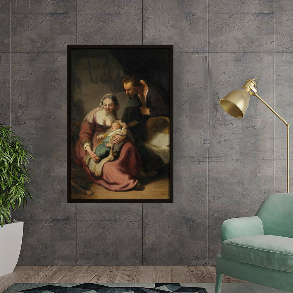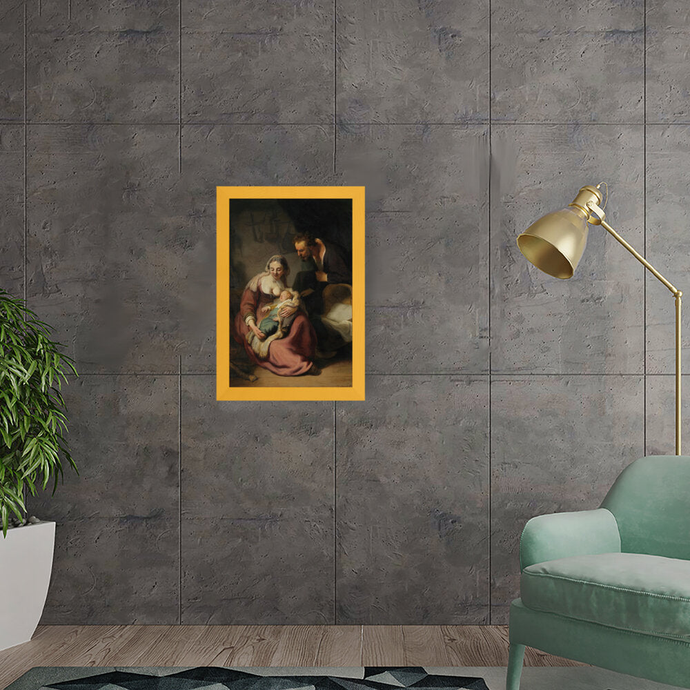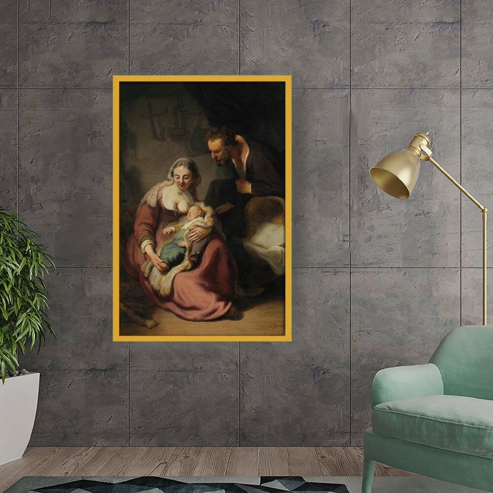 This classic oil painting captures a tender moment between the Holy Family, showcasing the intimate bond between Mary, Joseph, and their infant child. The meticulous details and realistic portrayal add depth and emotion, making it a timeless piece for any art lover.