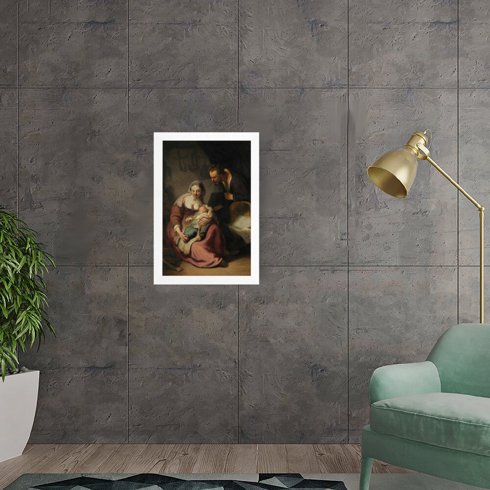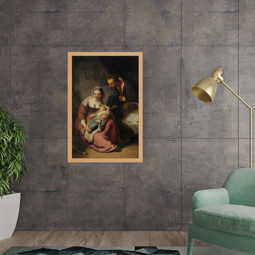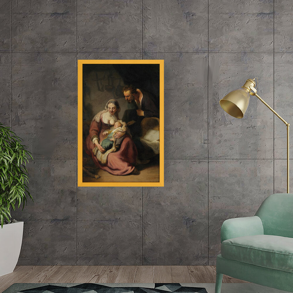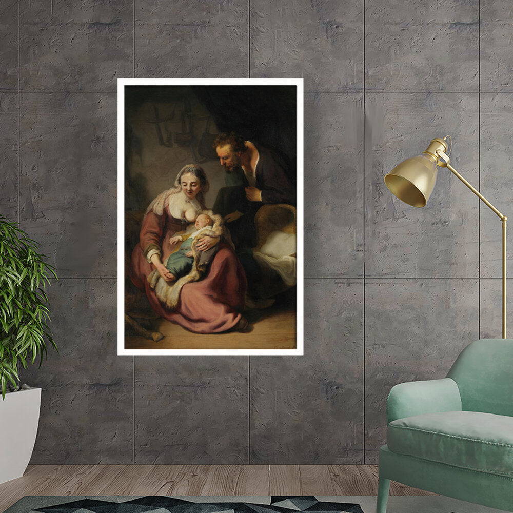 This classic oil painting captures a tender moment between the Holy Family, showcasing the intimate bond between Mary, Joseph, and their infant child. The meticulous details and realistic portrayal add depth and emotion, making it a timeless piece for any art lover.