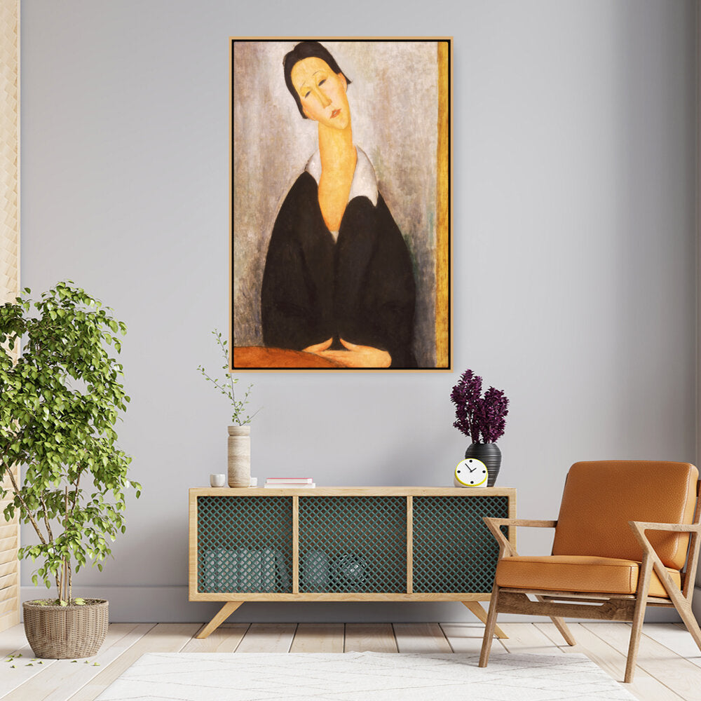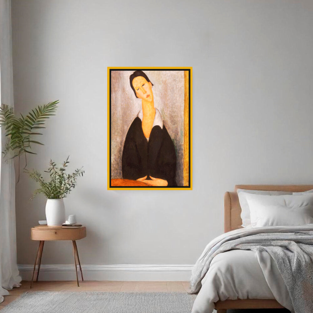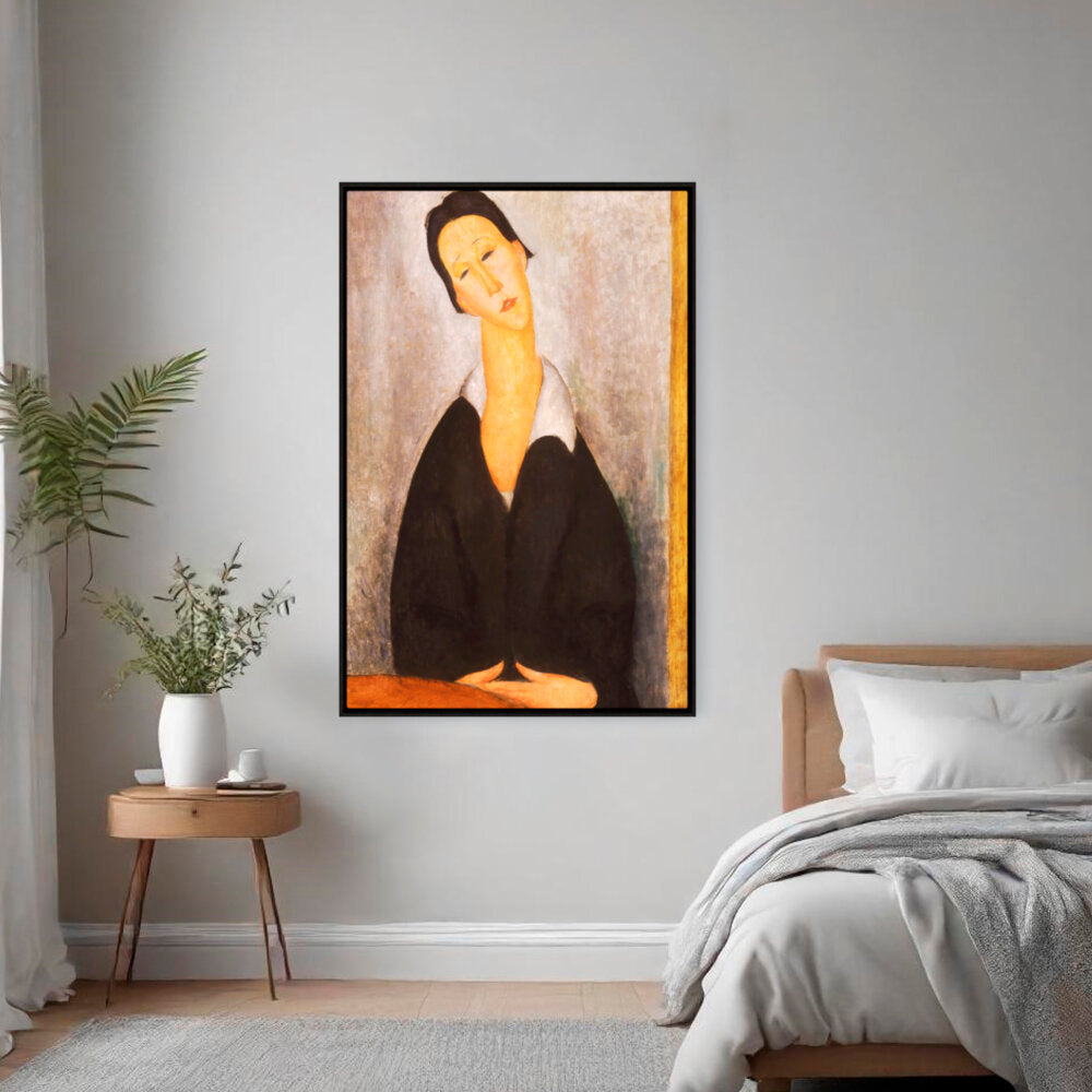 This captivating artwork features a woman dressed in black, depicted with elongated features and a serene expression. The subtle color palette and emotional depth invite a contemplative mood, making it a perfect addition to any intimate space.