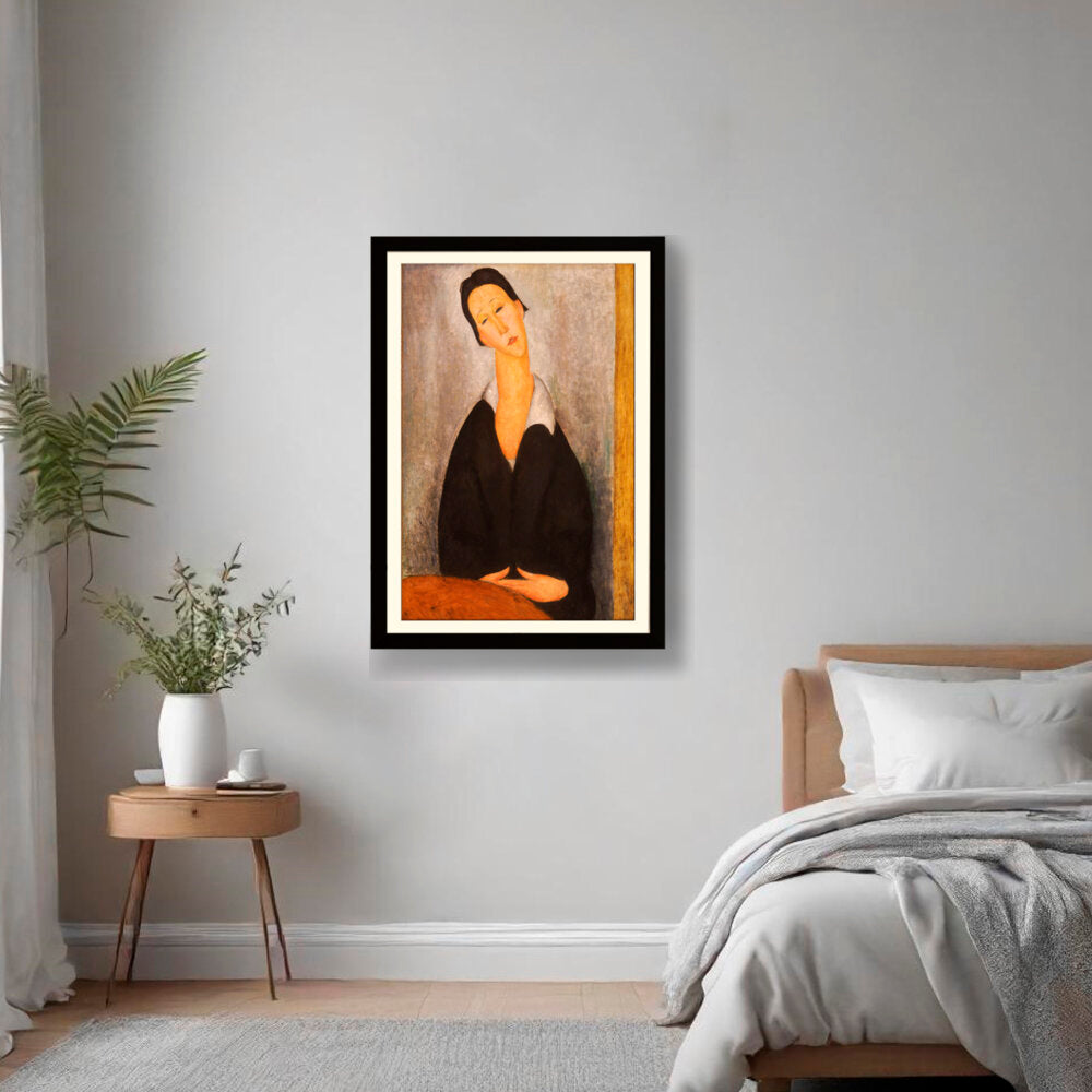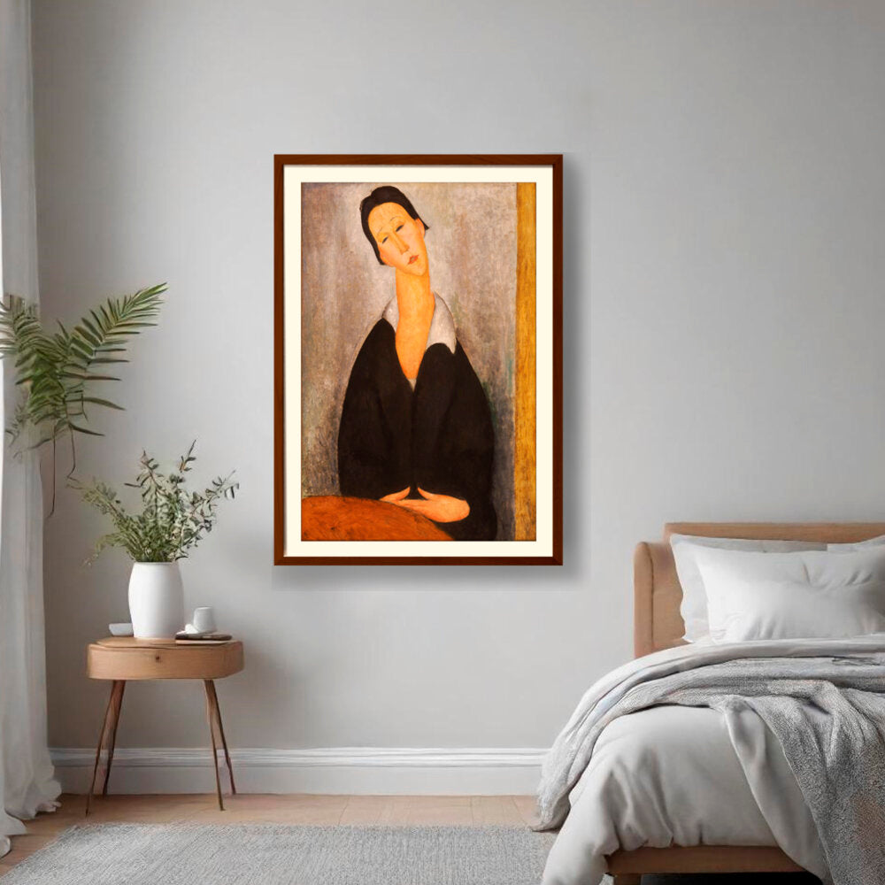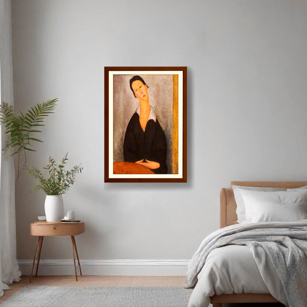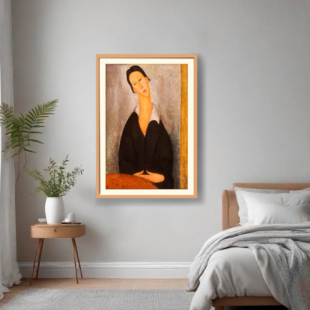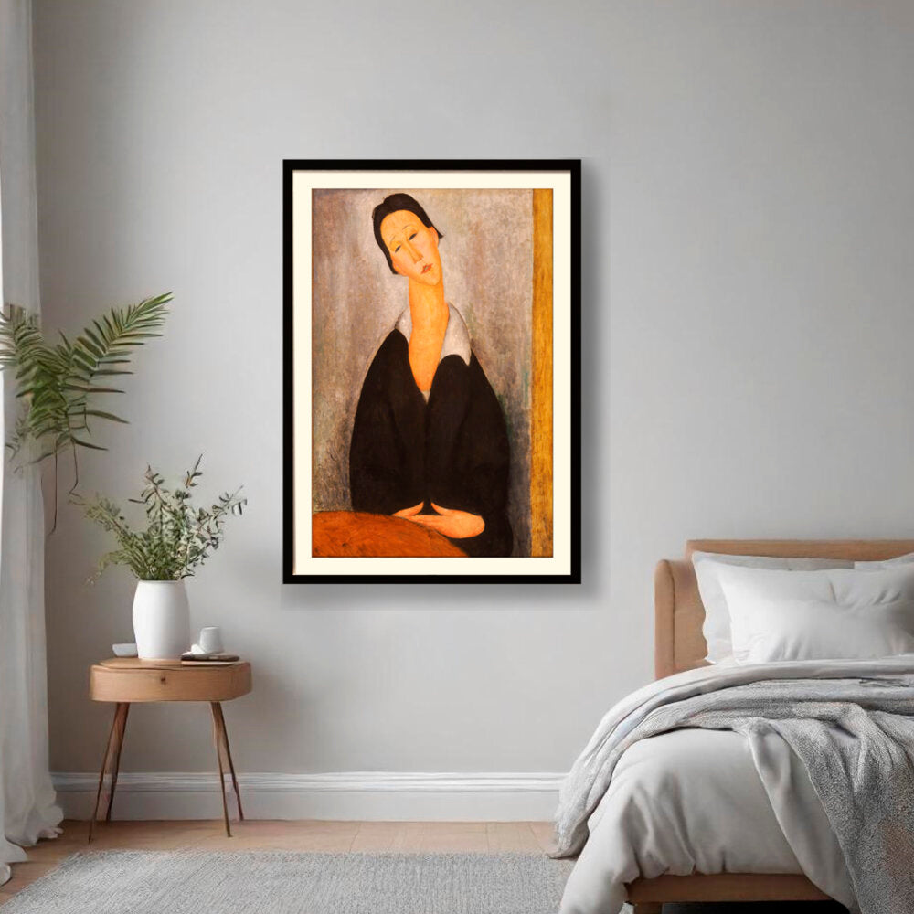 This captivating artwork features a woman dressed in black, depicted with elongated features and a serene expression. The subtle color palette and emotional depth invite a contemplative mood, making it a perfect addition to any intimate space.