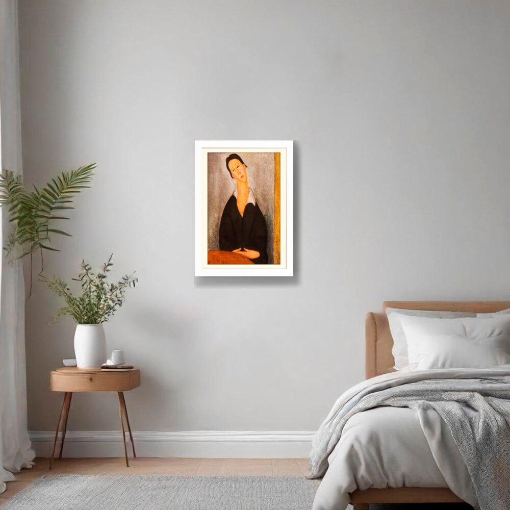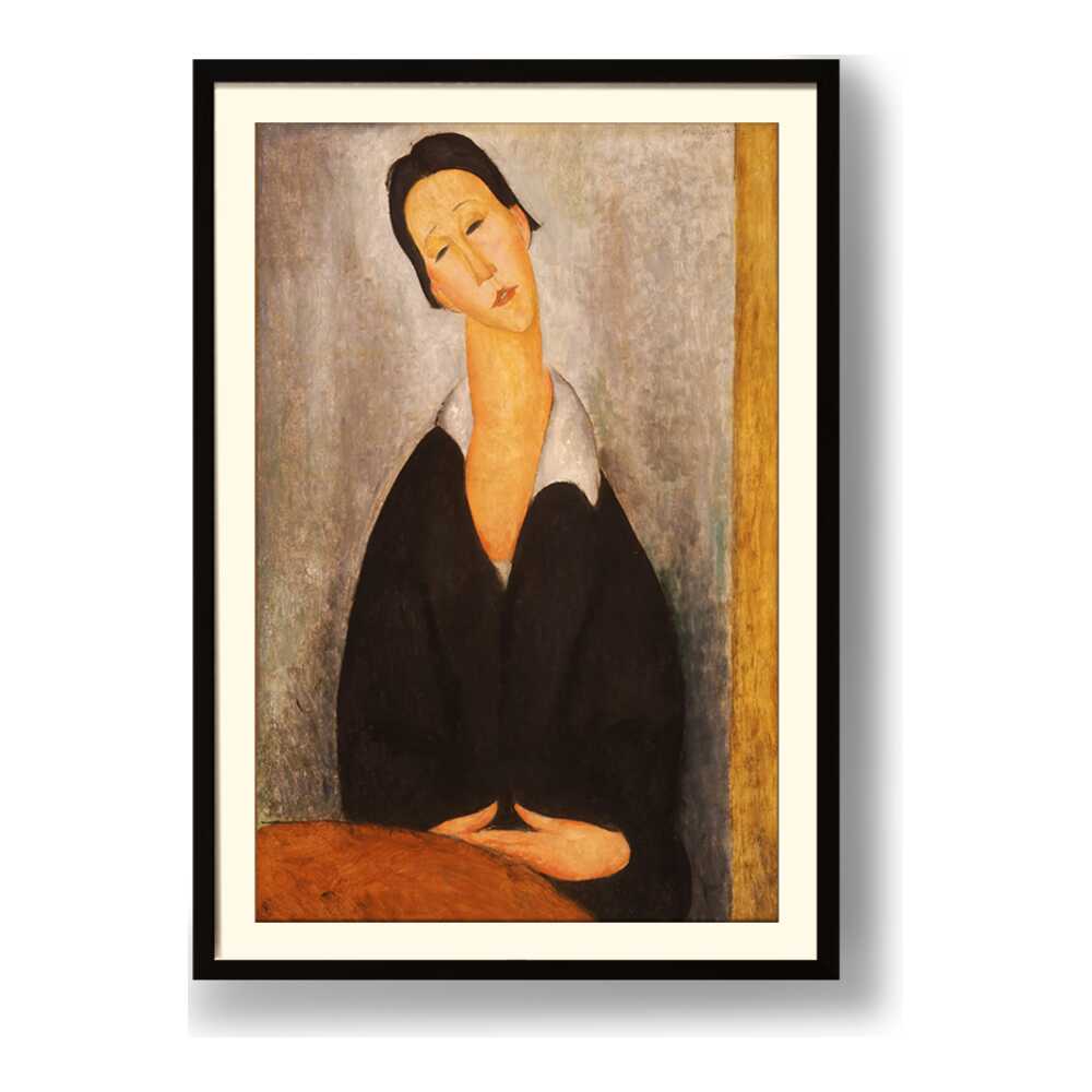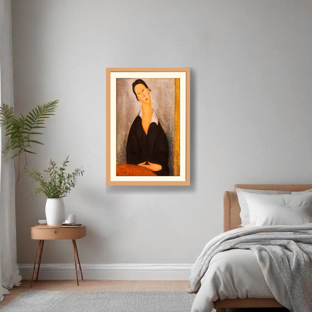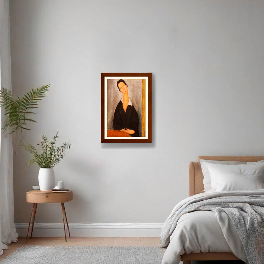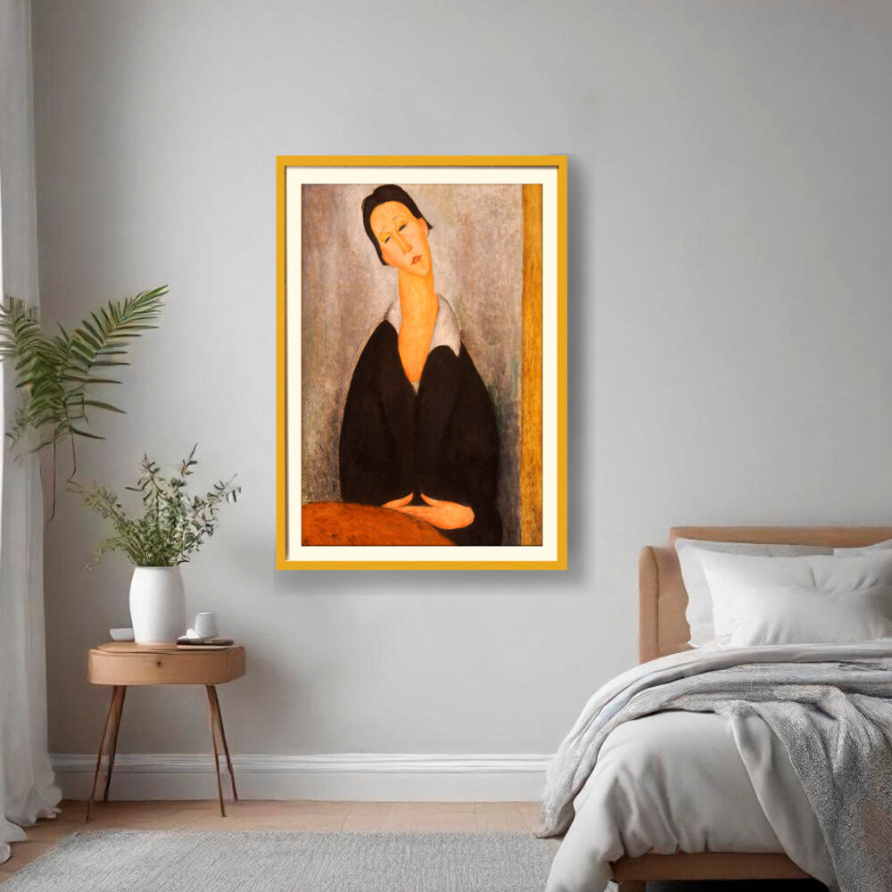 This captivating artwork features a woman dressed in black, depicted with elongated features and a serene expression. The subtle color palette and emotional depth invite a contemplative mood, making it a perfect addition to any intimate space.