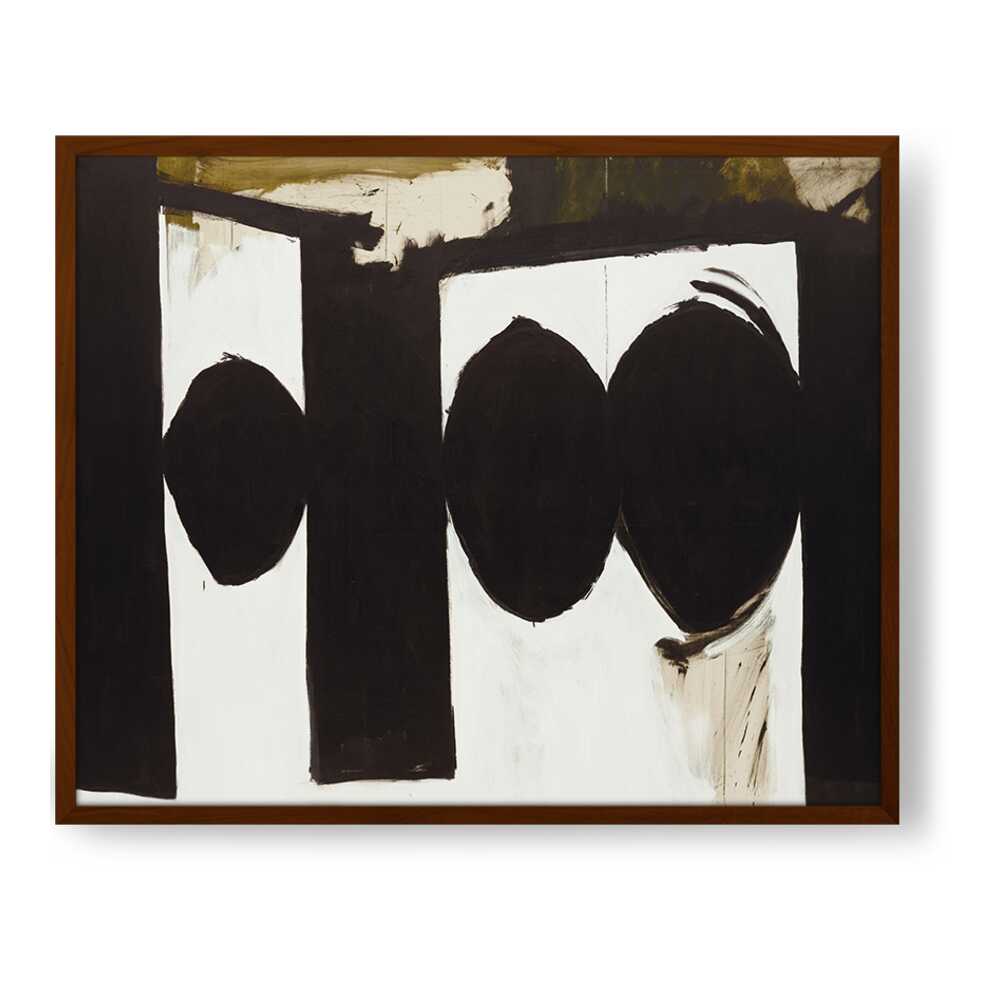 The painting features a series of black and white forms that evoke a sense of mourning and...