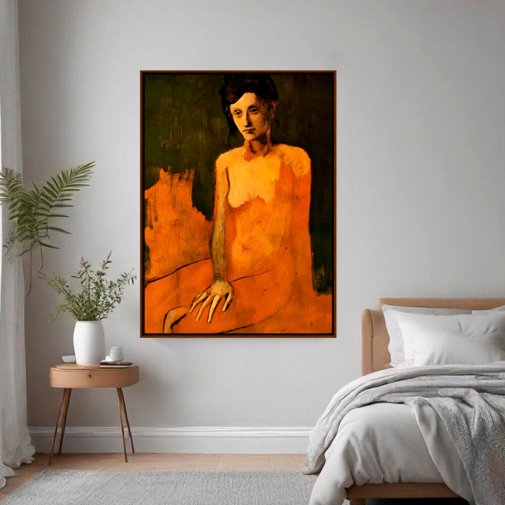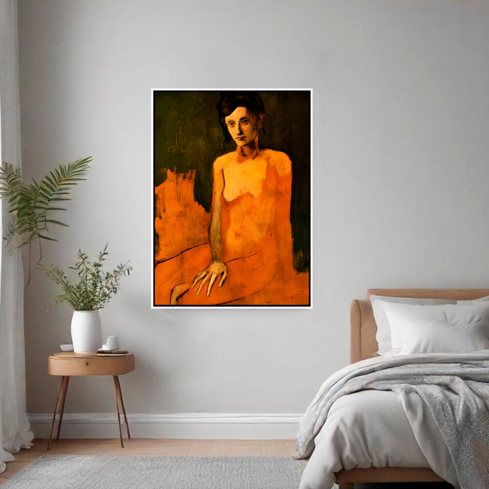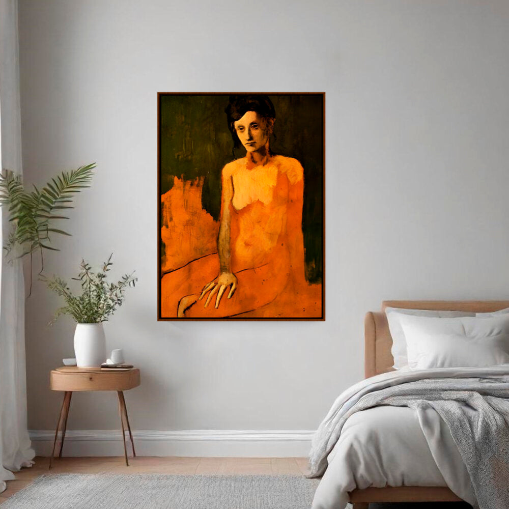 This evocative oil painting features a contemplative figure, capturing the essence of introspection and vulnerability. The warm orange tones contrast with a dark background, creating a striking visual that enhances its emotional depth.