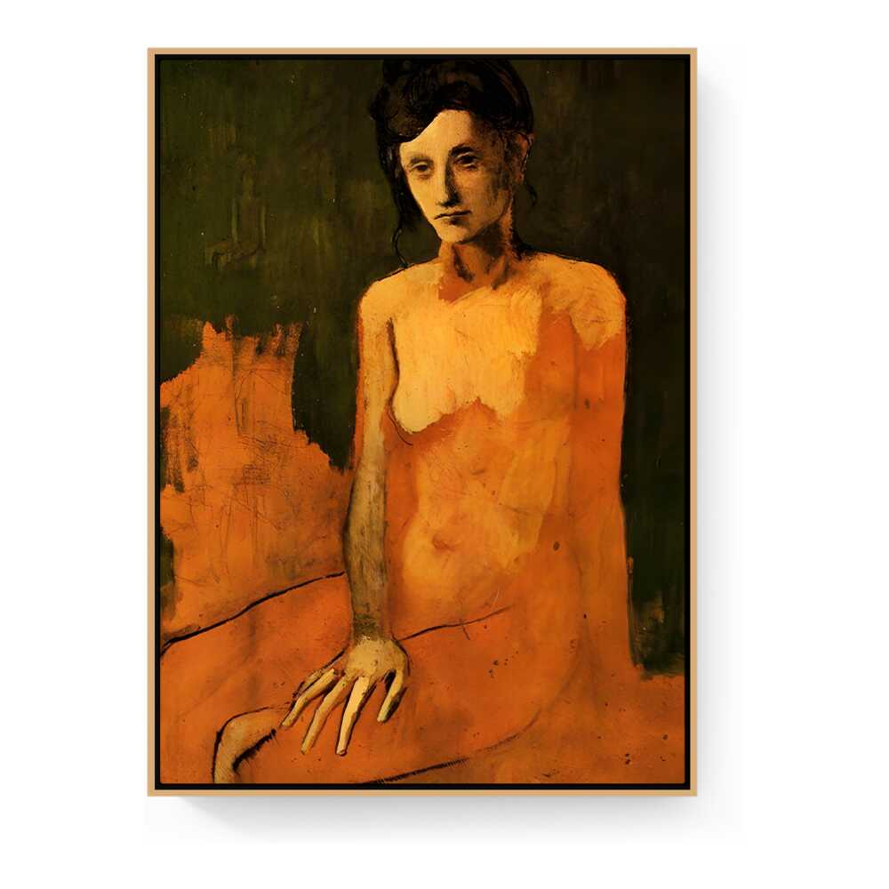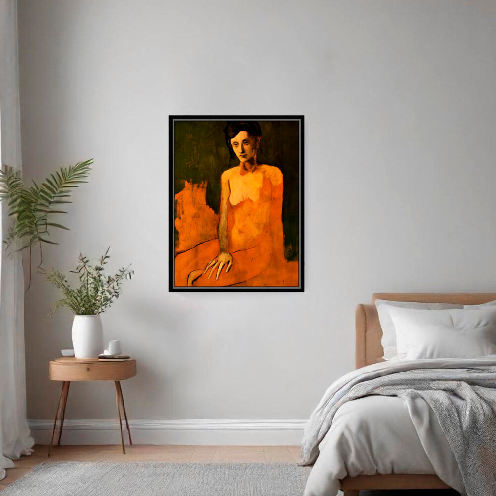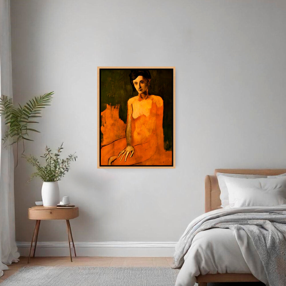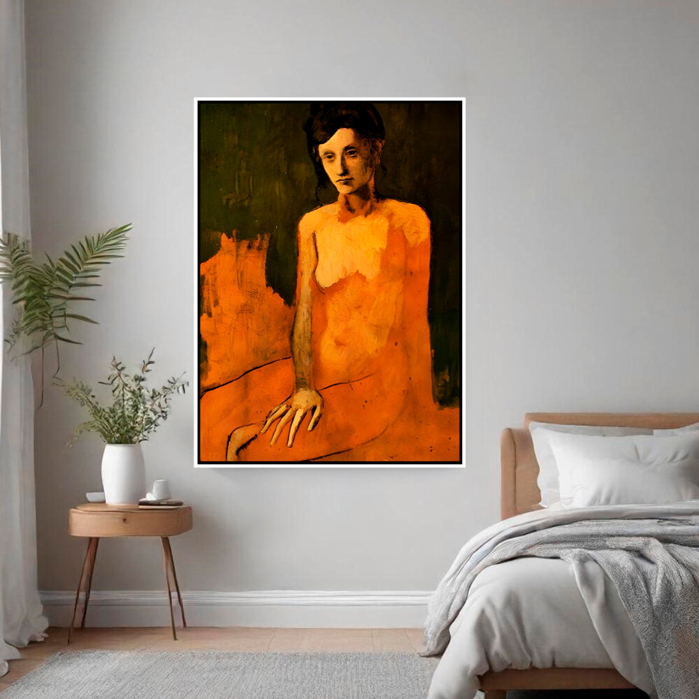 This evocative oil painting features a contemplative figure, capturing the essence of introspection and vulnerability. The warm orange tones contrast with a dark background, creating a striking visual that enhances its emotional depth.