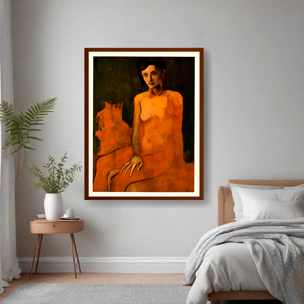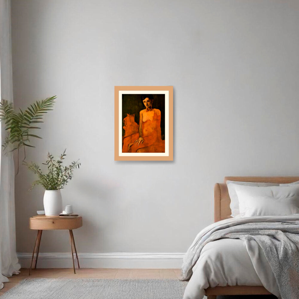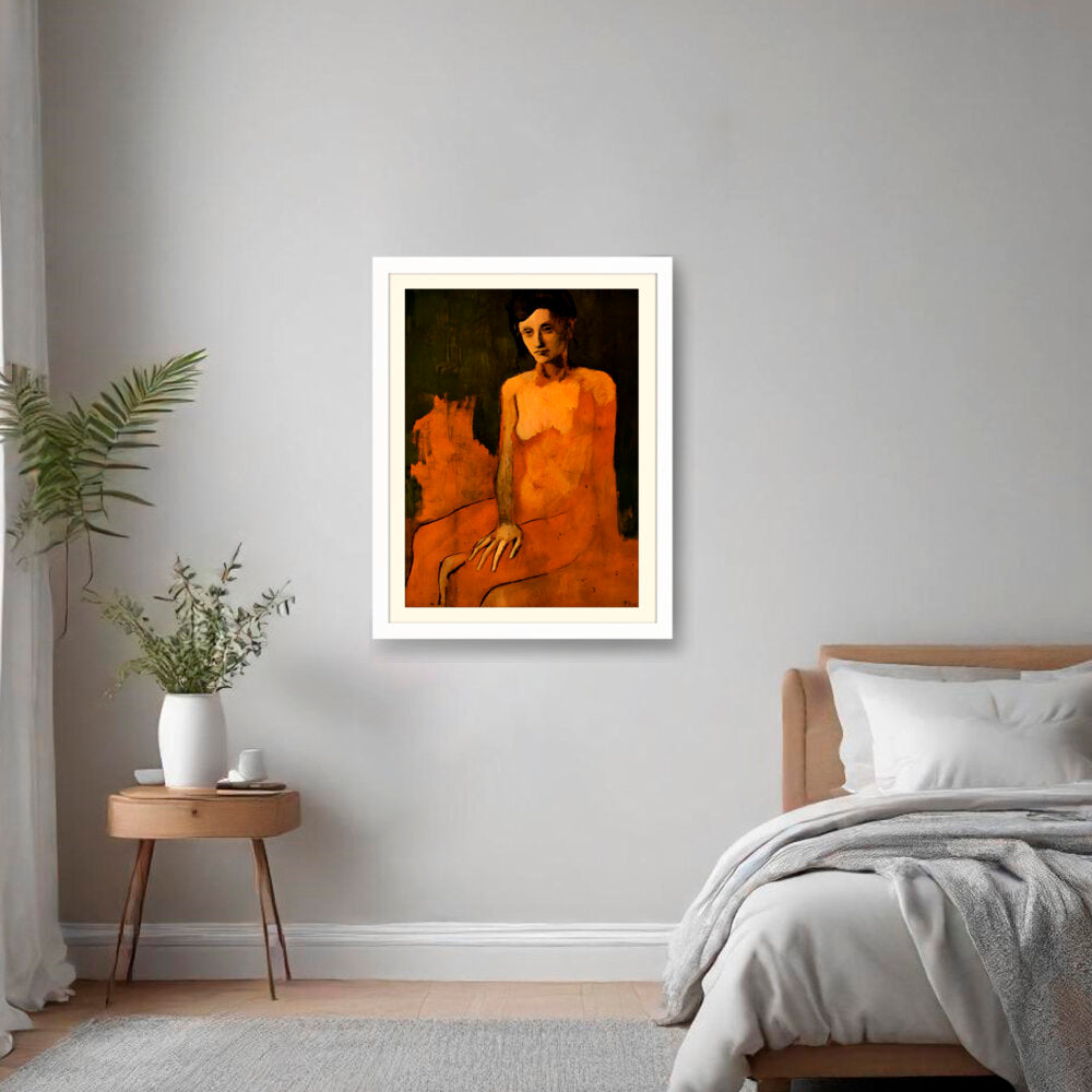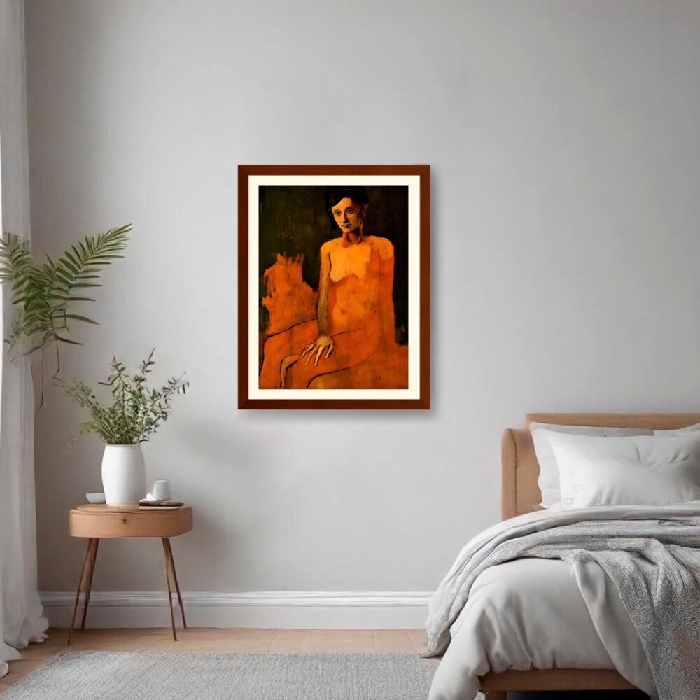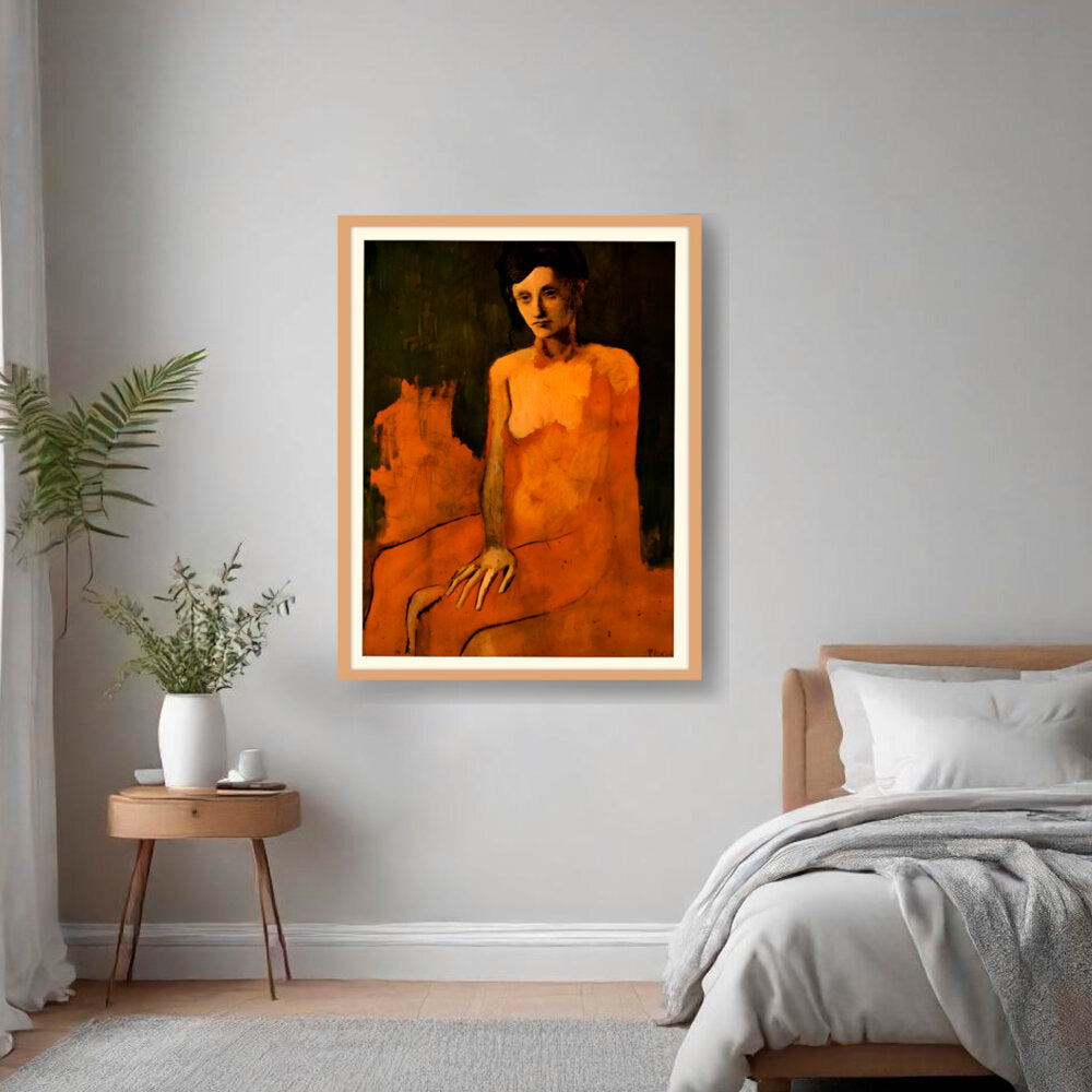 This evocative oil painting features a contemplative figure, capturing the essence of introspection and vulnerability. The warm orange tones contrast with a dark background, creating a striking visual that enhances its emotional depth.