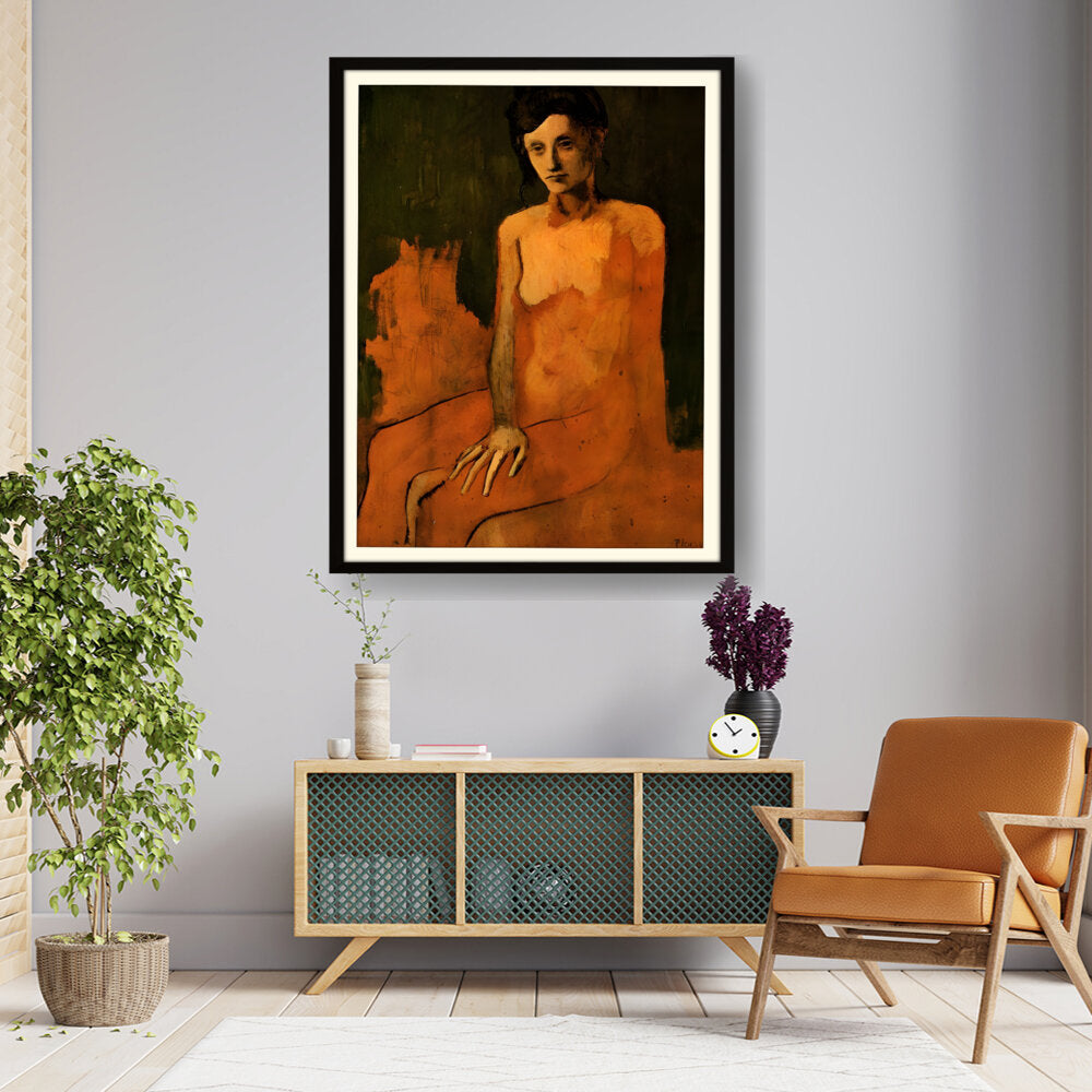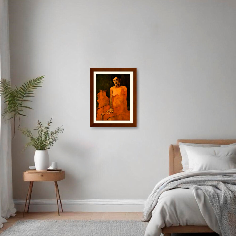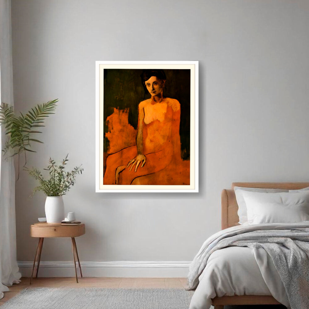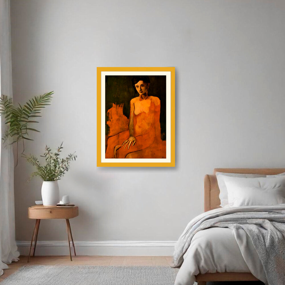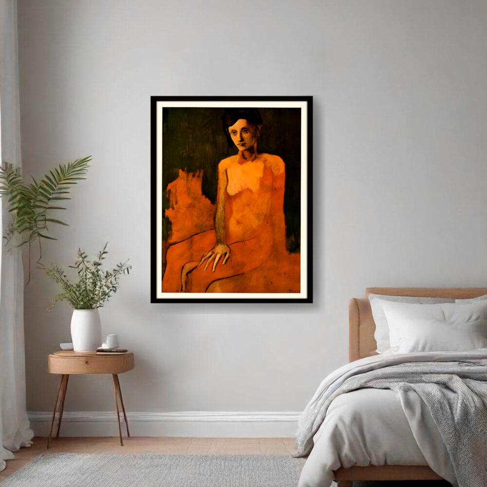 This evocative oil painting features a contemplative figure, capturing the essence of introspection and vulnerability. The warm orange tones contrast with a dark background, creating a striking visual that enhances its emotional depth.