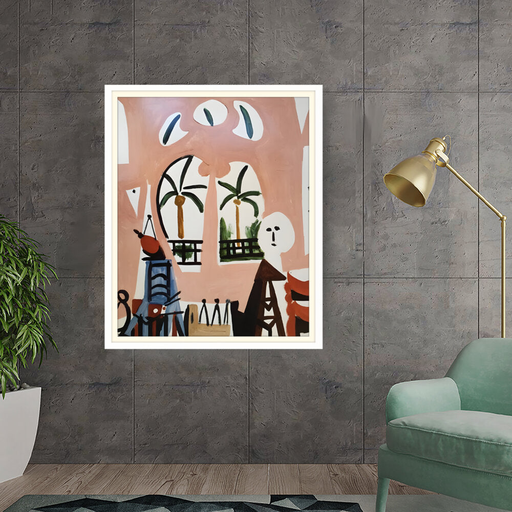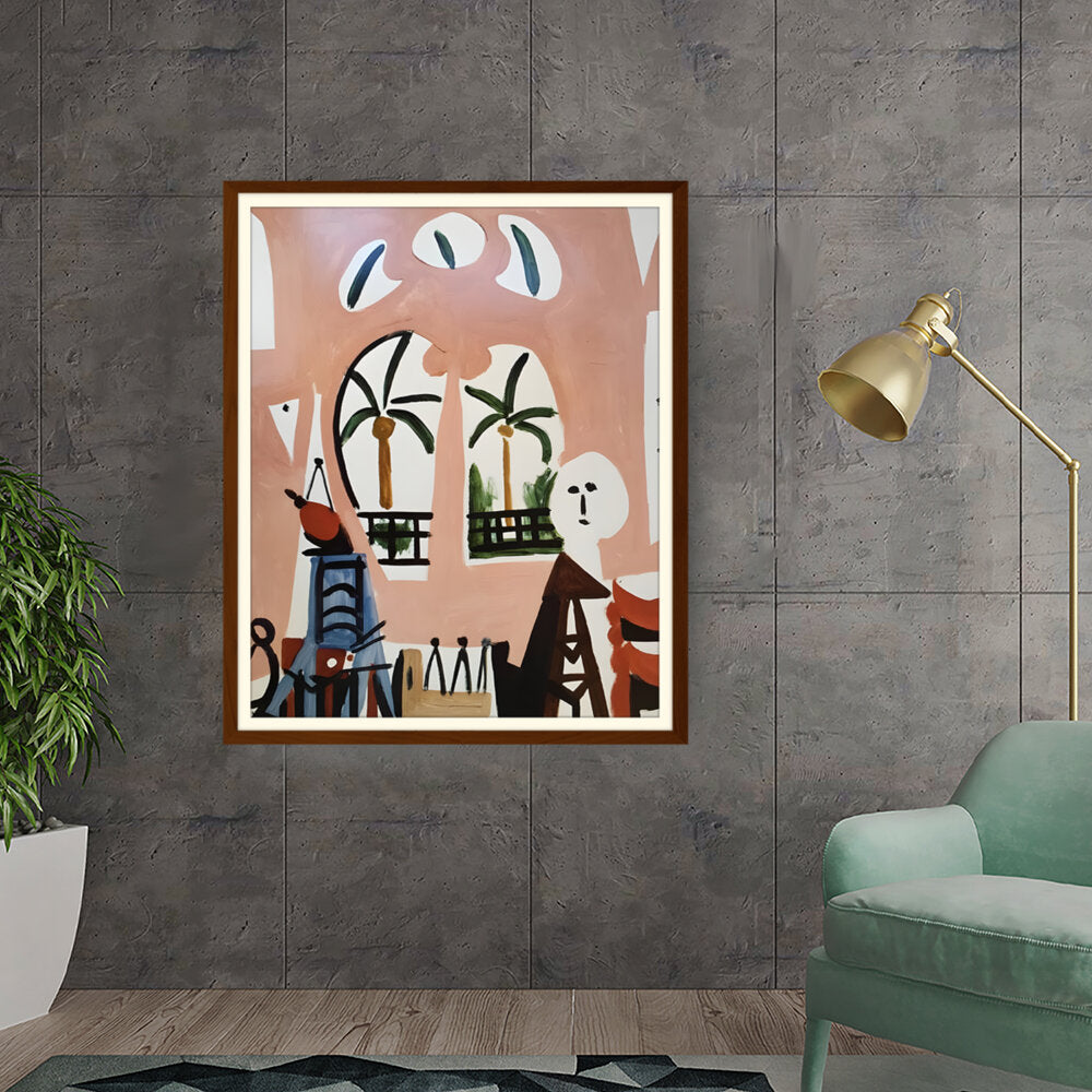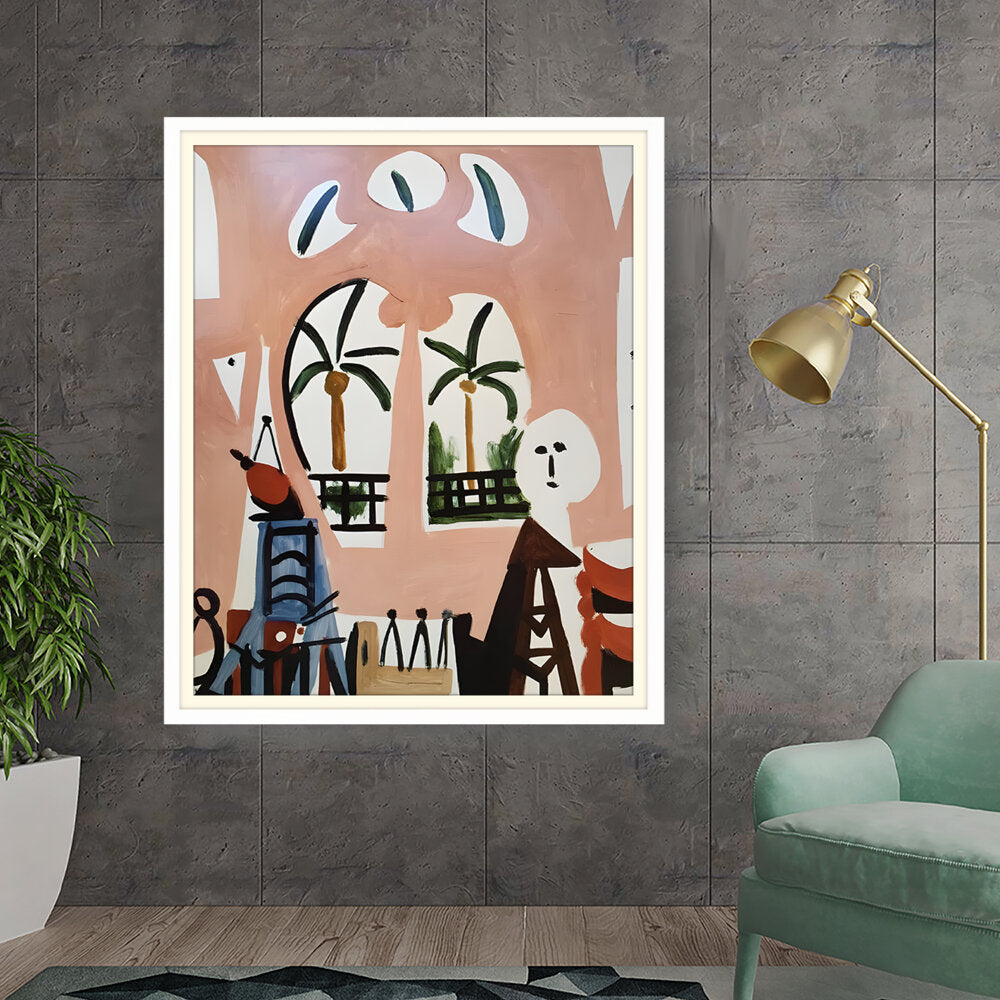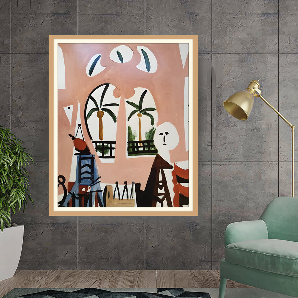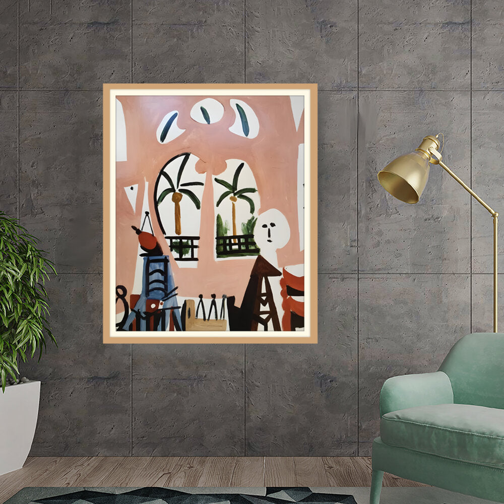 This vibrant artwork titled 'Palm View' features abstract shapes and tropical elements, perfect for adding a modern touch to any living space. The use of bold colors and dynamic forms creates an inviting atmosphere, making it ideal for creative environments.