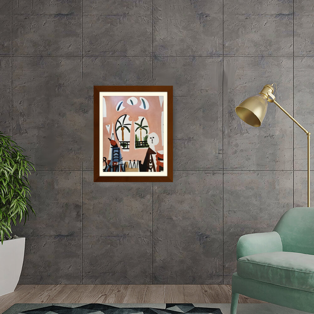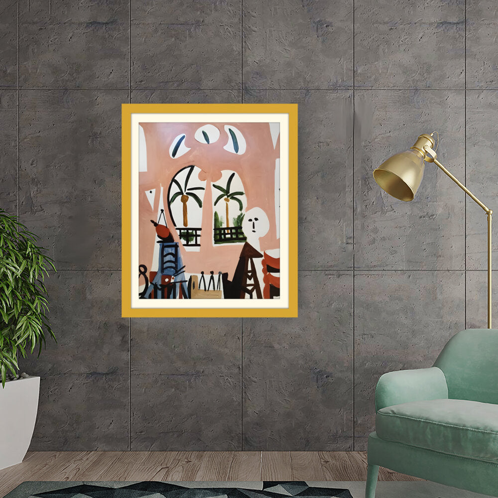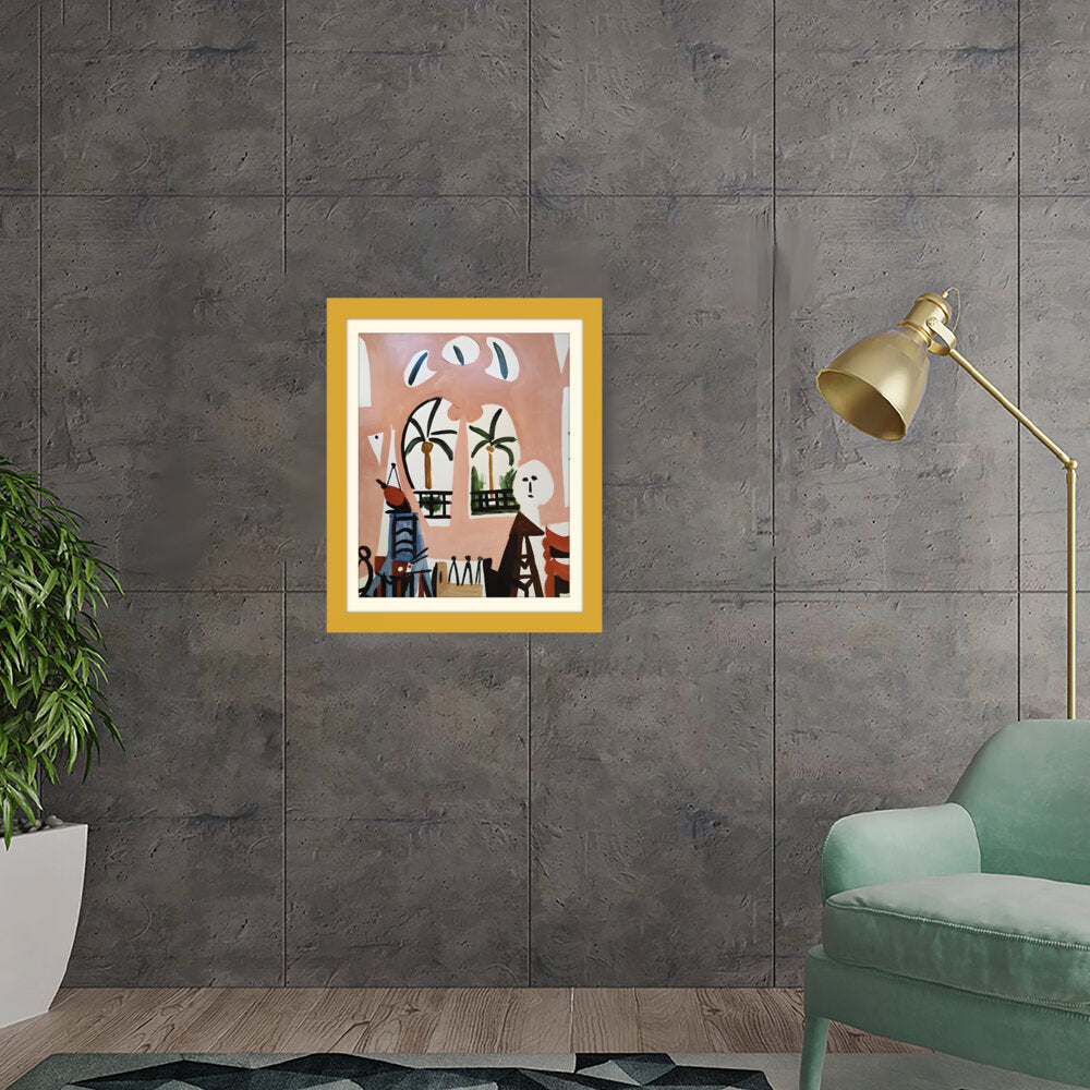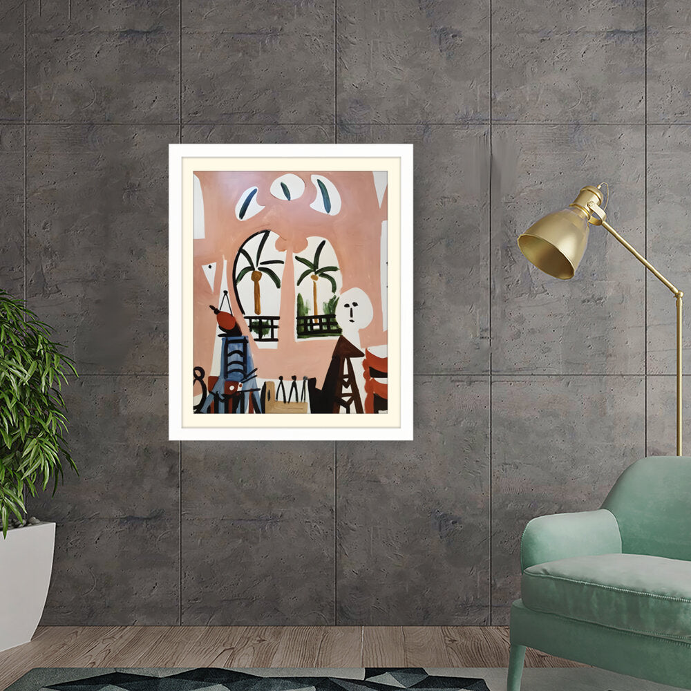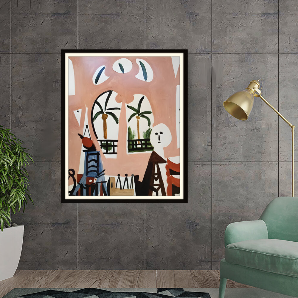 This vibrant artwork titled 'Palm View' features abstract shapes and tropical elements, perfect for adding a modern touch to any living space. The use of bold colors and dynamic forms creates an inviting atmosphere, making it ideal for creative environments.