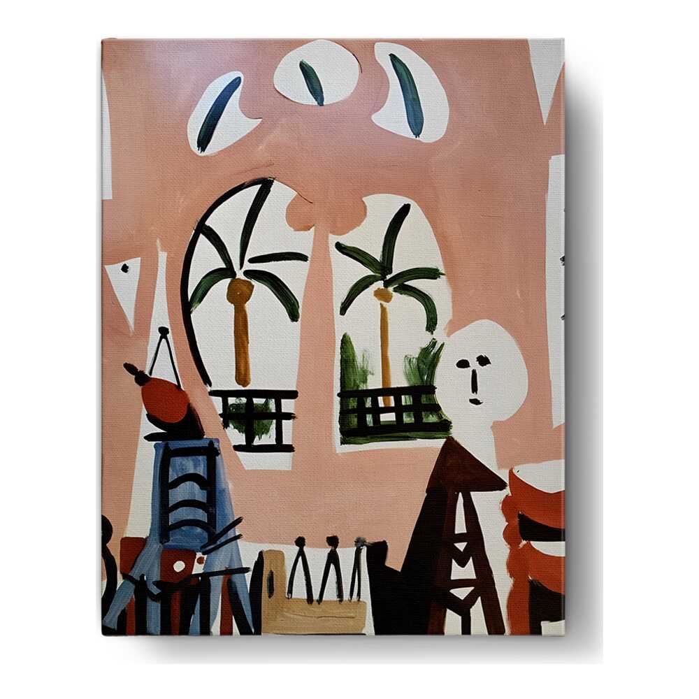 This vibrant artwork titled 'Palm View' features abstract shapes and tropical elements, perfect for adding a modern...
