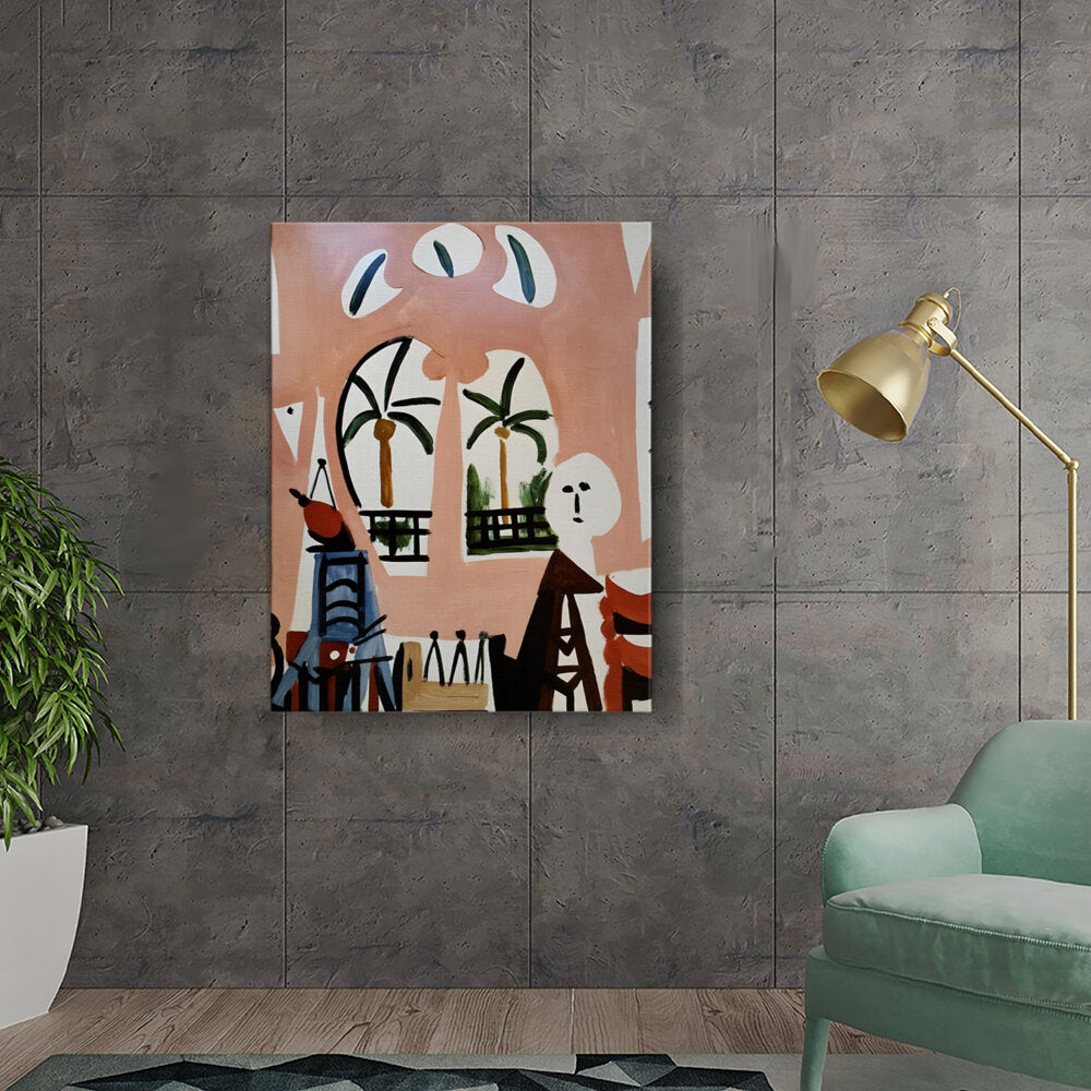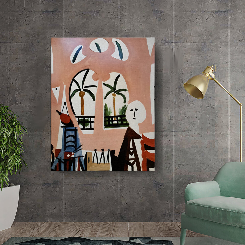 This vibrant artwork titled 'Palm View' features abstract shapes and tropical elements, perfect for adding a modern touch to any living space. The use of bold colors and dynamic forms creates an inviting atmosphere, making it ideal for creative environments.