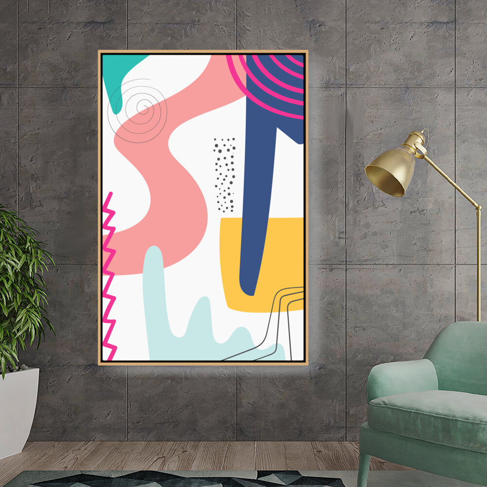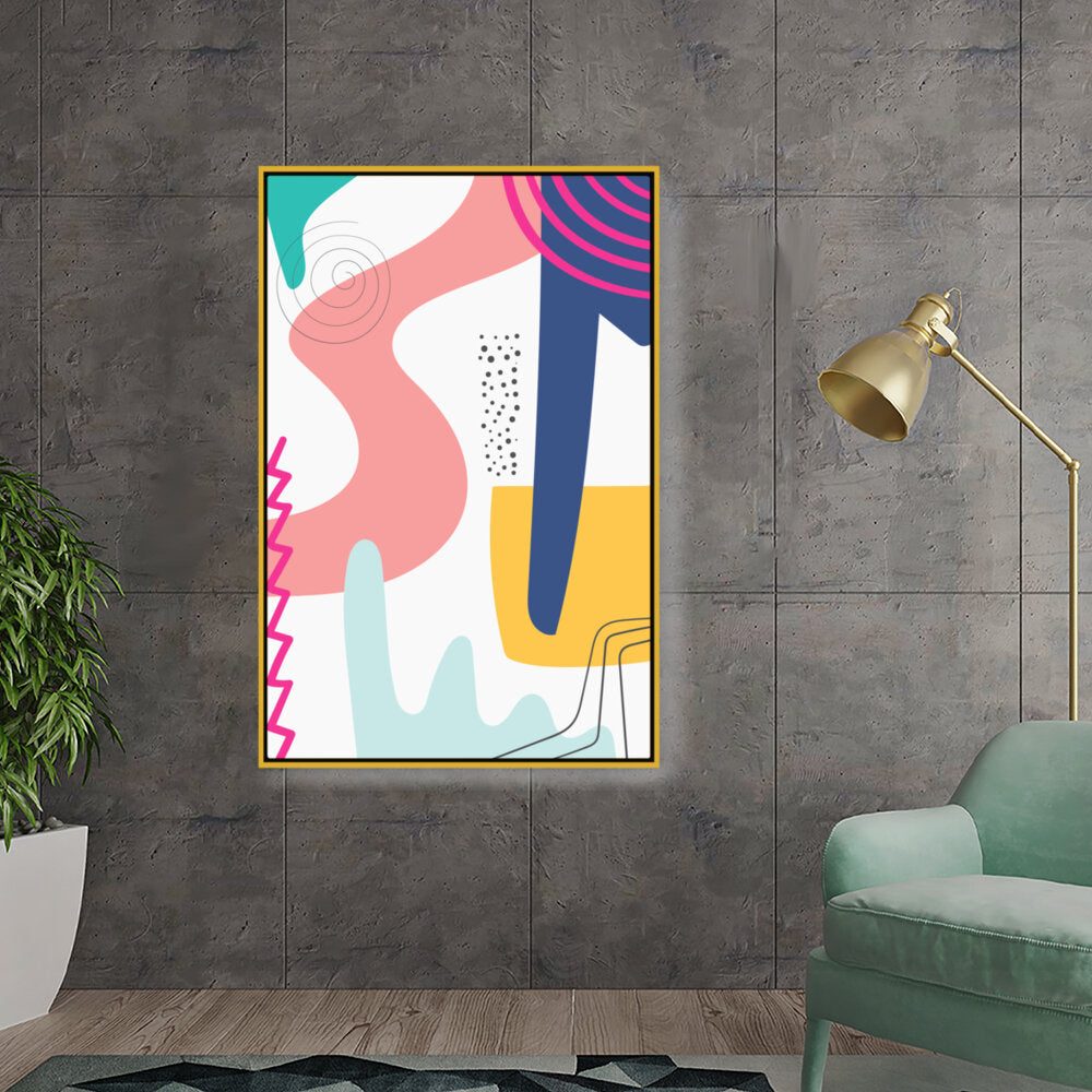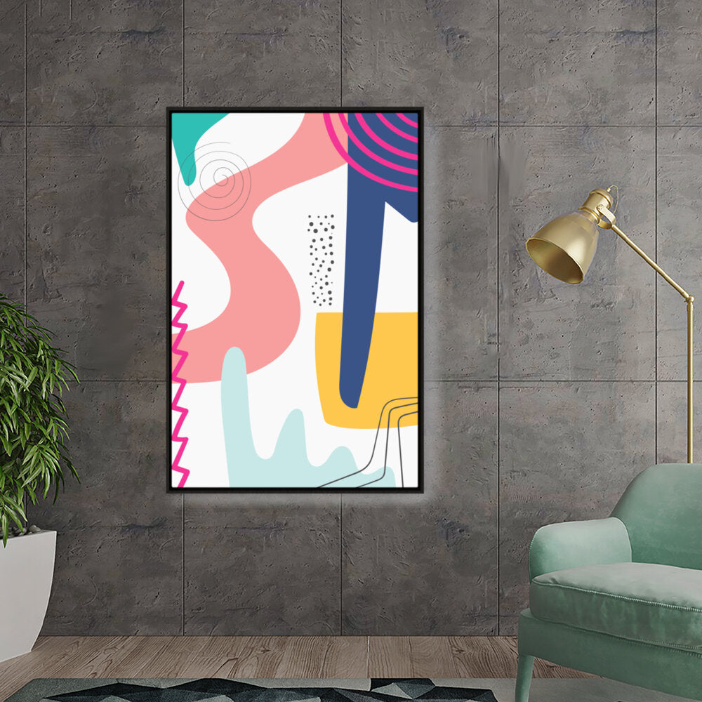 This vibrant abstract artwork features dynamic shapes and playful colors, perfect for modern spaces. Its contemporary design adds a touch of creativity and energy, making it a versatile piece for various rooms.