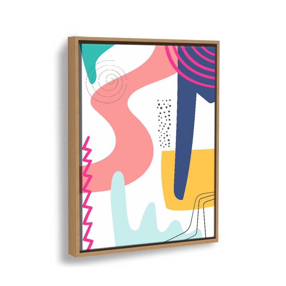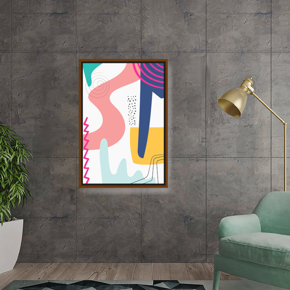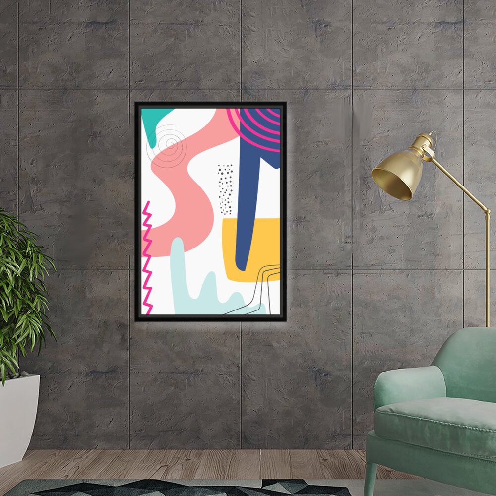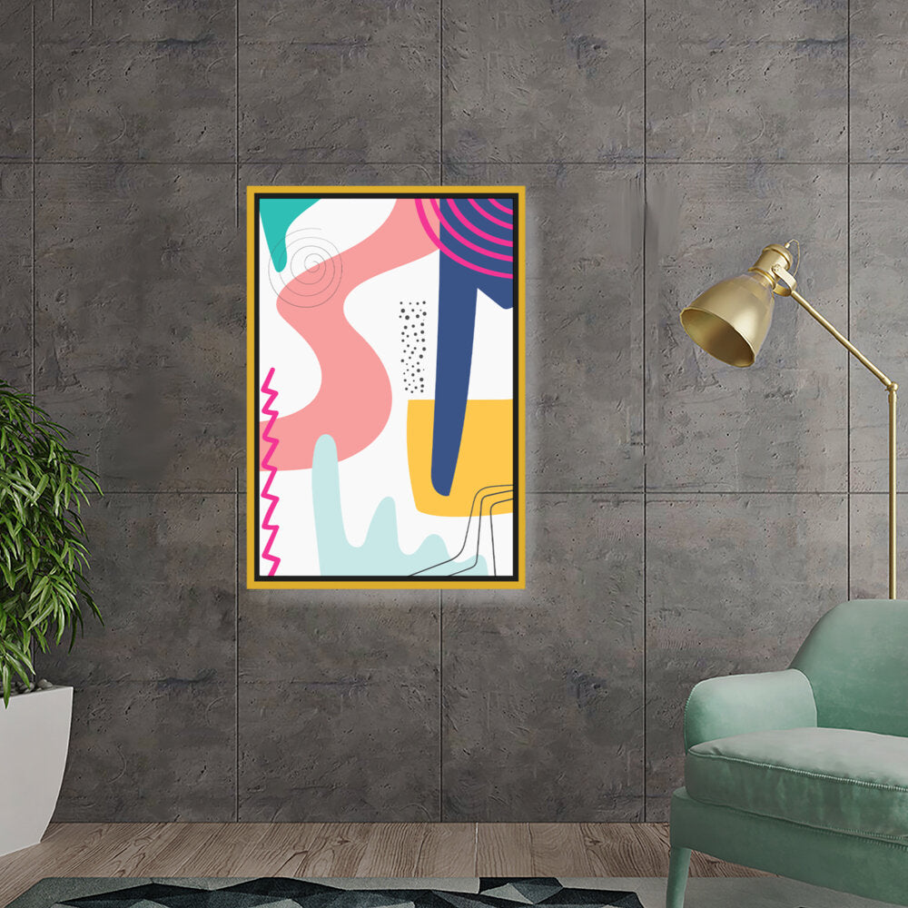 This vibrant abstract artwork features dynamic shapes and playful colors, perfect for modern spaces. Its contemporary design adds a touch of creativity and energy, making it a versatile piece for various rooms.