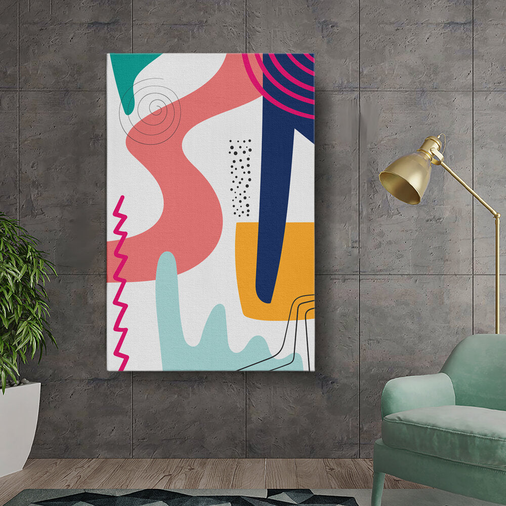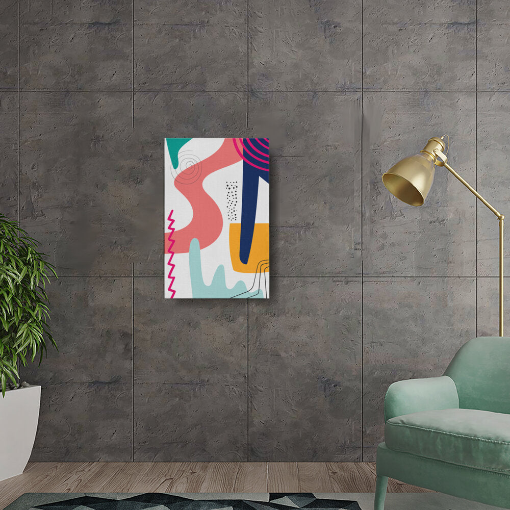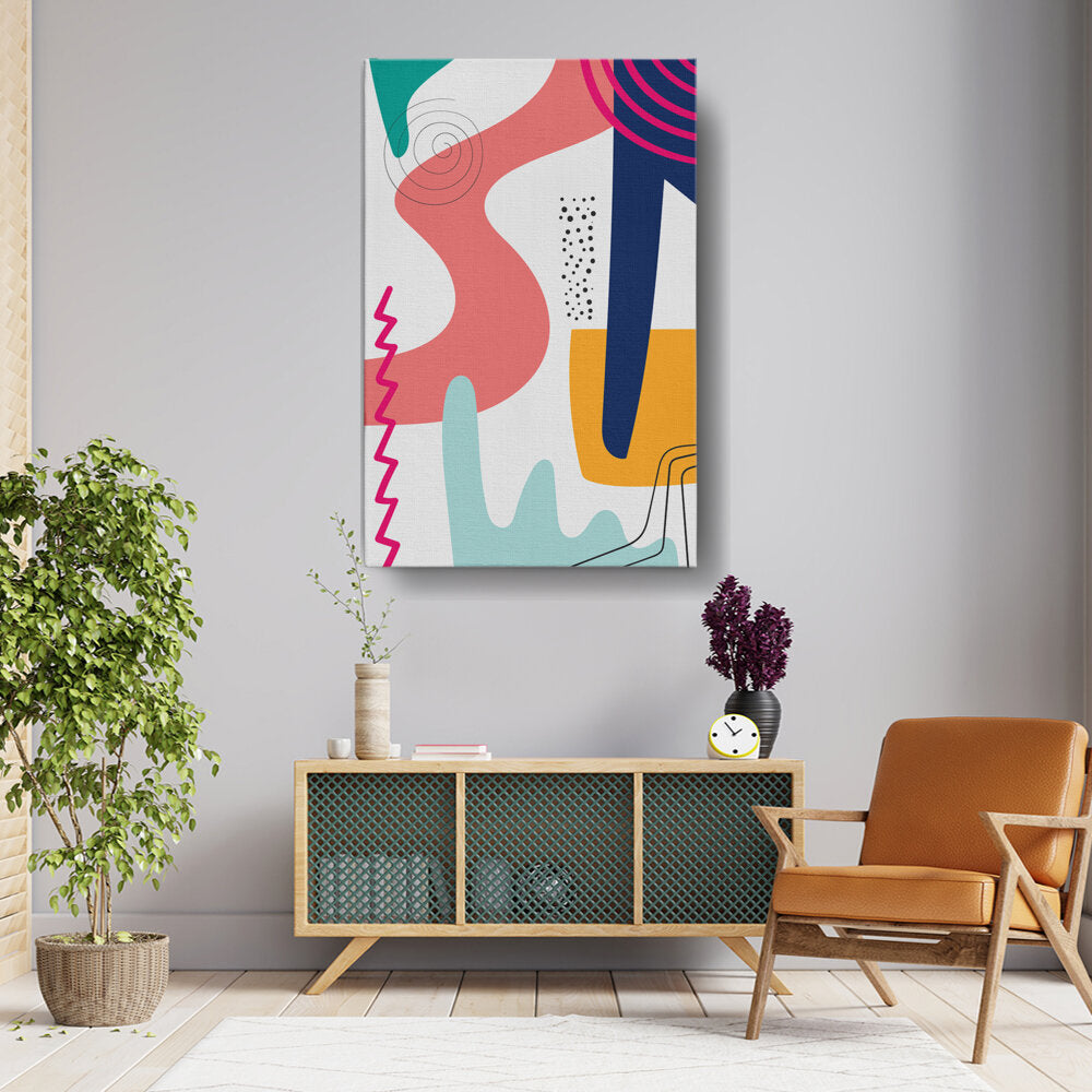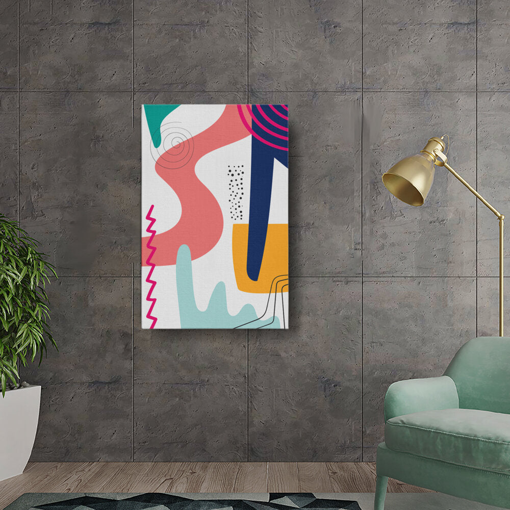 This vibrant abstract artwork features dynamic shapes and playful colors, perfect for modern spaces. Its contemporary design adds a touch of creativity and energy, making it a versatile piece for various rooms.