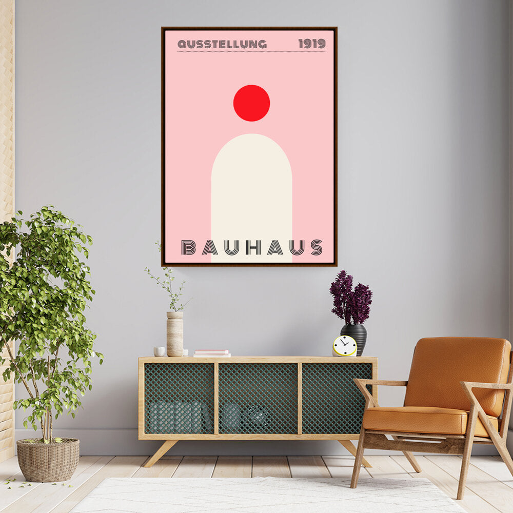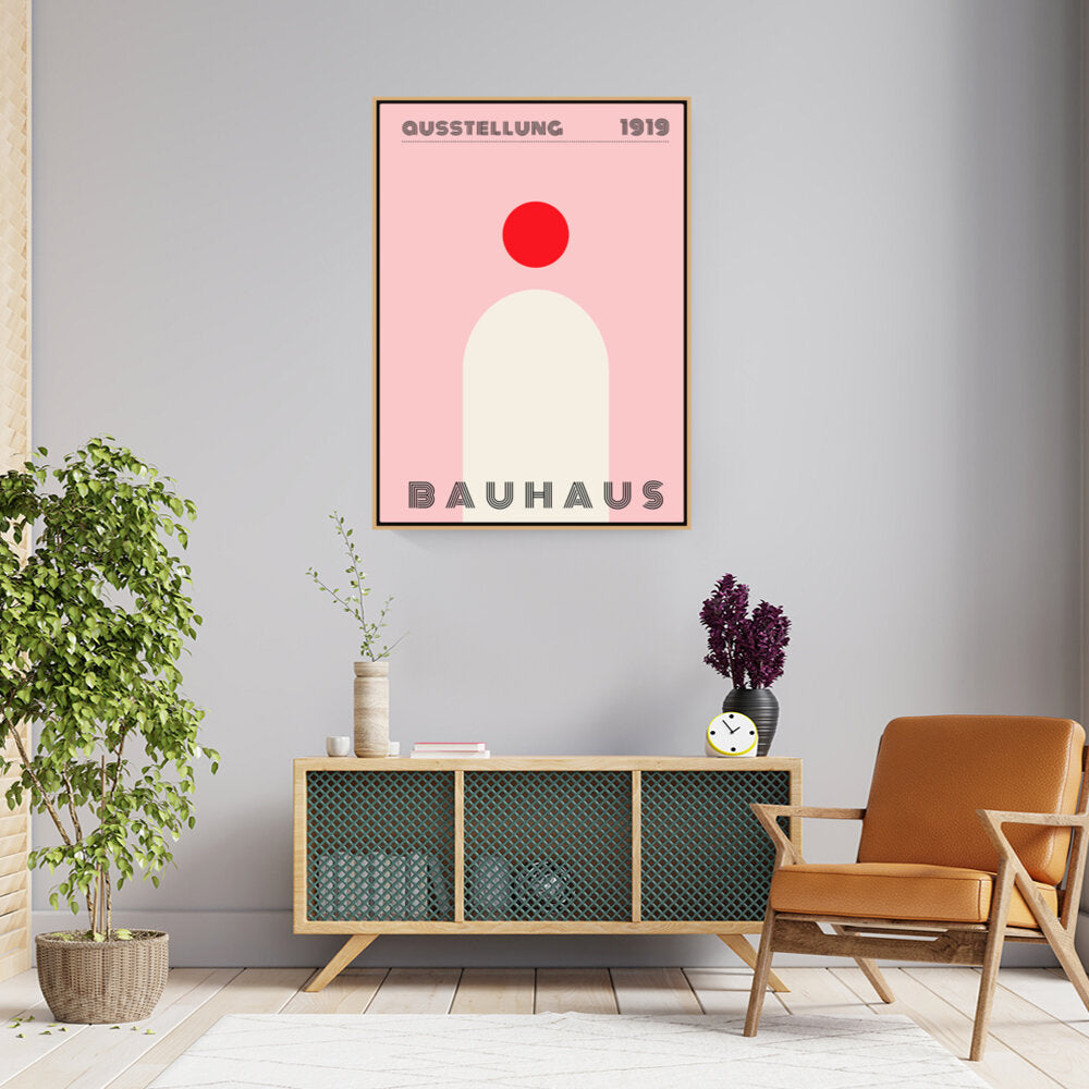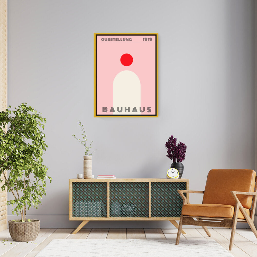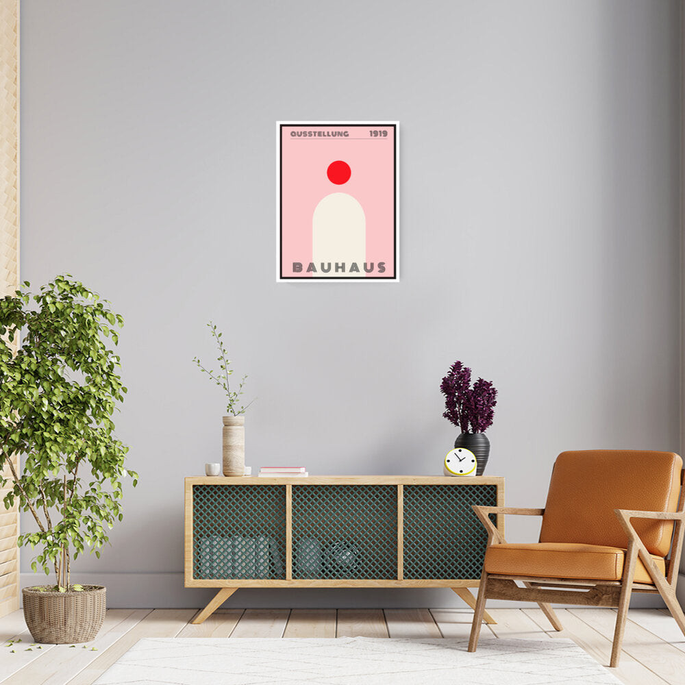 This striking Bauhaus exhibition poster from 1919 combines bold geometric shapes with a minimalist aesthetic. Its pink background and contrasting colors emphasize the influential design philosophy of the era, making it a perfect addition to modern creative spaces.