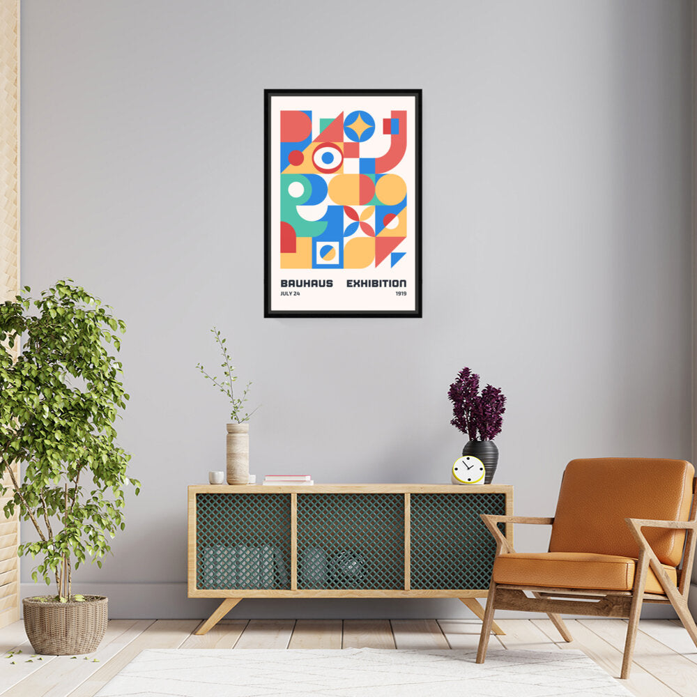 This vibrant digital illustration showcases geometric shapes and a modern color palette, commemorating the Bauhaus exhibition of 1919. Perfect for creative spaces, it embodies the spirit of innovation and artistic expression inherent to the Bauhaus movement.