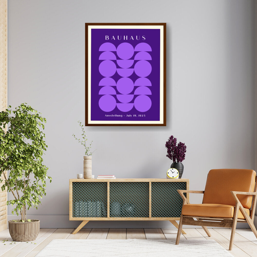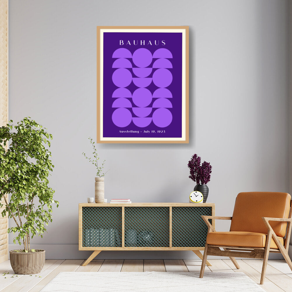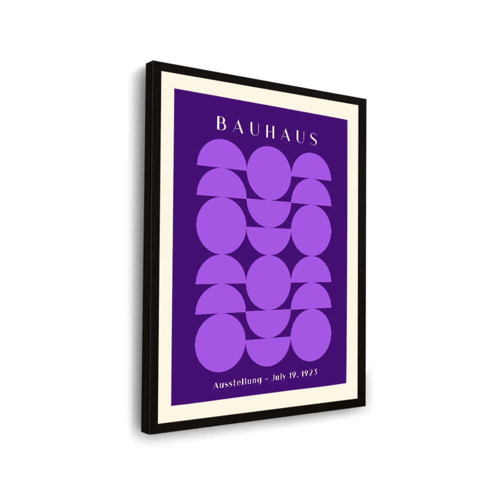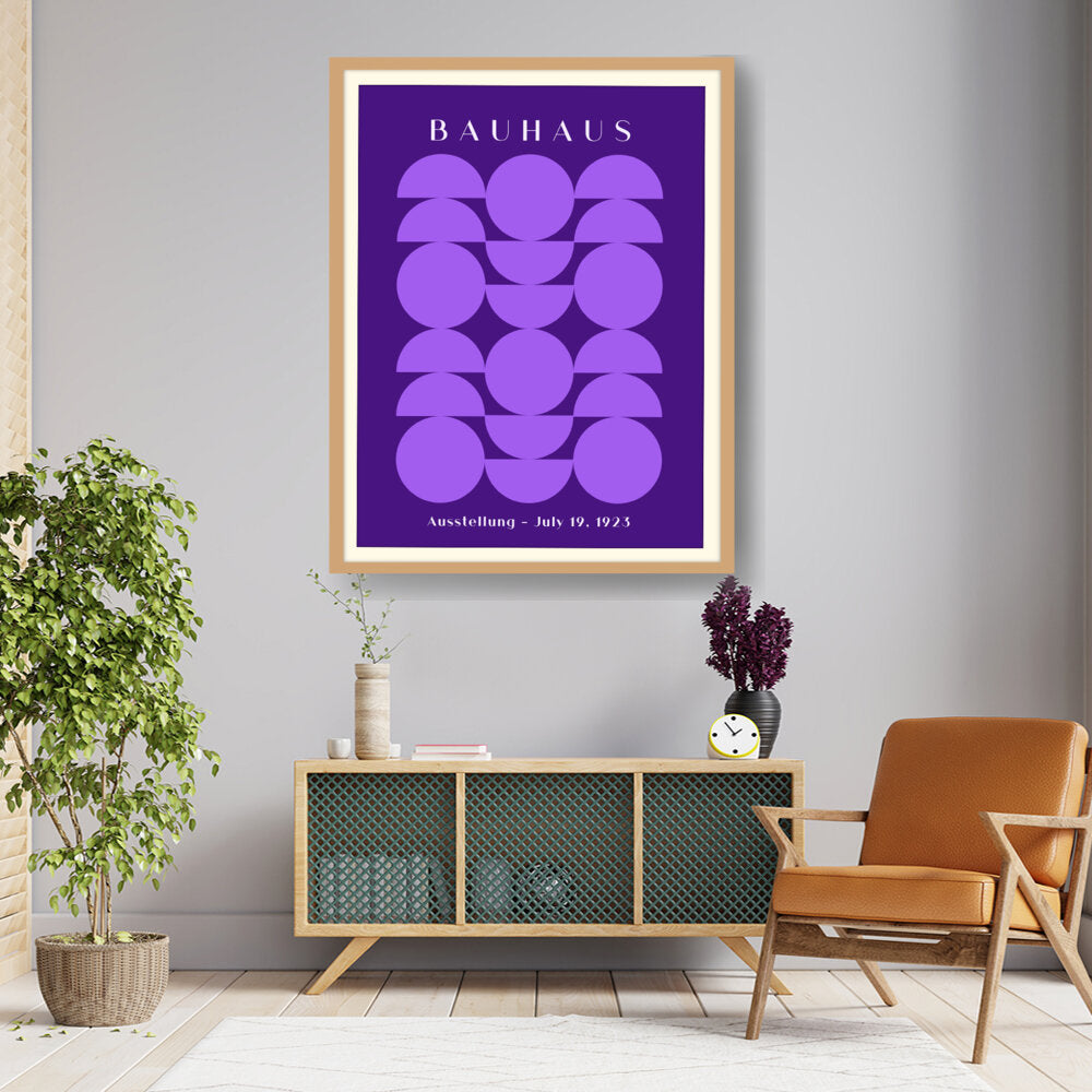 This Bauhaus exhibition poster features bold geometric shapes in vibrant purple, encapsulating the essence of modern design. The artwork reflects the pioneering spirit of the Bauhaus movement, making it a striking addition to any contemporary space.